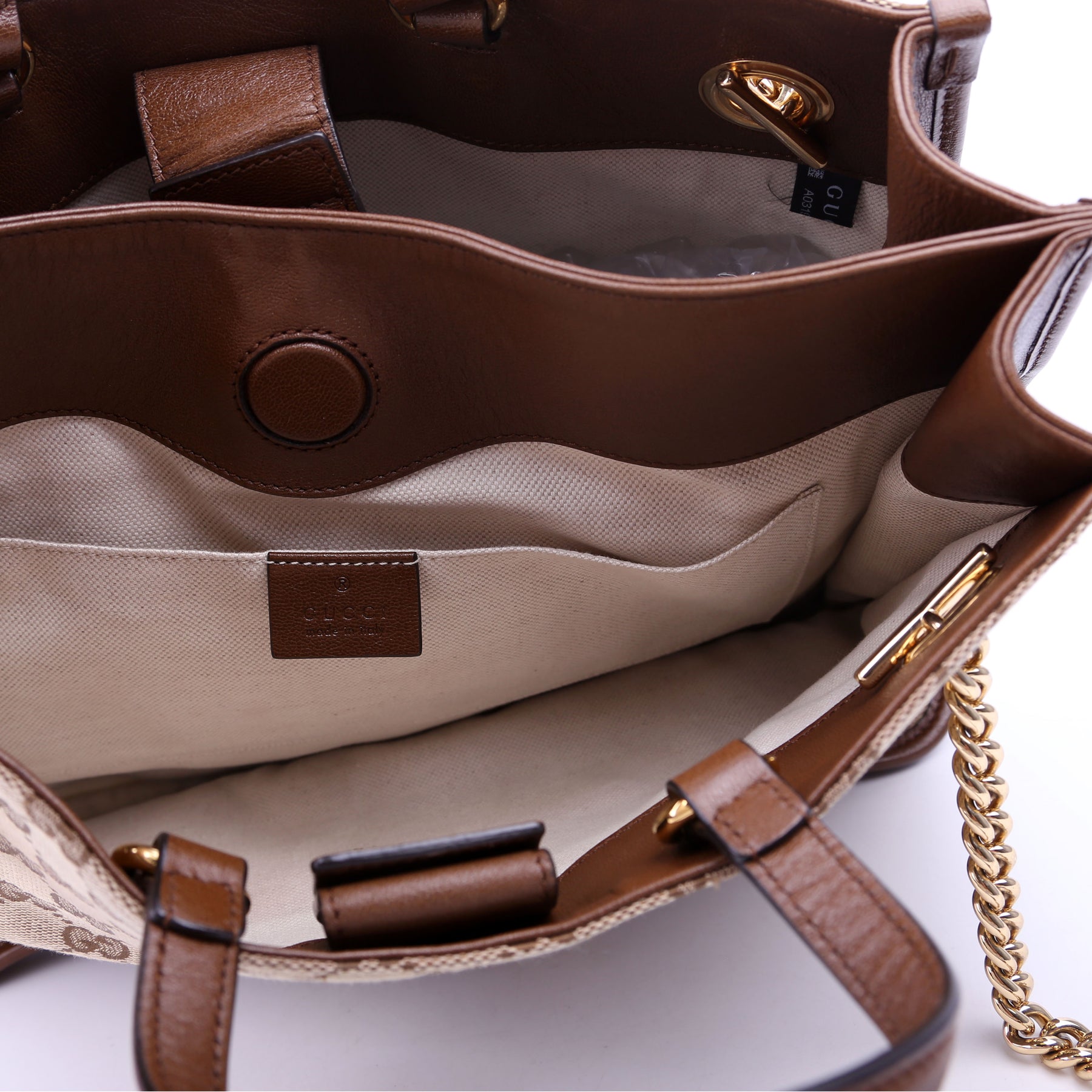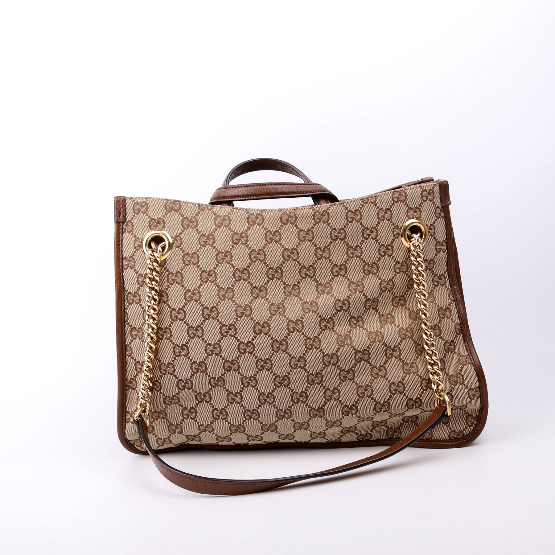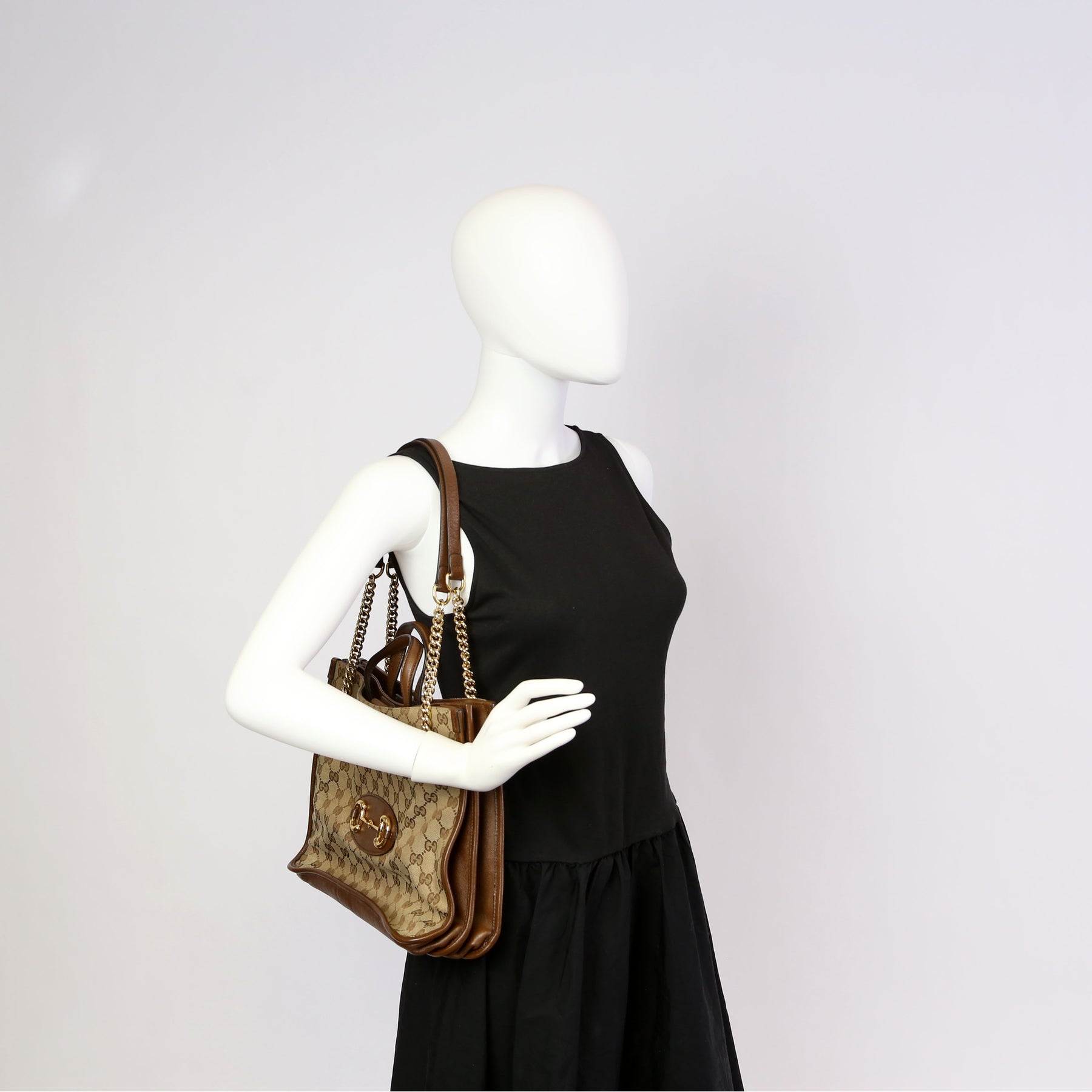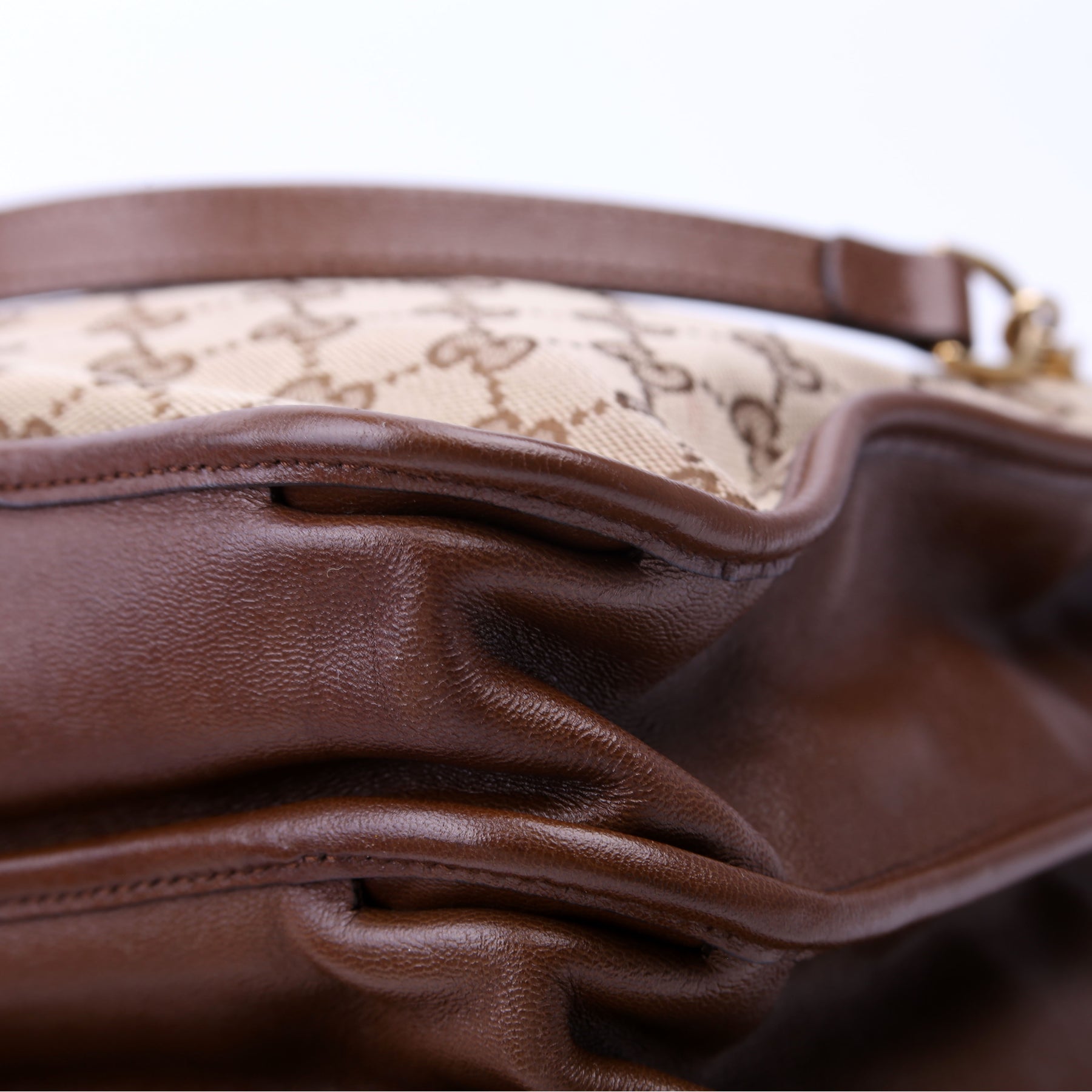 This pre-owned Gucci 1955 Horsebit Large Tote is guaranteed 100% authentic. The exterior is in the classic Gucci GG canvas.