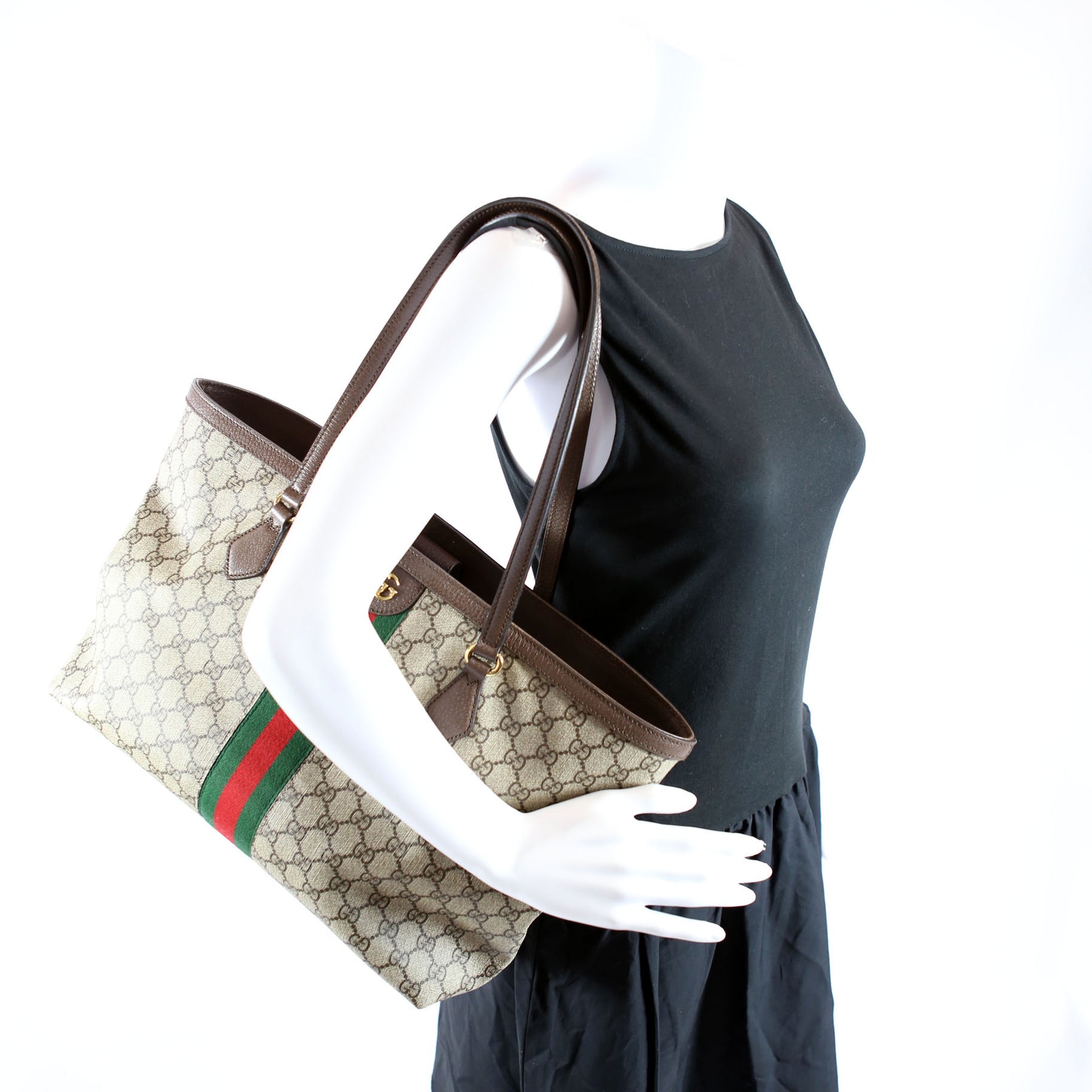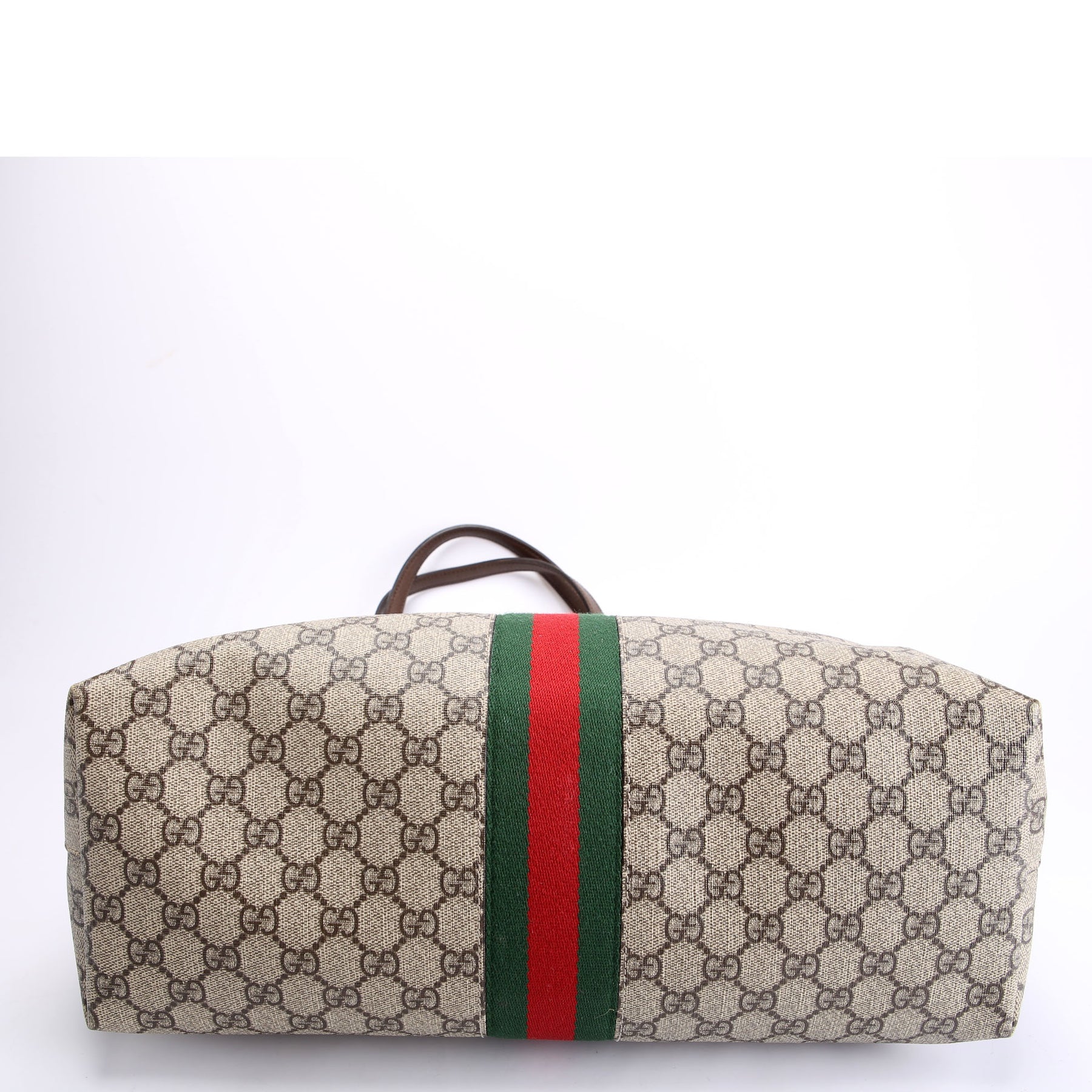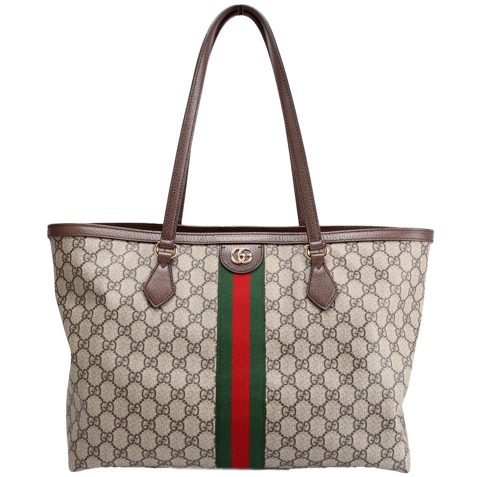 This pre-owned Gucci Ophidia Tote is guaranteed 100% authentic. The exterior is in the classic Gucci Supreme Coated Canvas