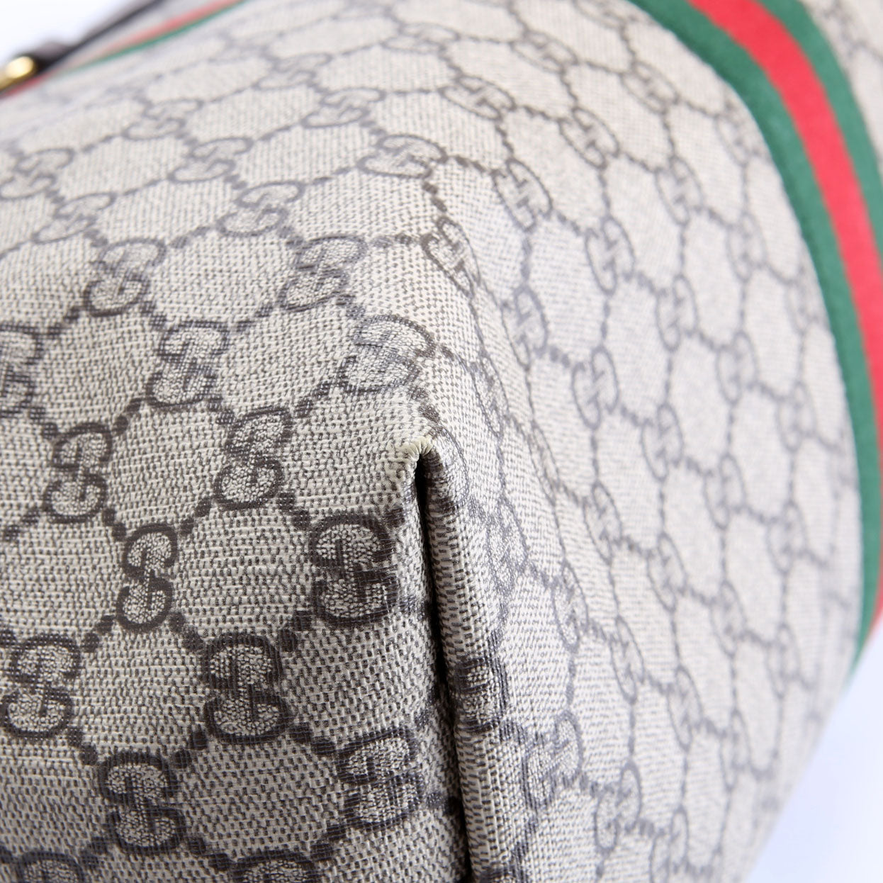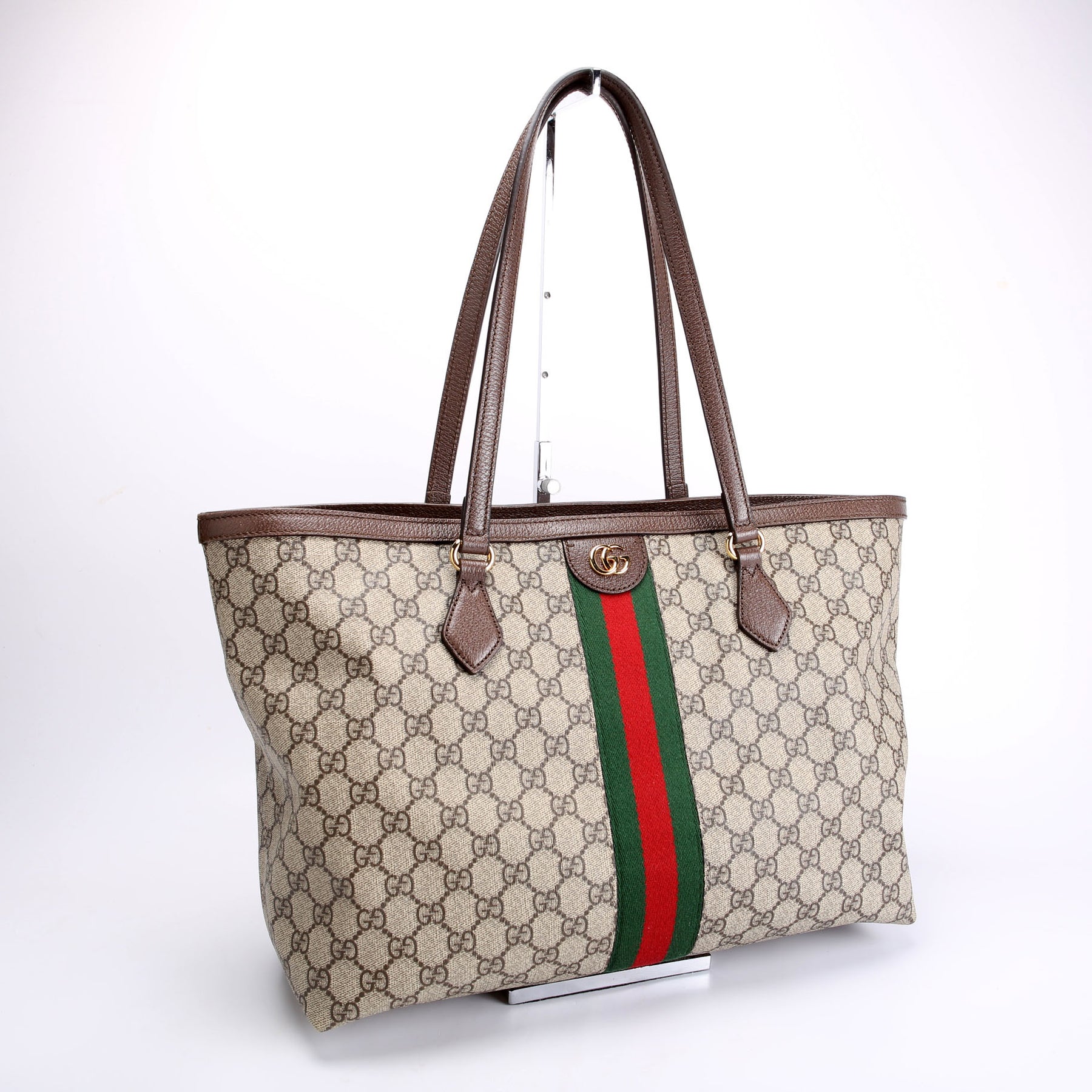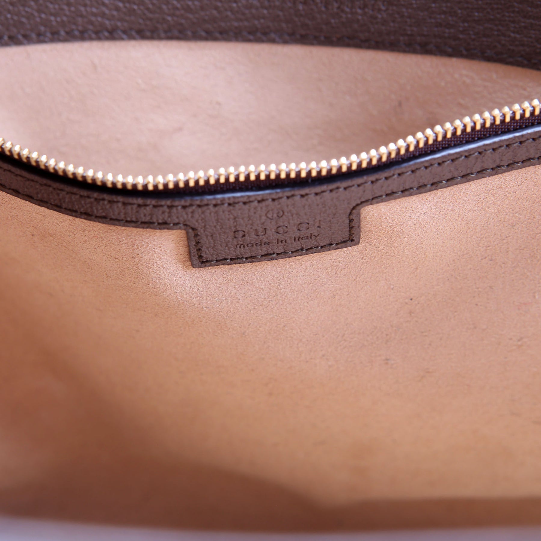 This pre-owned Gucci Ophidia Tote is guaranteed 100% authentic. The exterior is in the classic Gucci Supreme Coated Canvas