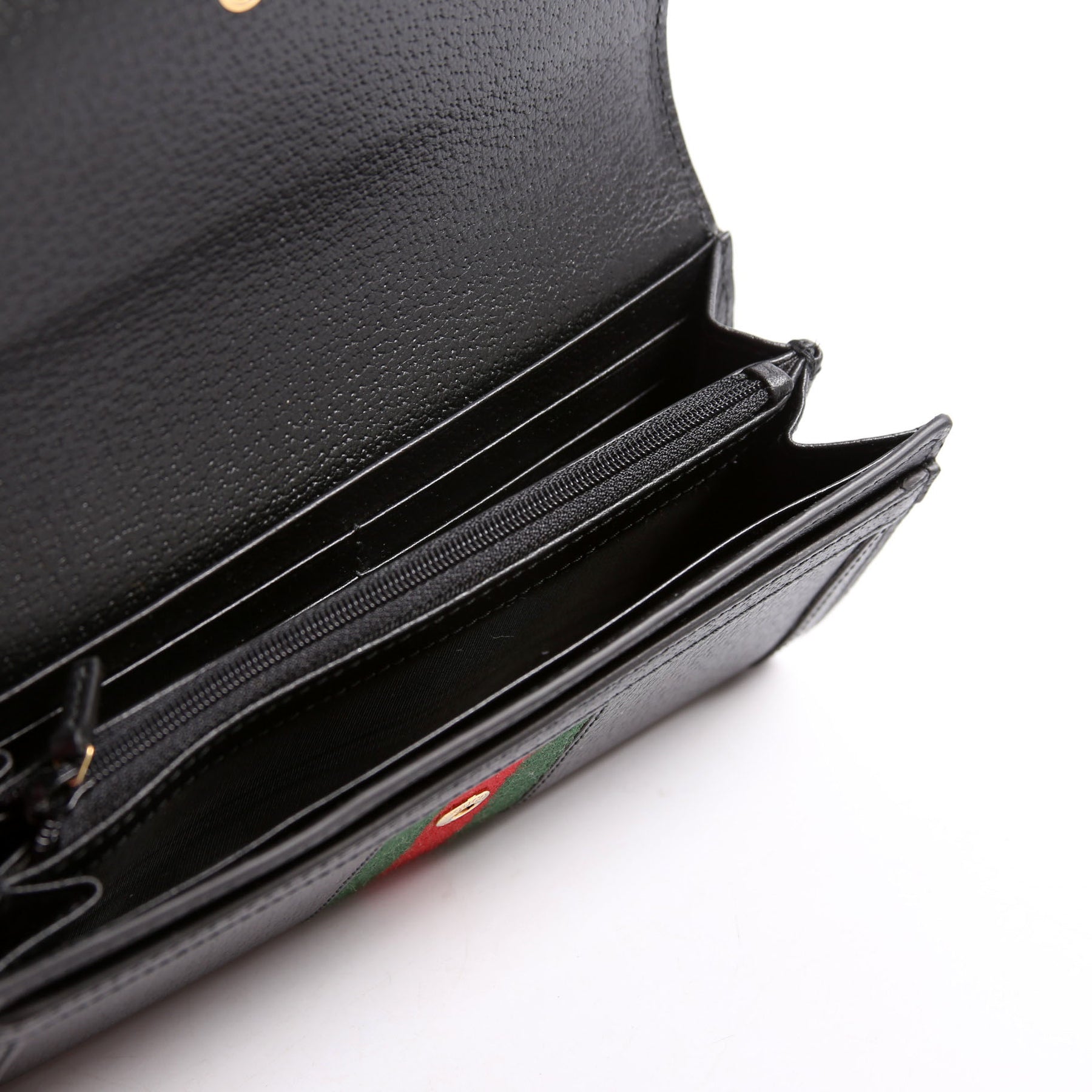 Interior: The interior is free from wear. It features twelve card slots, two open pockets, and one zip closure pocket.