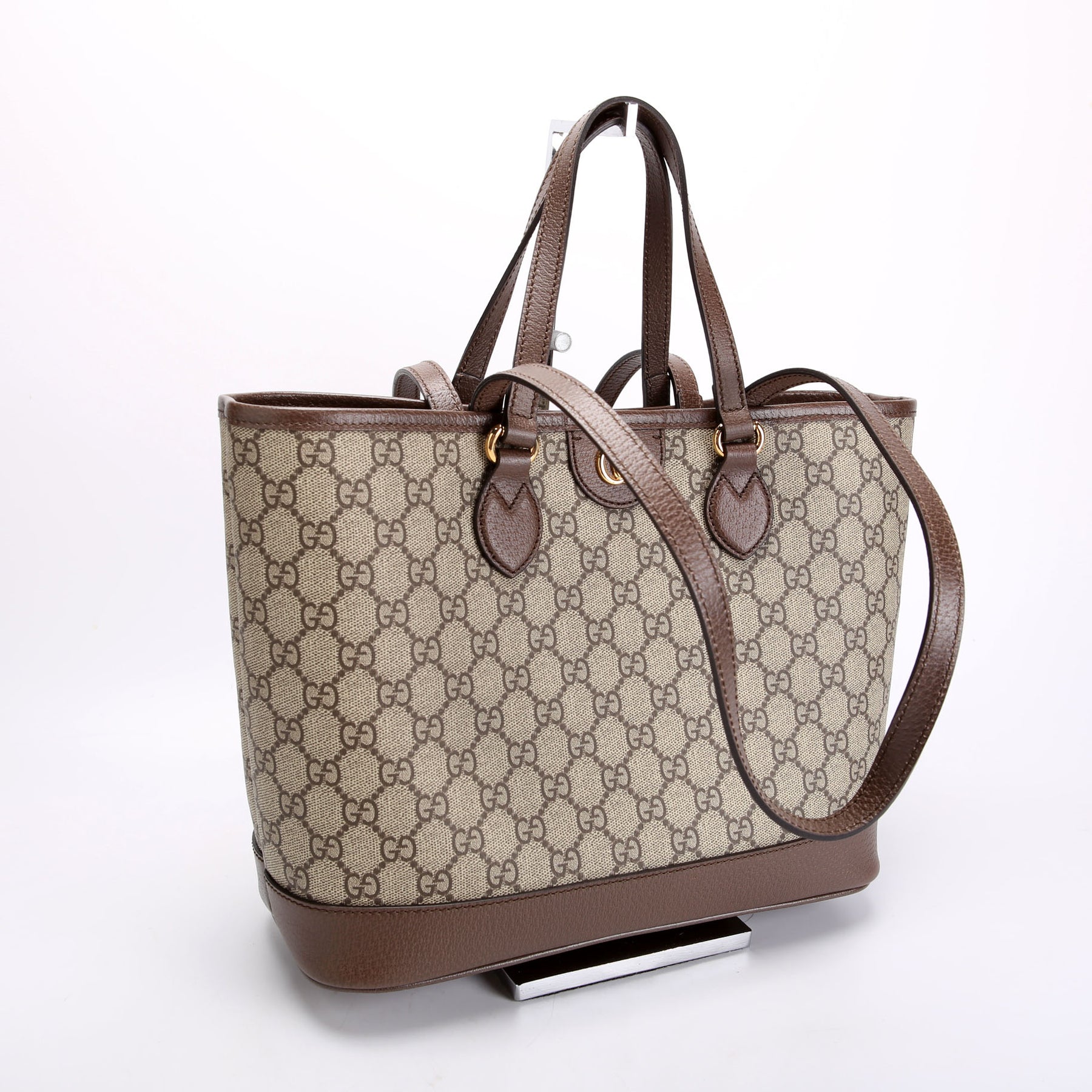 These pre-owned Gucci GG Supreme Ophidia Shoulder Tote Medium are guaranteed 100% authentic. The exterior is in the classic Gucci GG Supreme coated canvas.