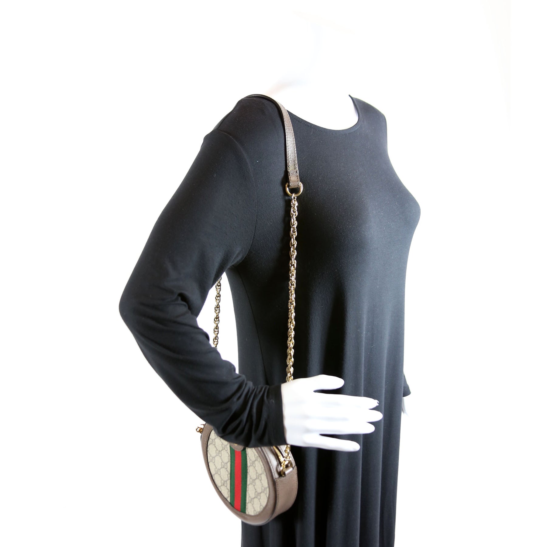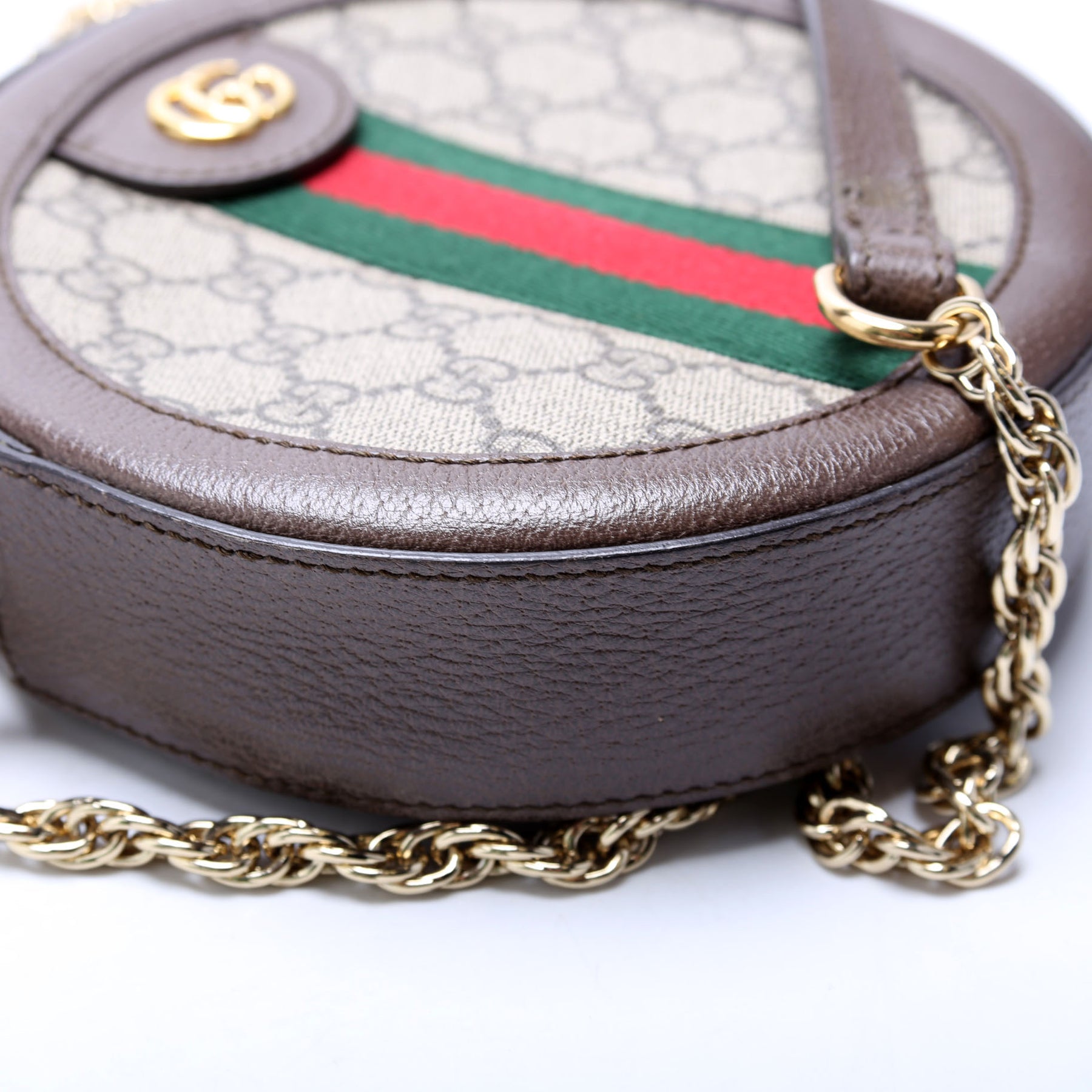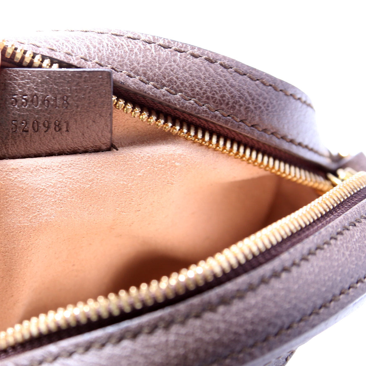 This pre-owned Gucci Ophidia Round Small Crossbody is guaranteed 100% authentic. The exterior is in the classic Gucci GG Supreme coated canvas.