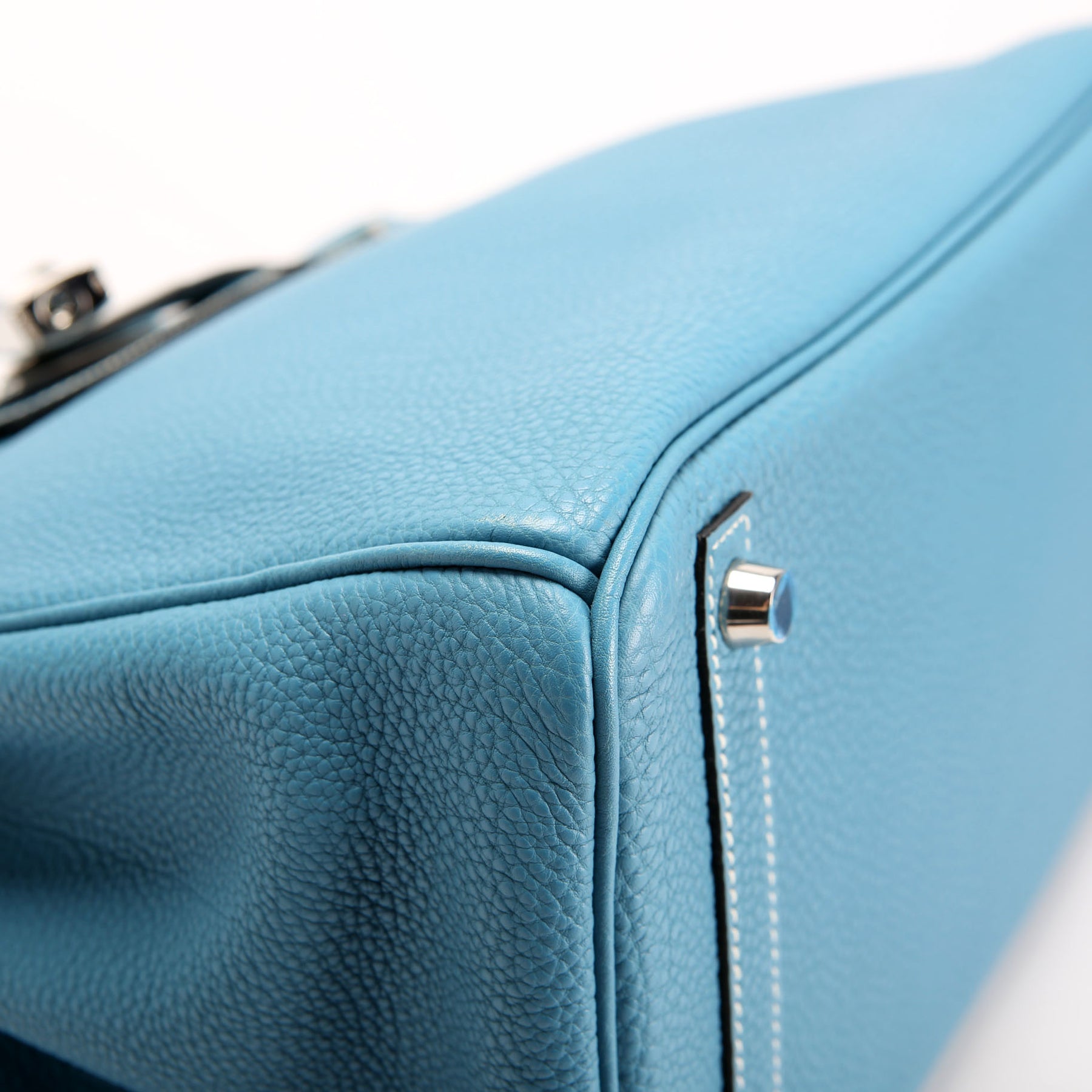 Exterior: The exterior leather is free from wear. There is a mark underneath the hardware on the front. The corners show light wear and rubbing.