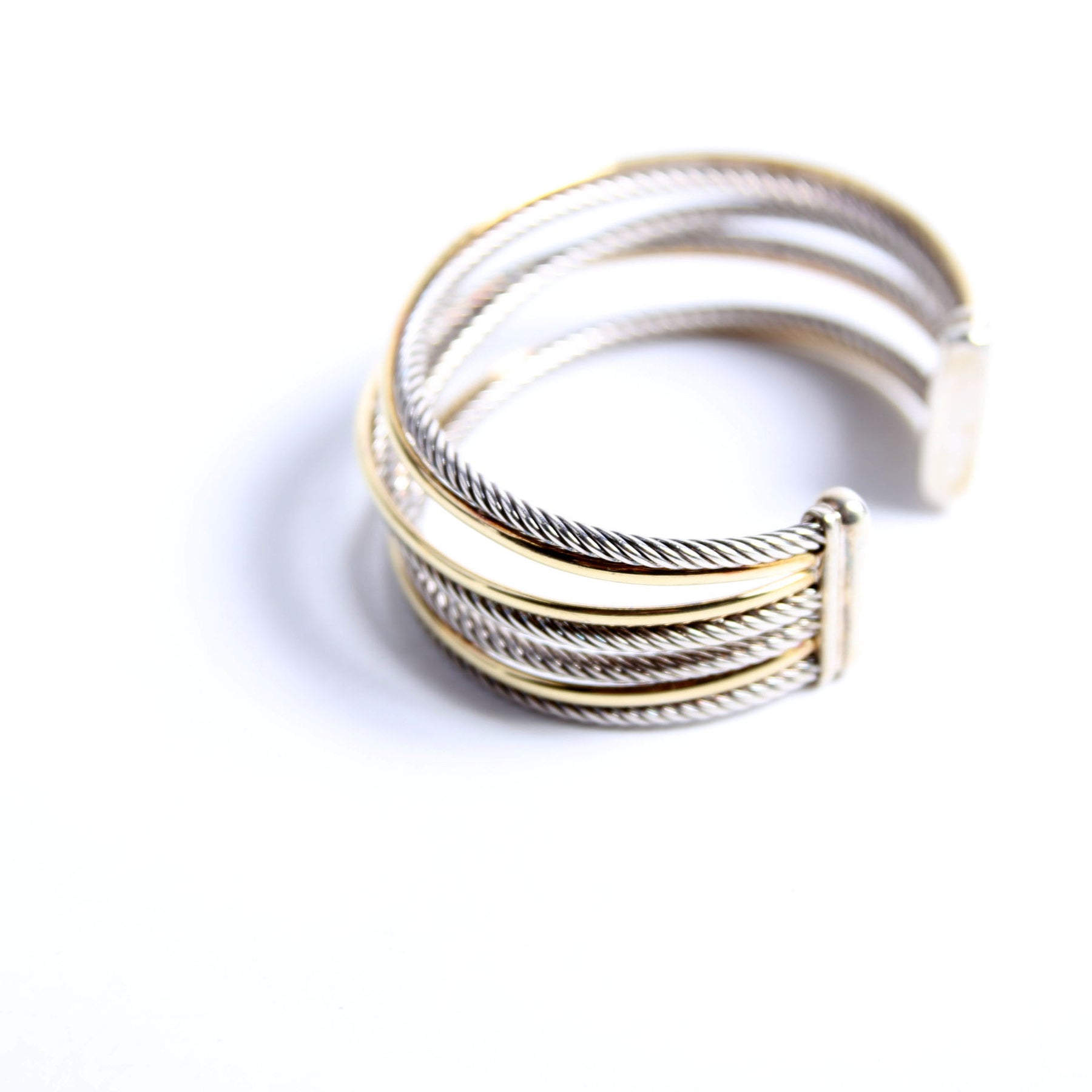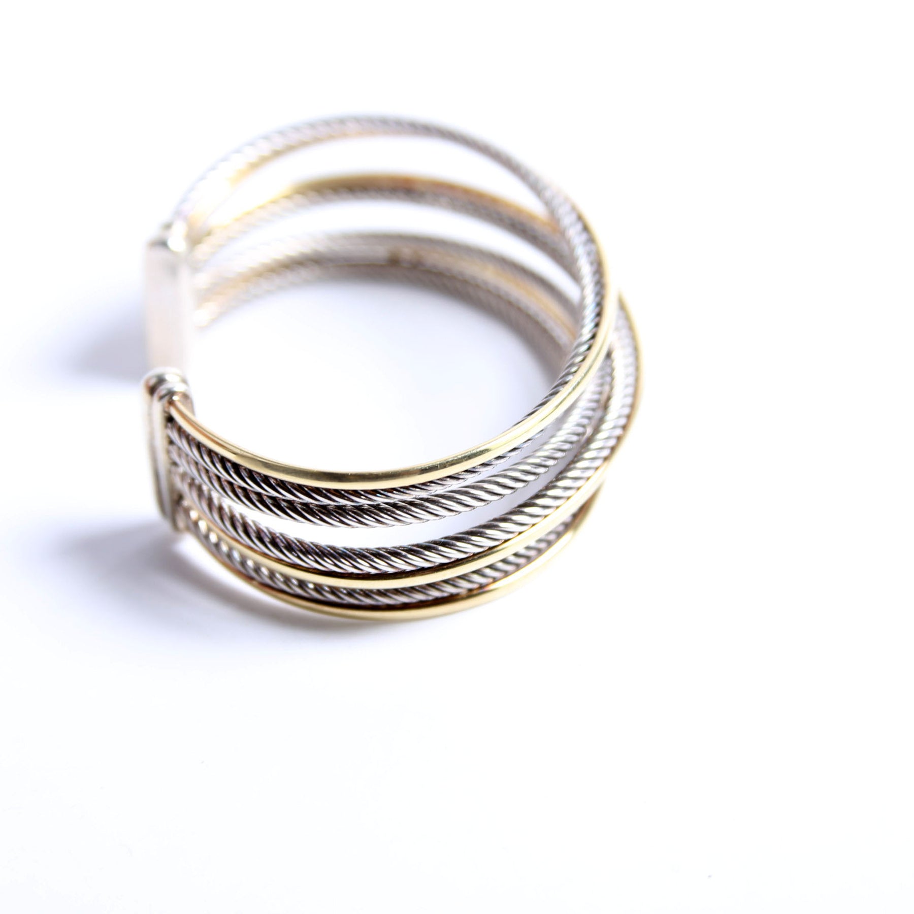 This pre-owned David Yurman Crossover 4 Row Cuff Bracelet 925/750 is guaranteed 100% authentic.