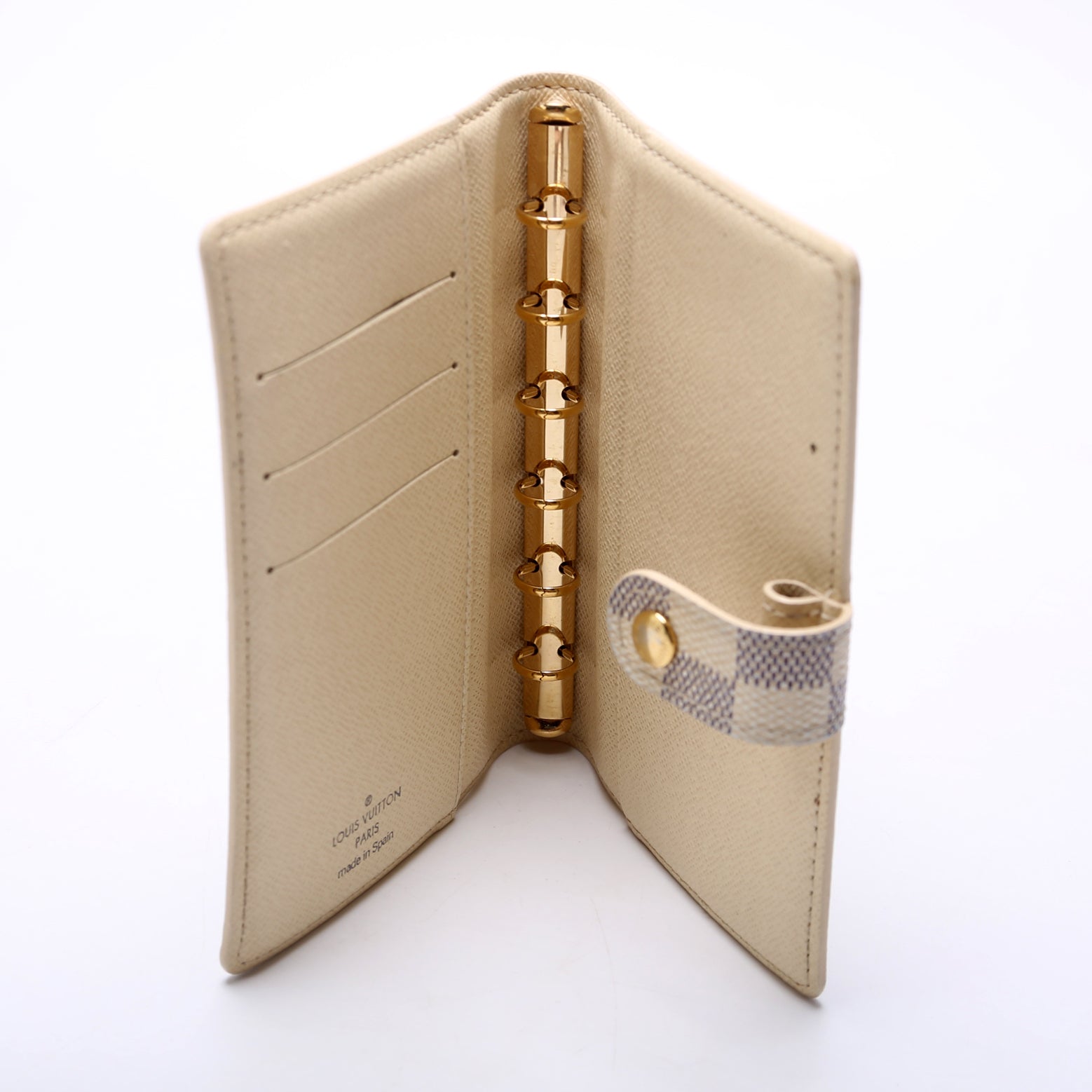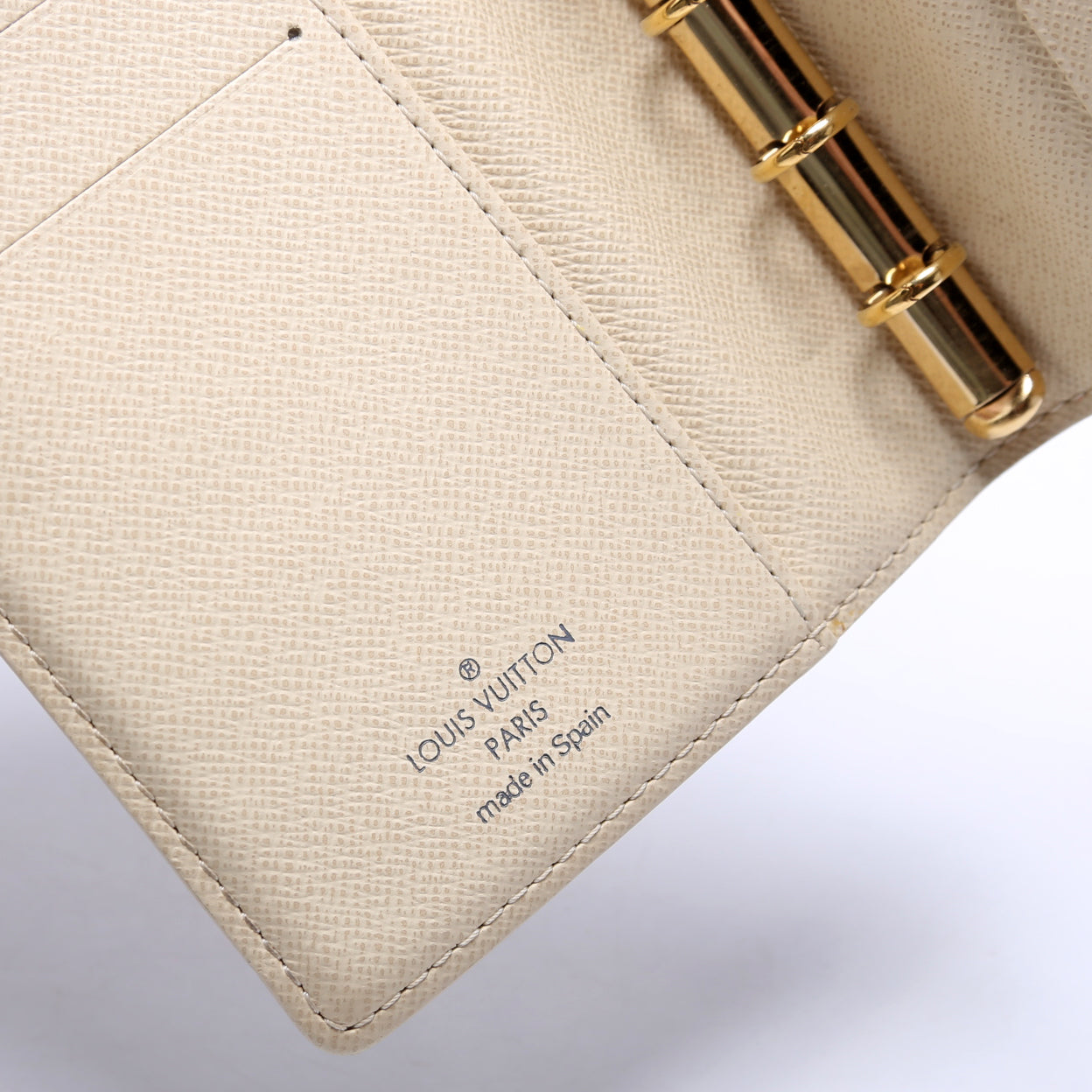 This pre-owned Louis Vuitton Agenda Small Ring is guaranteed 100% authentic. The exterior is in the classic Damier Azur coated canvas.