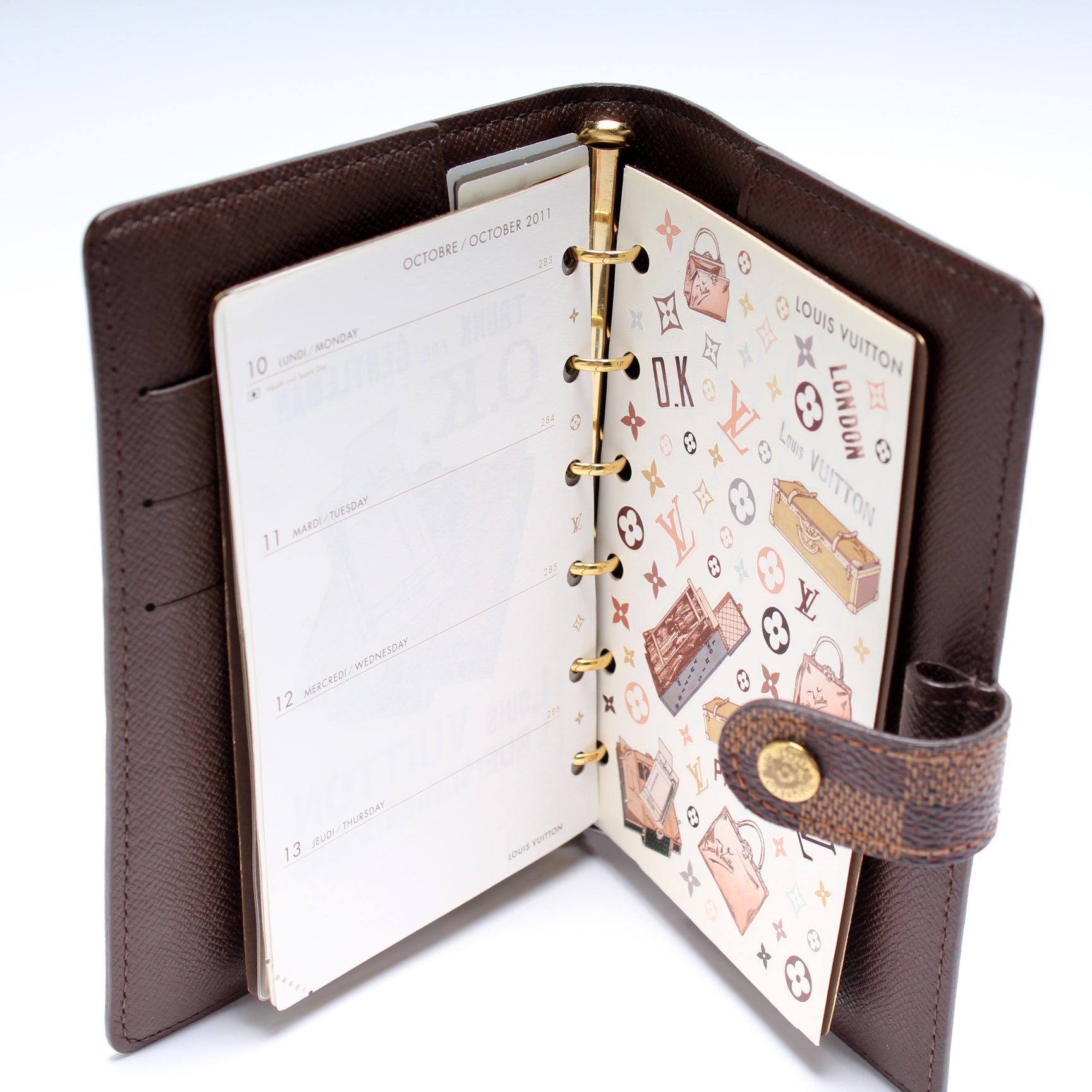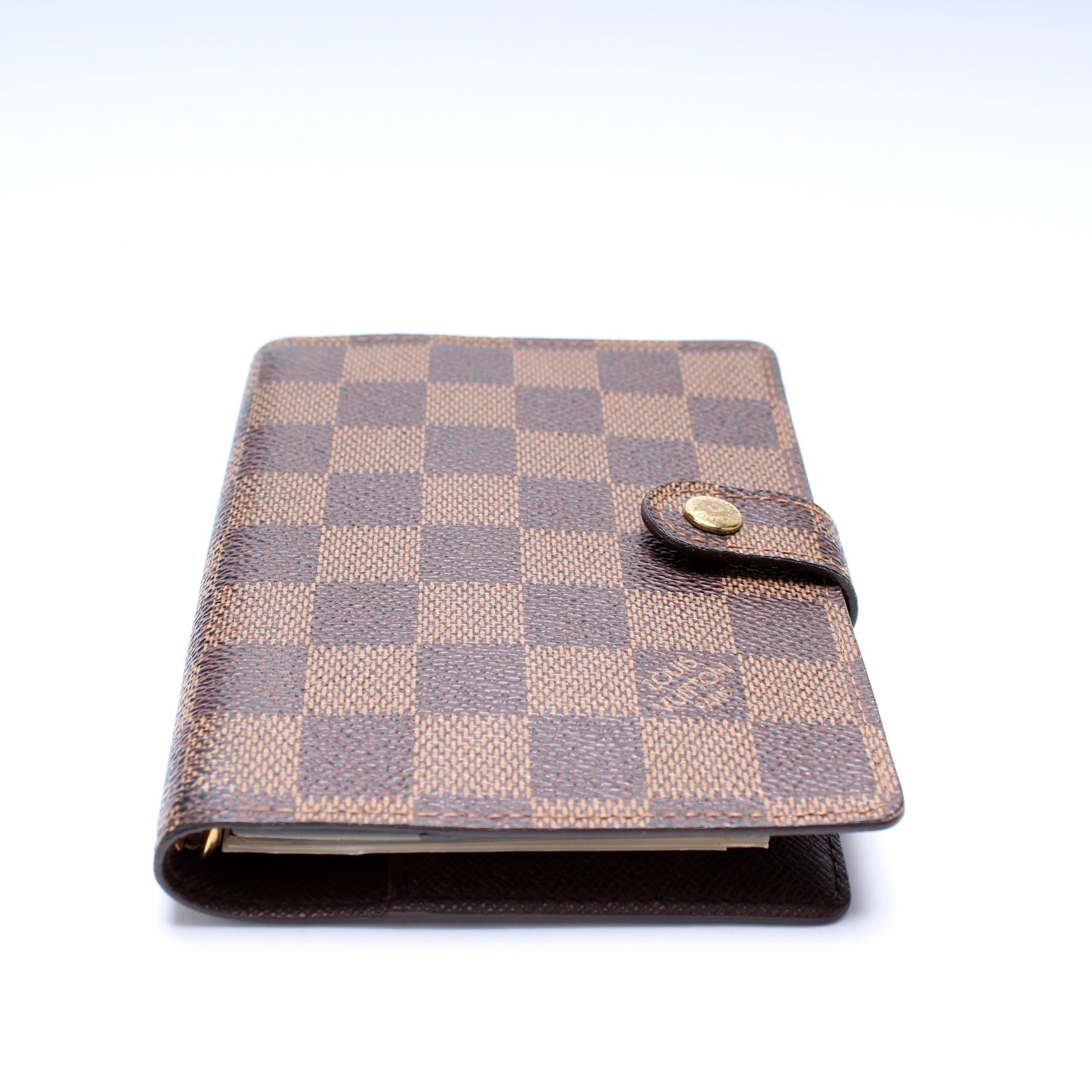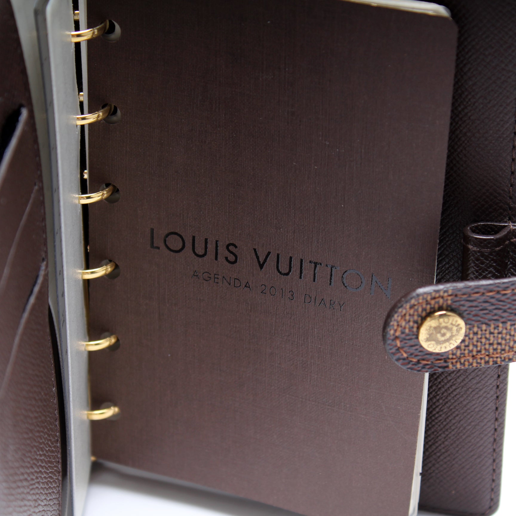 This pre-owned Louis Vuitton Agenda Small Ring is guaranteed 100% authentic. The exterior is in the classic Monogram coated canvas.