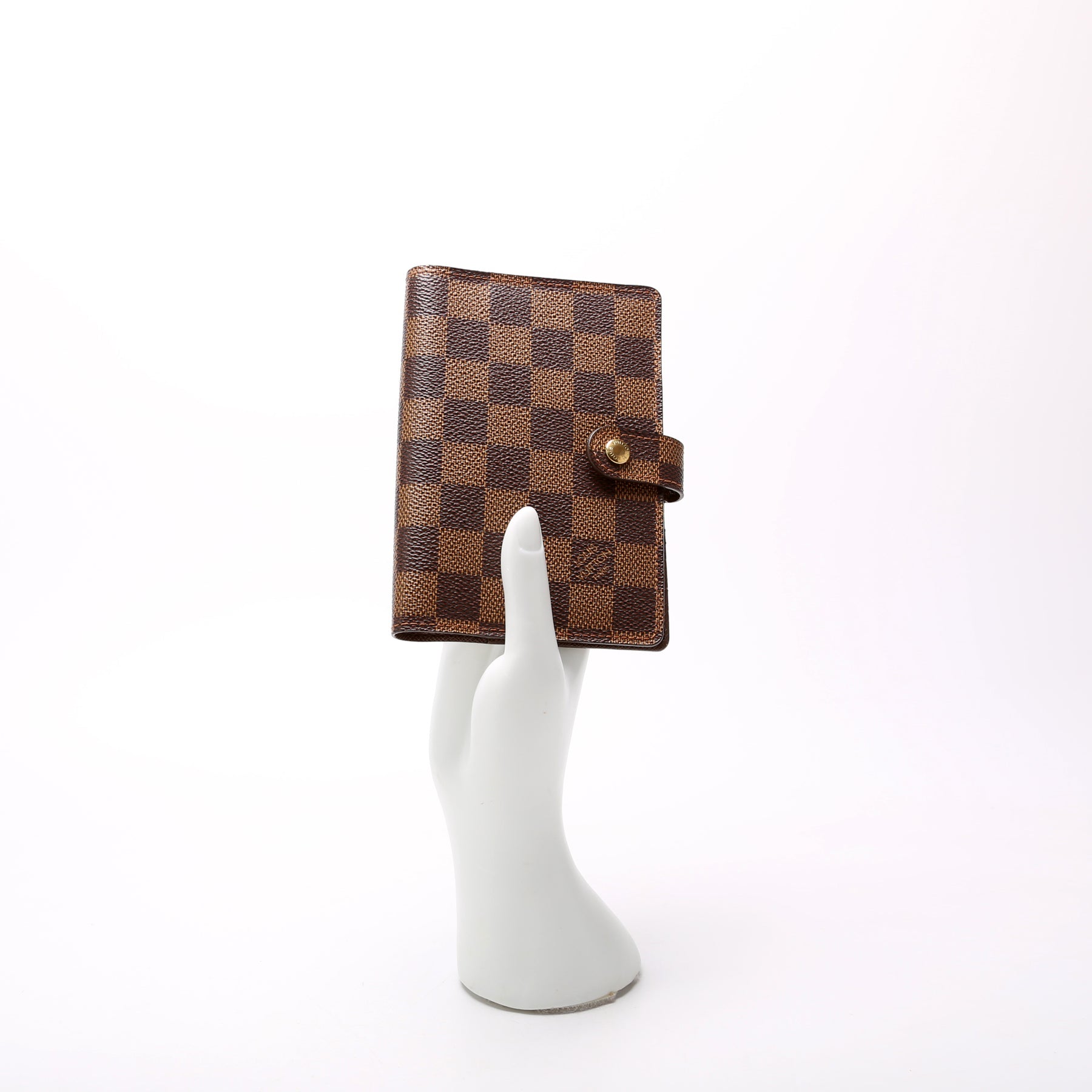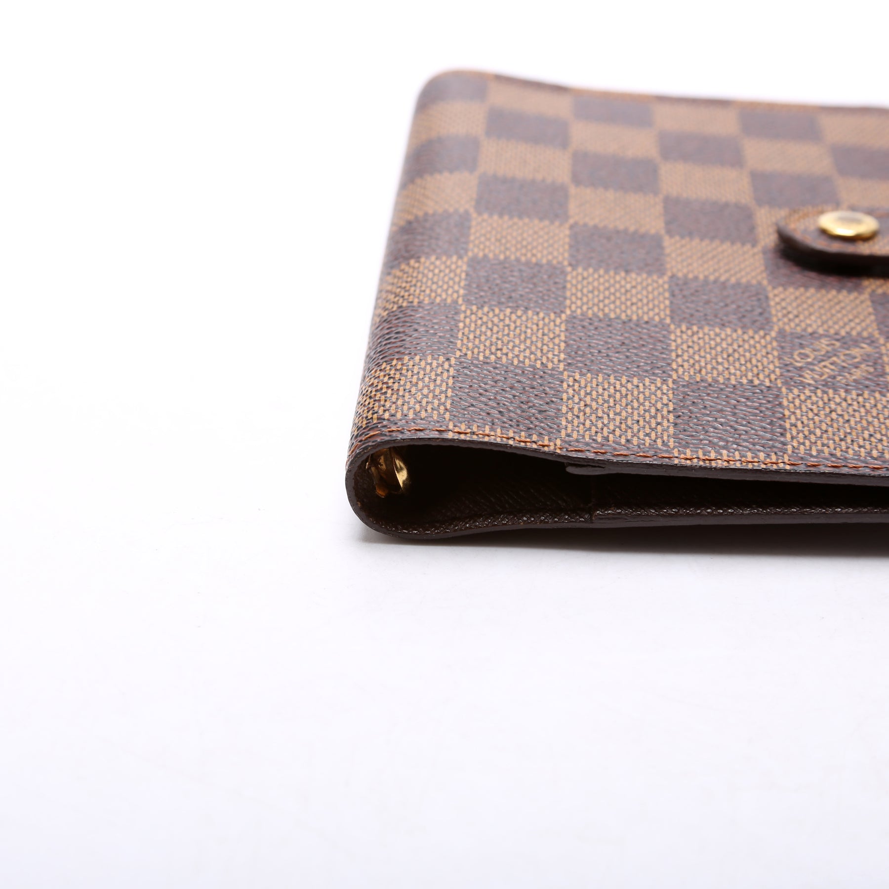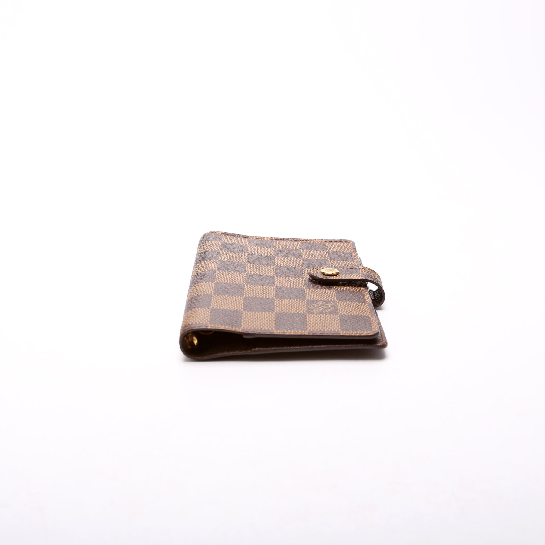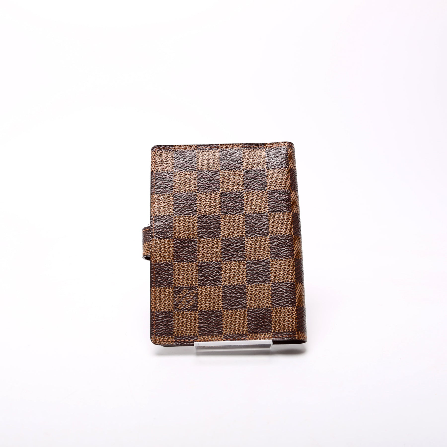 This pre-owned Louis Vuitton Agenda Small Ring is guaranteed 100% authentic. The exterior is in the classic Damier Ebene coated canvas.