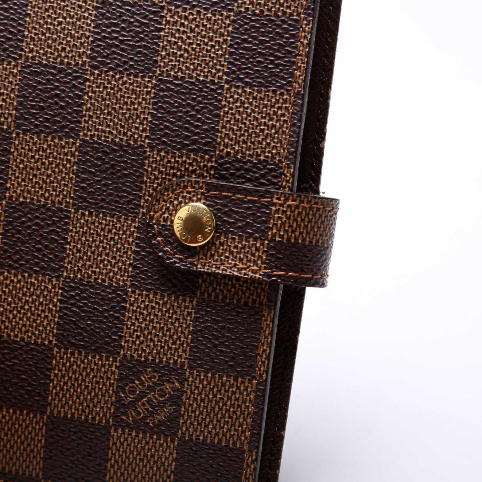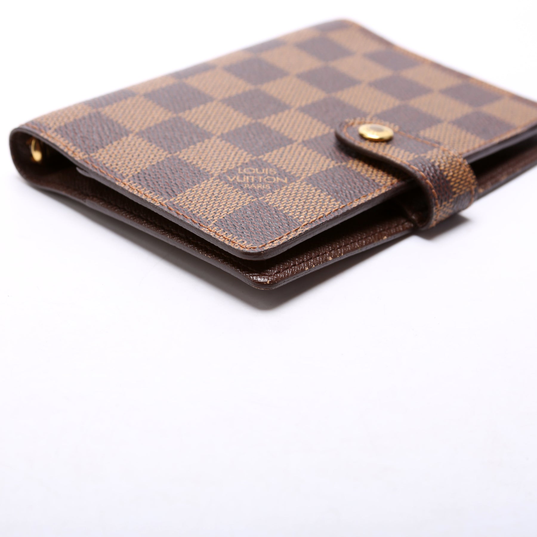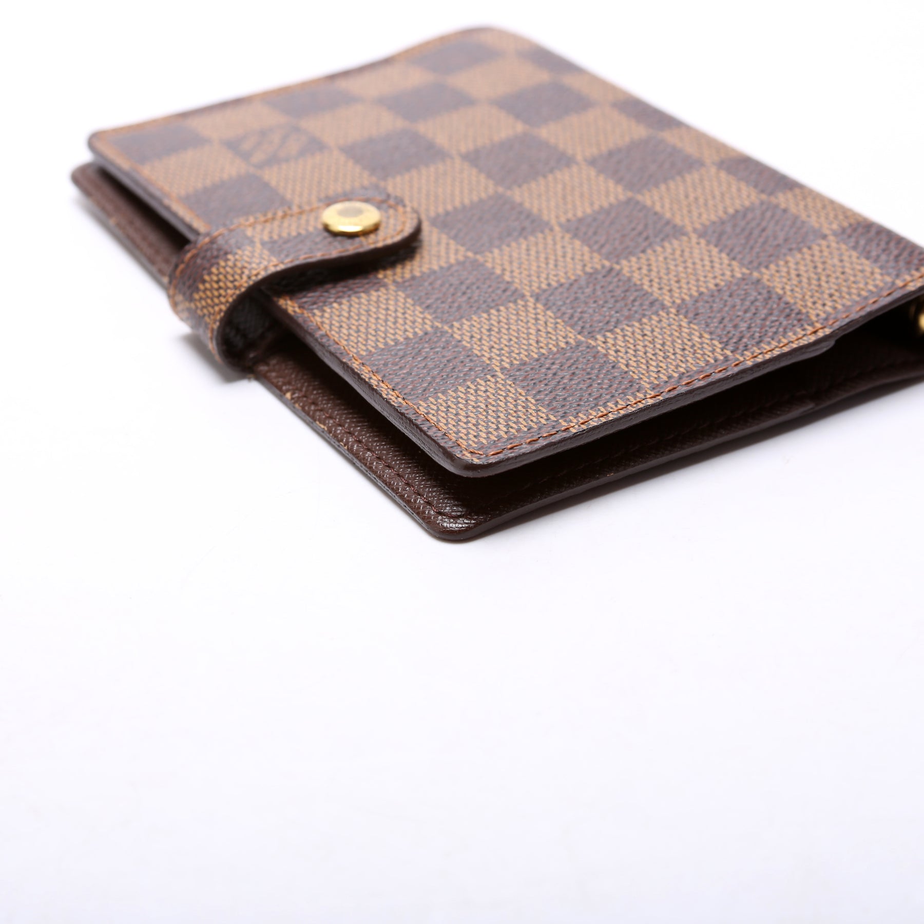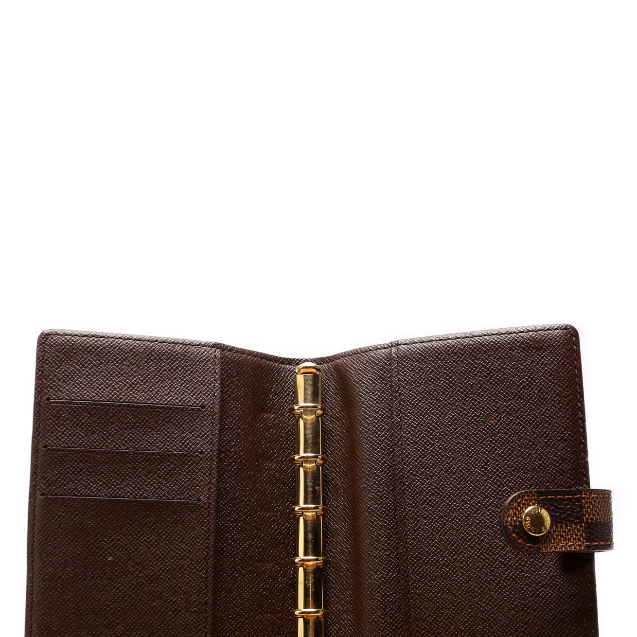This pre-owned Louis Vuitton Agenda Small Ring is guaranteed 100% authentic. The exterior is in the classic Damier Ebene coated canvas.