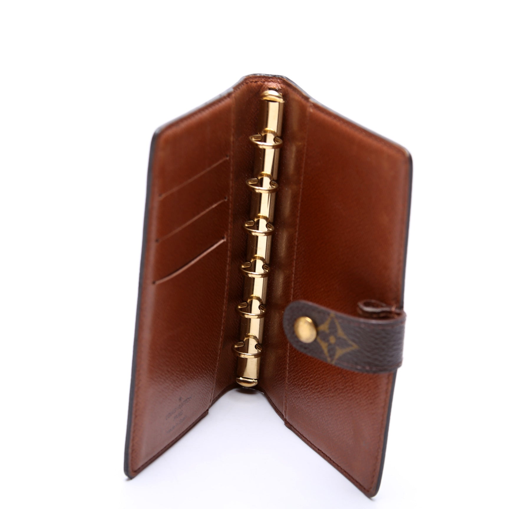 This pre-owned Louis Vuitton Agenda Small Ring is guaranteed 100% authentic. The exterior is in the classic Monogram coated canvas.