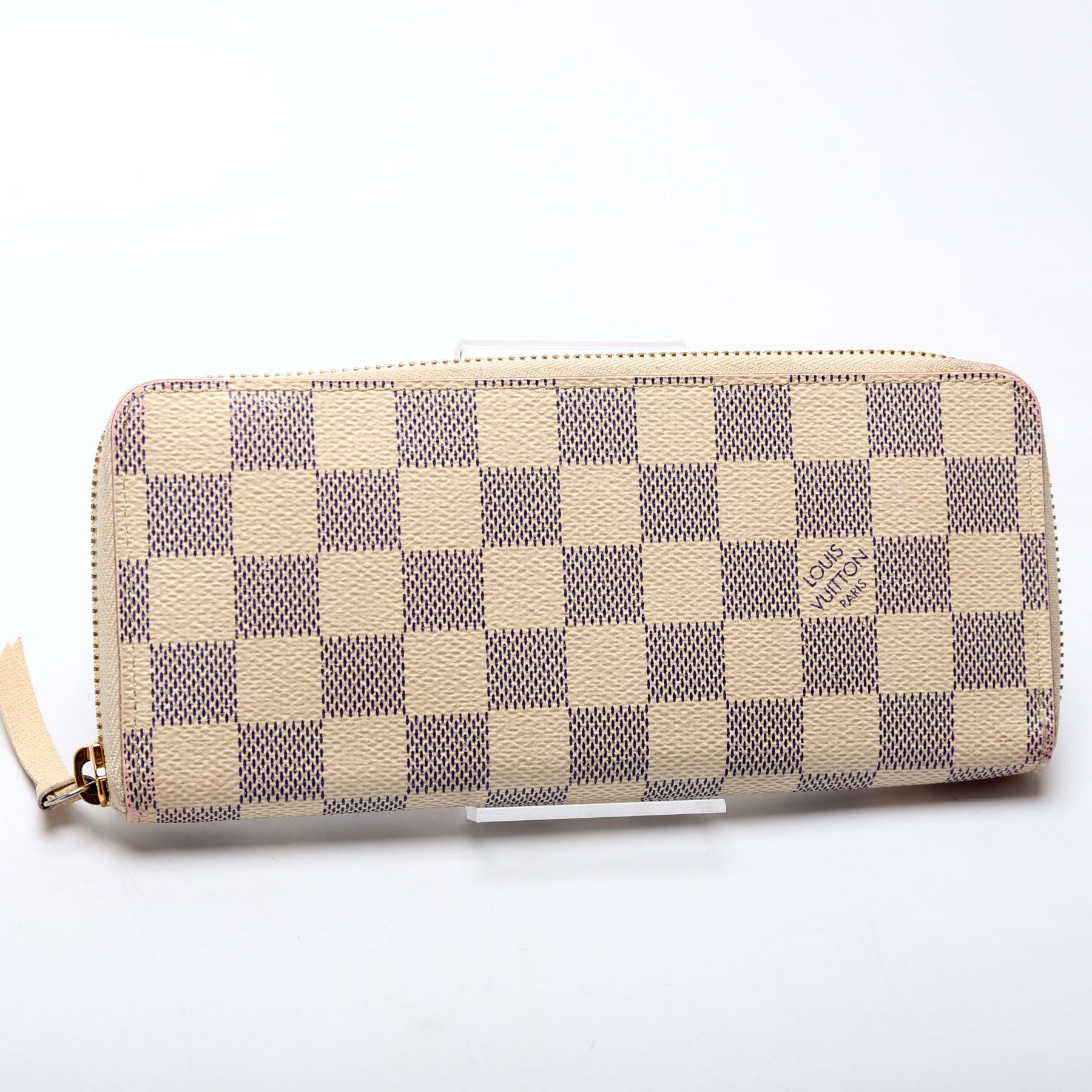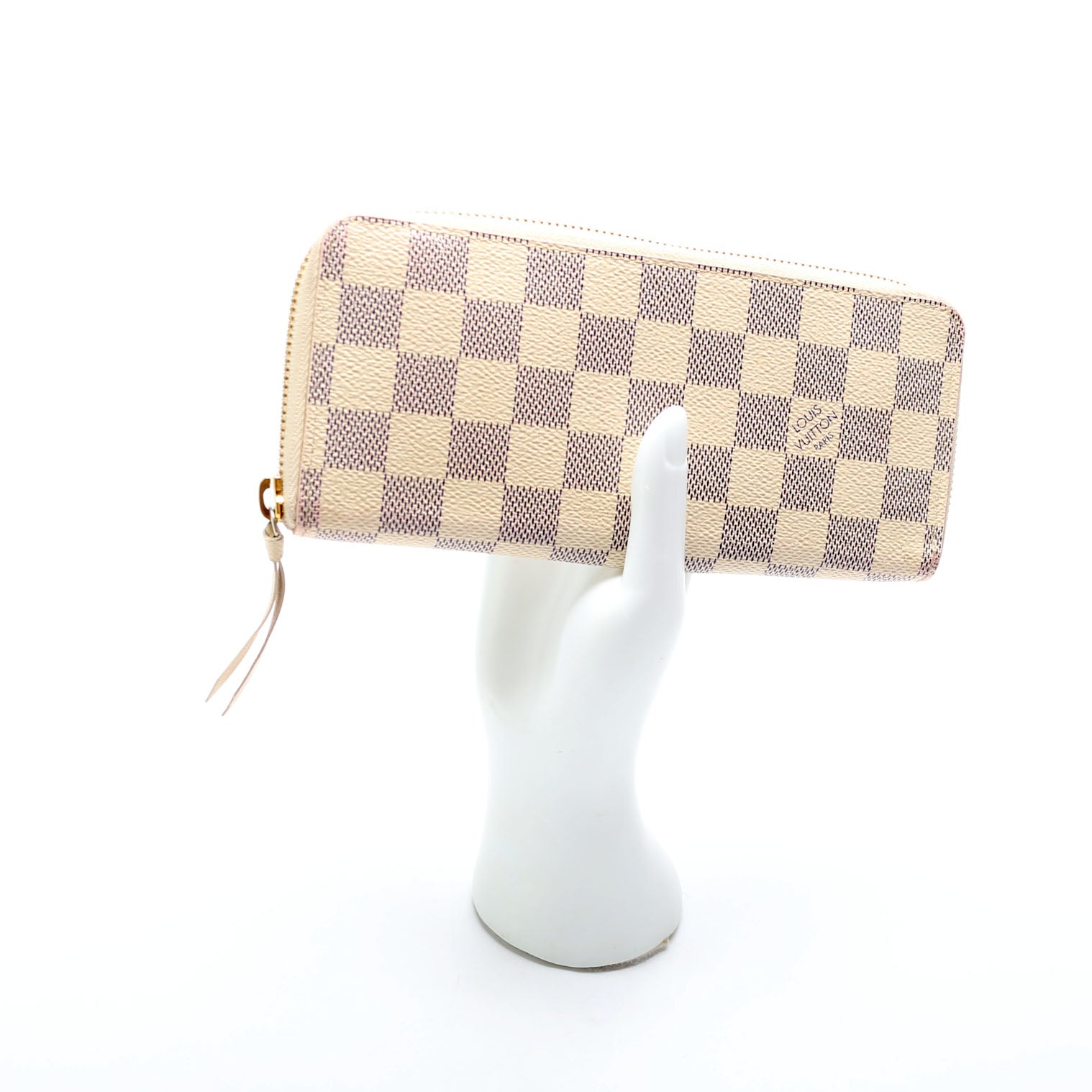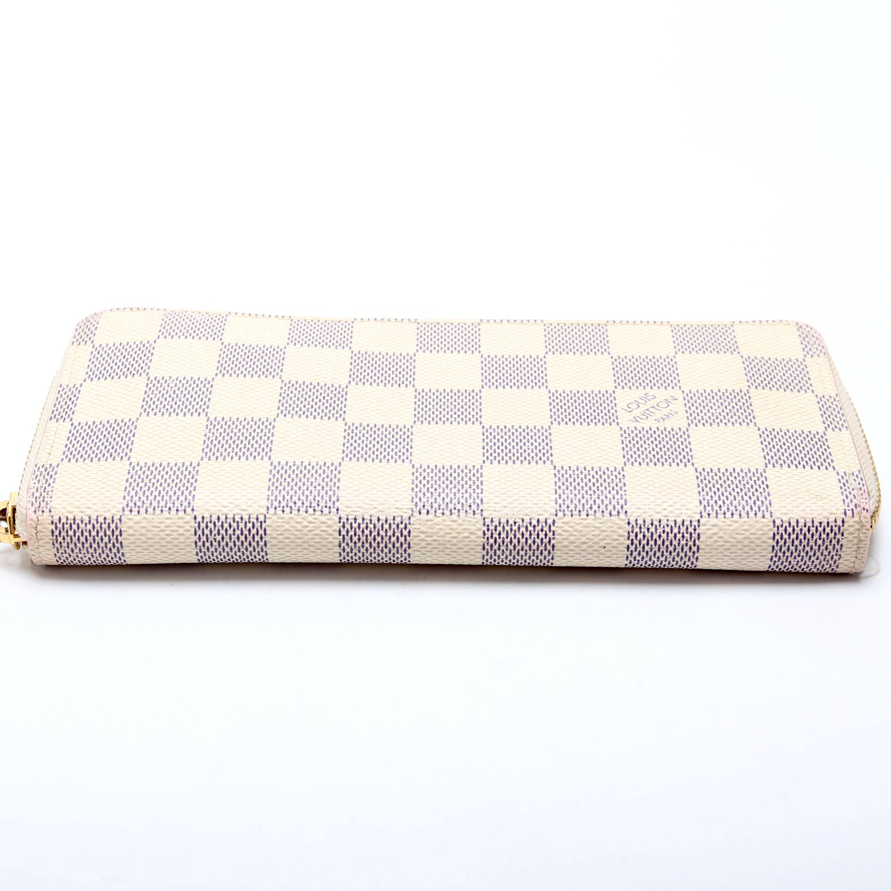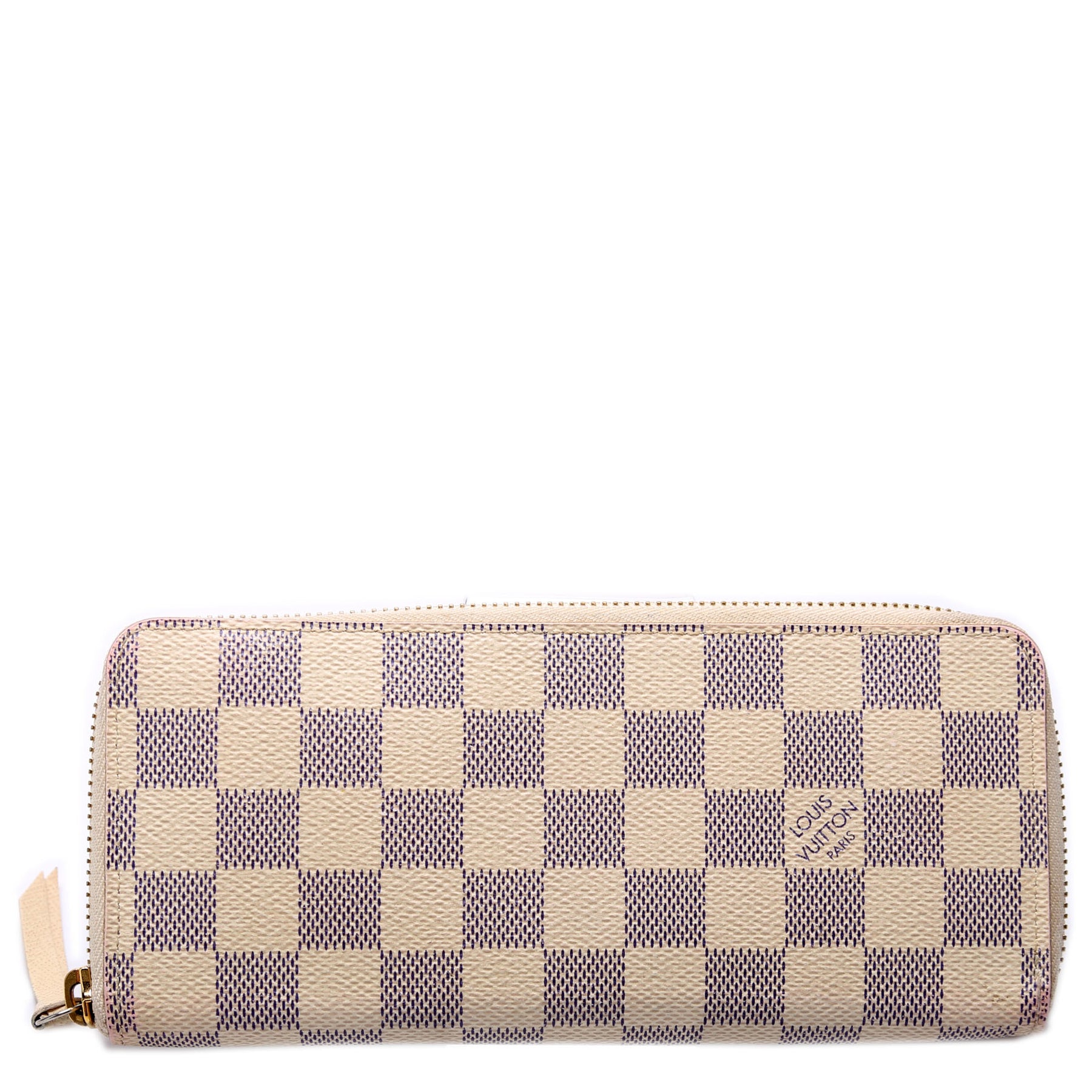 This pre-owned Louis Vuitton Clemence Wallet is guaranteed 100% authentic. The exterior is in the classic Louis Vuitton Damier Azur coated canvas.