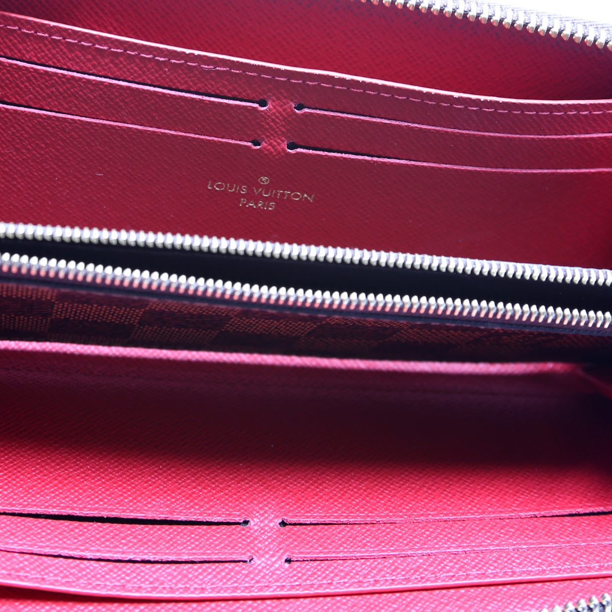 This pre-owned Louis Vuitton Clemence Wallet is guaranteed 100% authentic. The exterior is in the classic Louis Vuitton Damier Ebene coated canvas.
