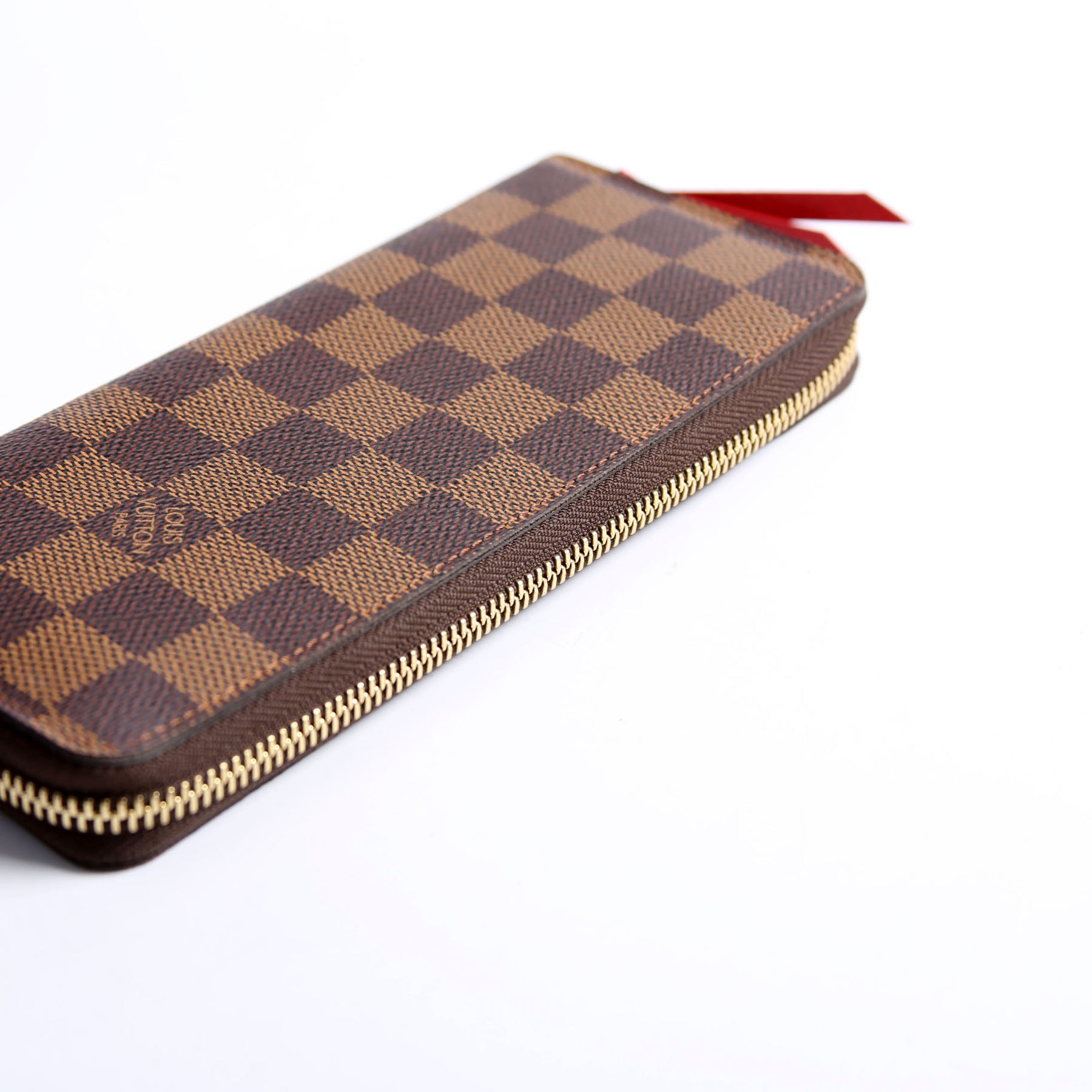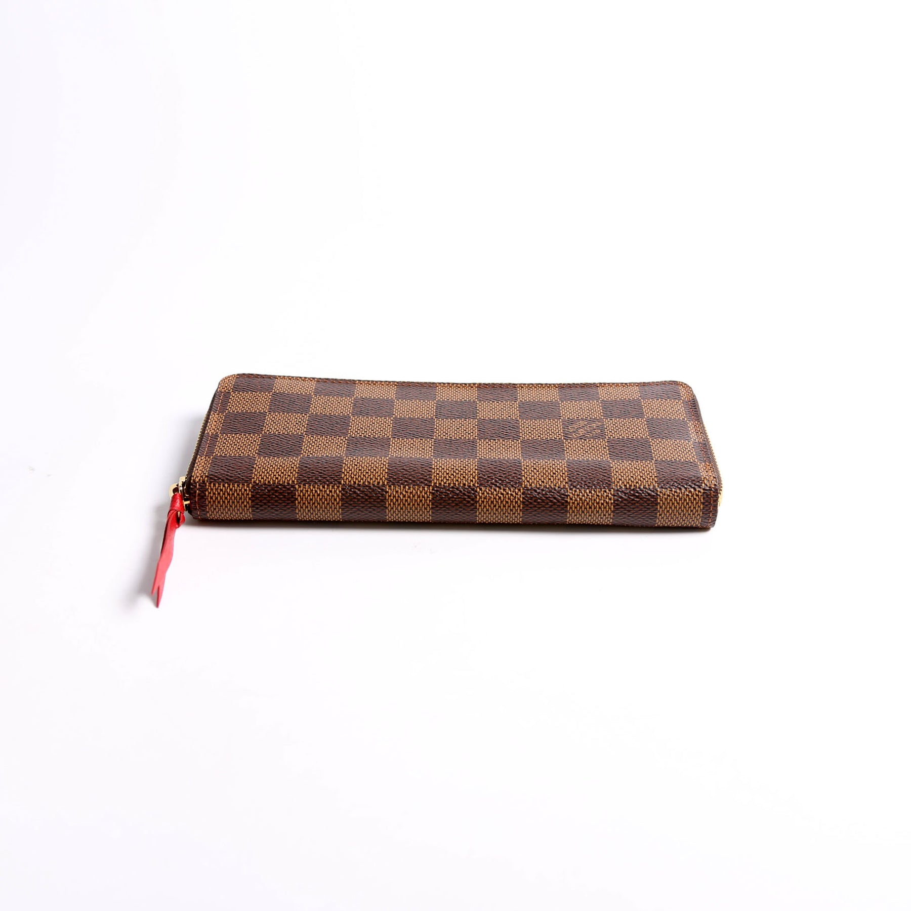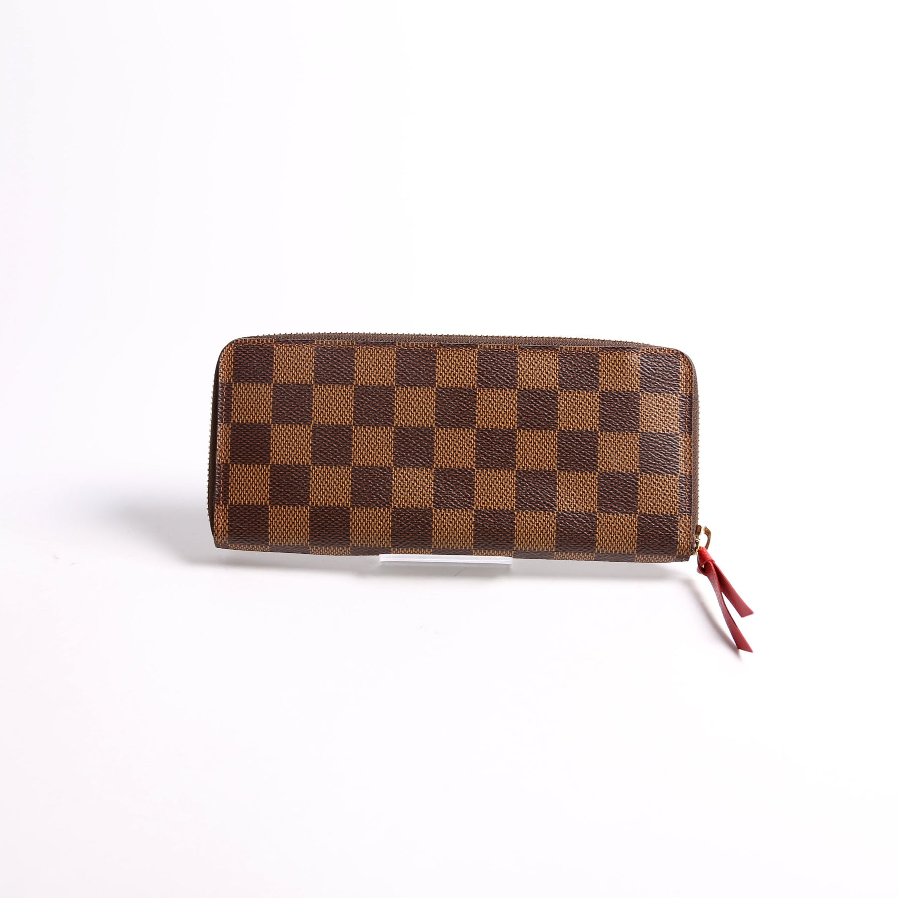 This pre-owned Louis Vuitton Clemence Wallet is guaranteed 100% authentic. The exterior is in the classic Louis Vuitton Damier Ebene coated canvas.