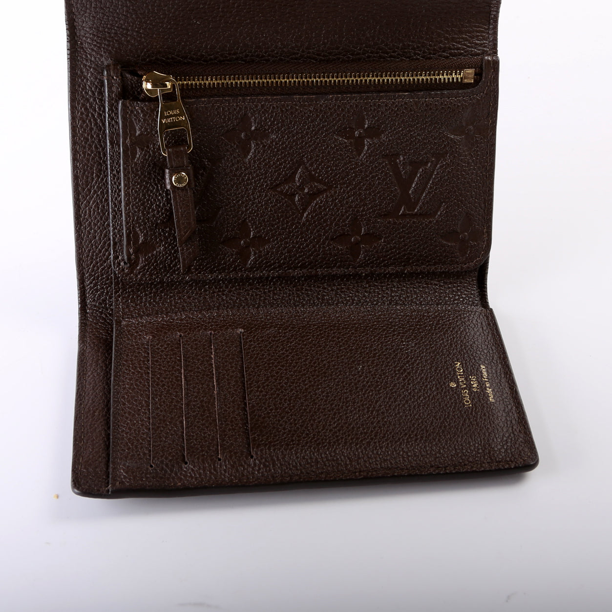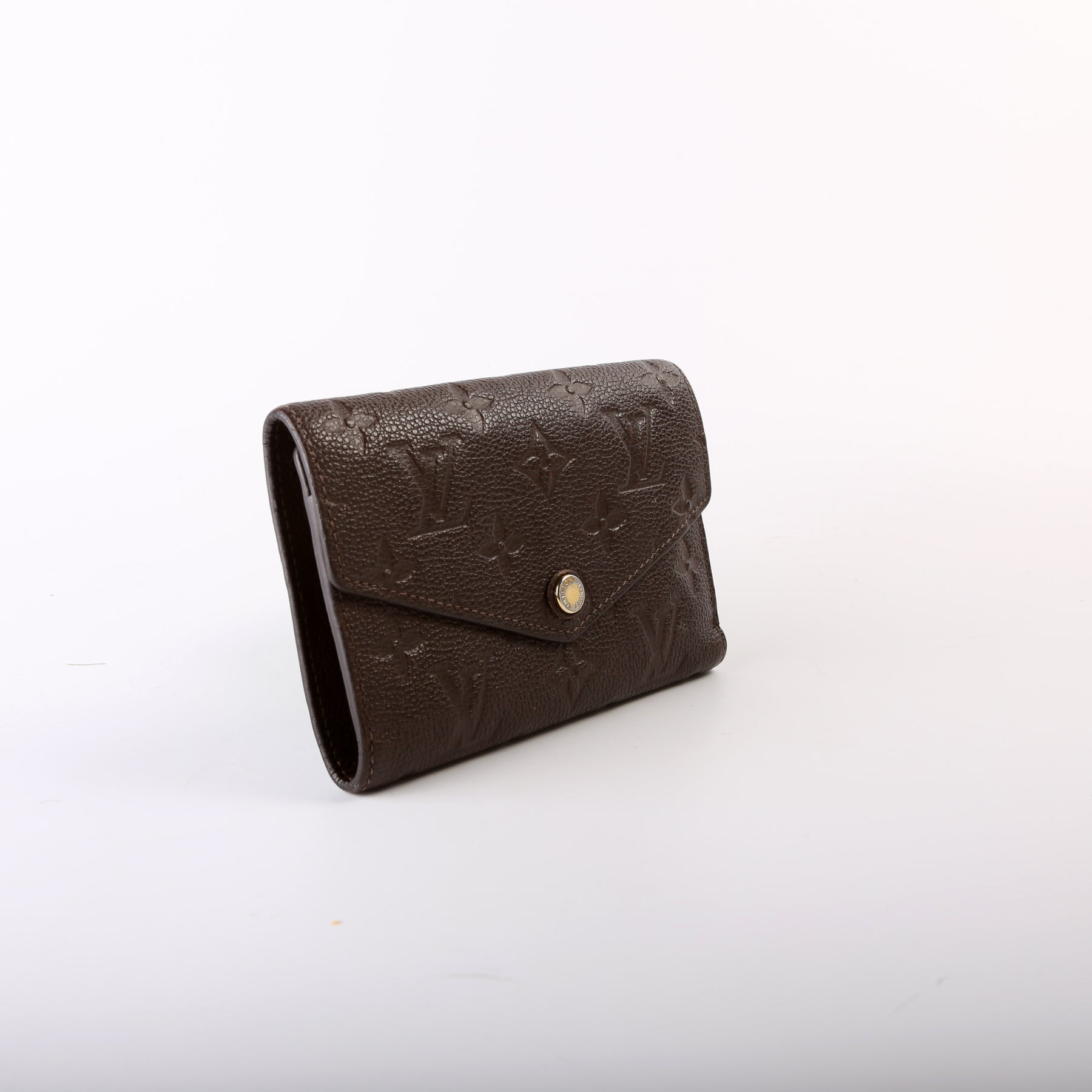 This pre-owned Louis Vuitton Compact Curieuse Wallet is guaranteed 100% authentic. The exterior is in the Louis Vuitton Monogram Empreinte leather.