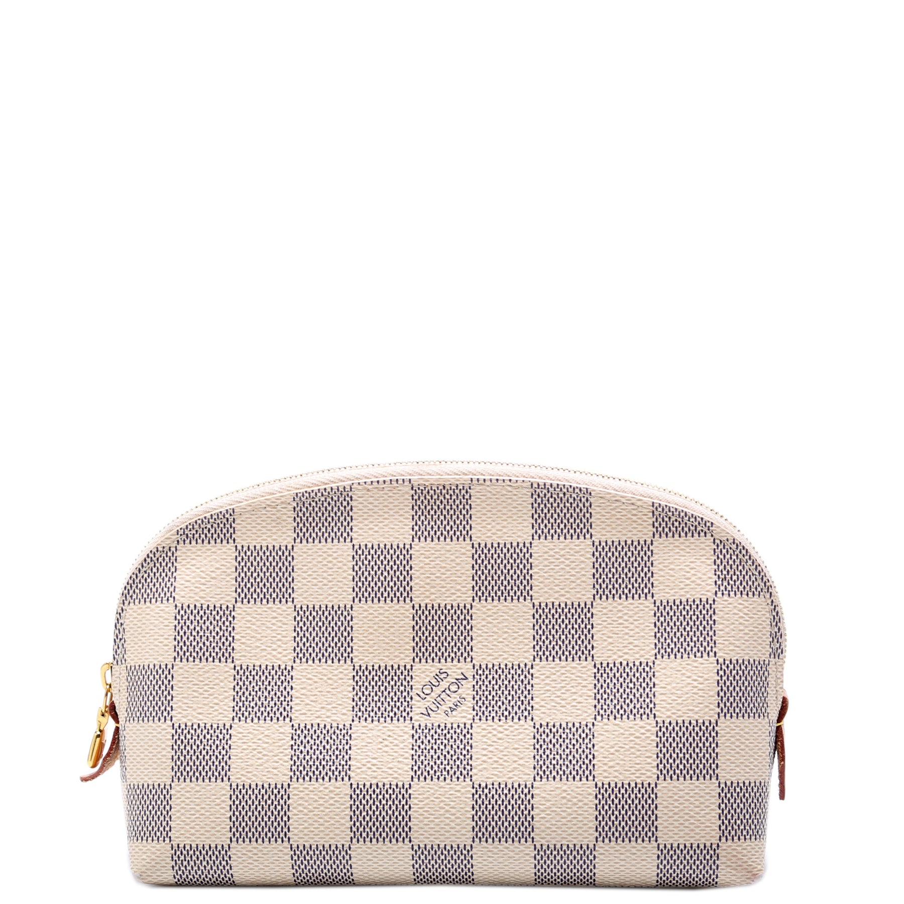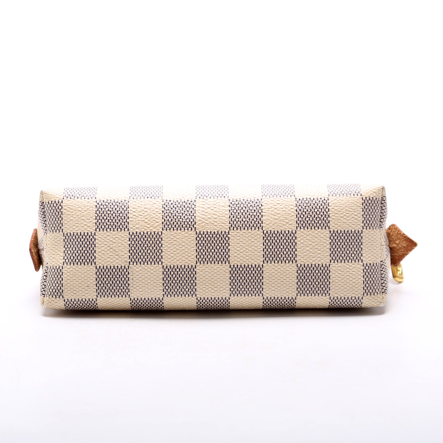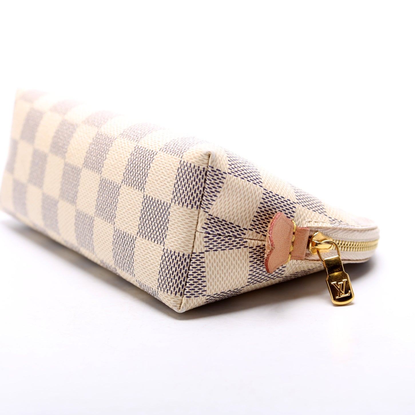 This pre-owned Louis Vuitton Cosmetic Pouch PM is guaranteed 100% authentic. The exterior is in the classic Louis Vuitton Damier Azur coated canvas.