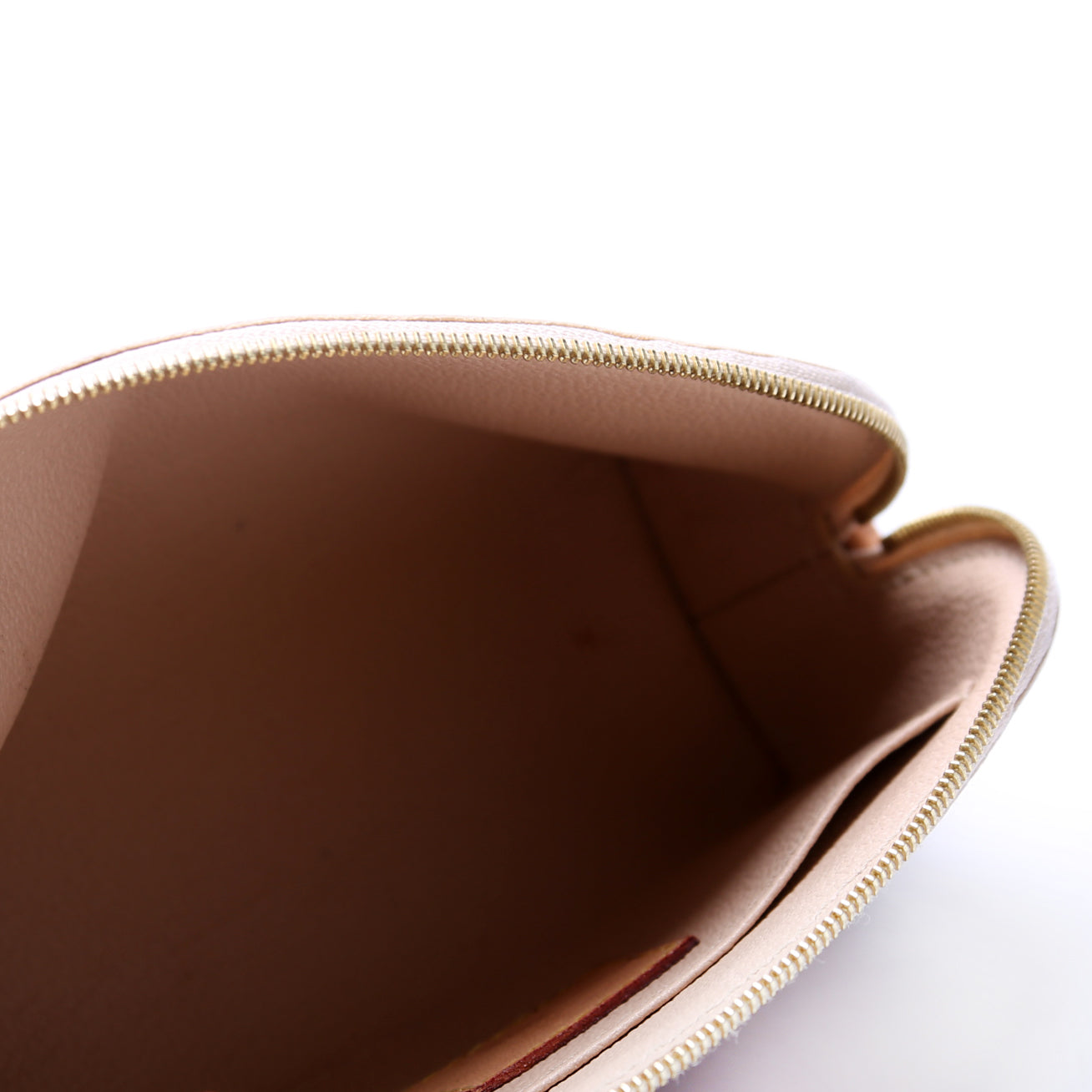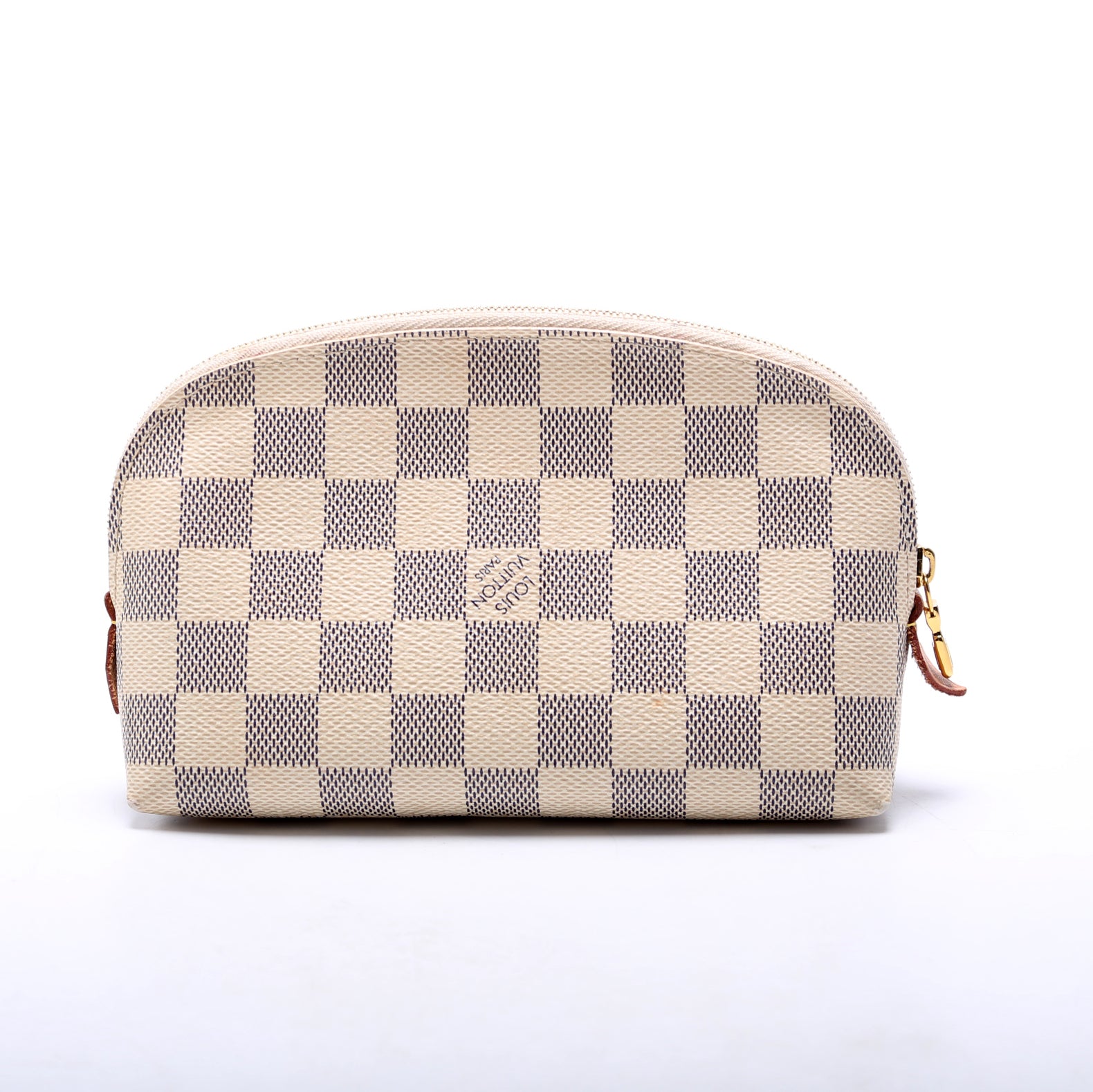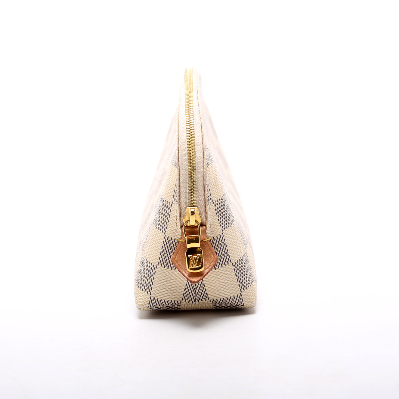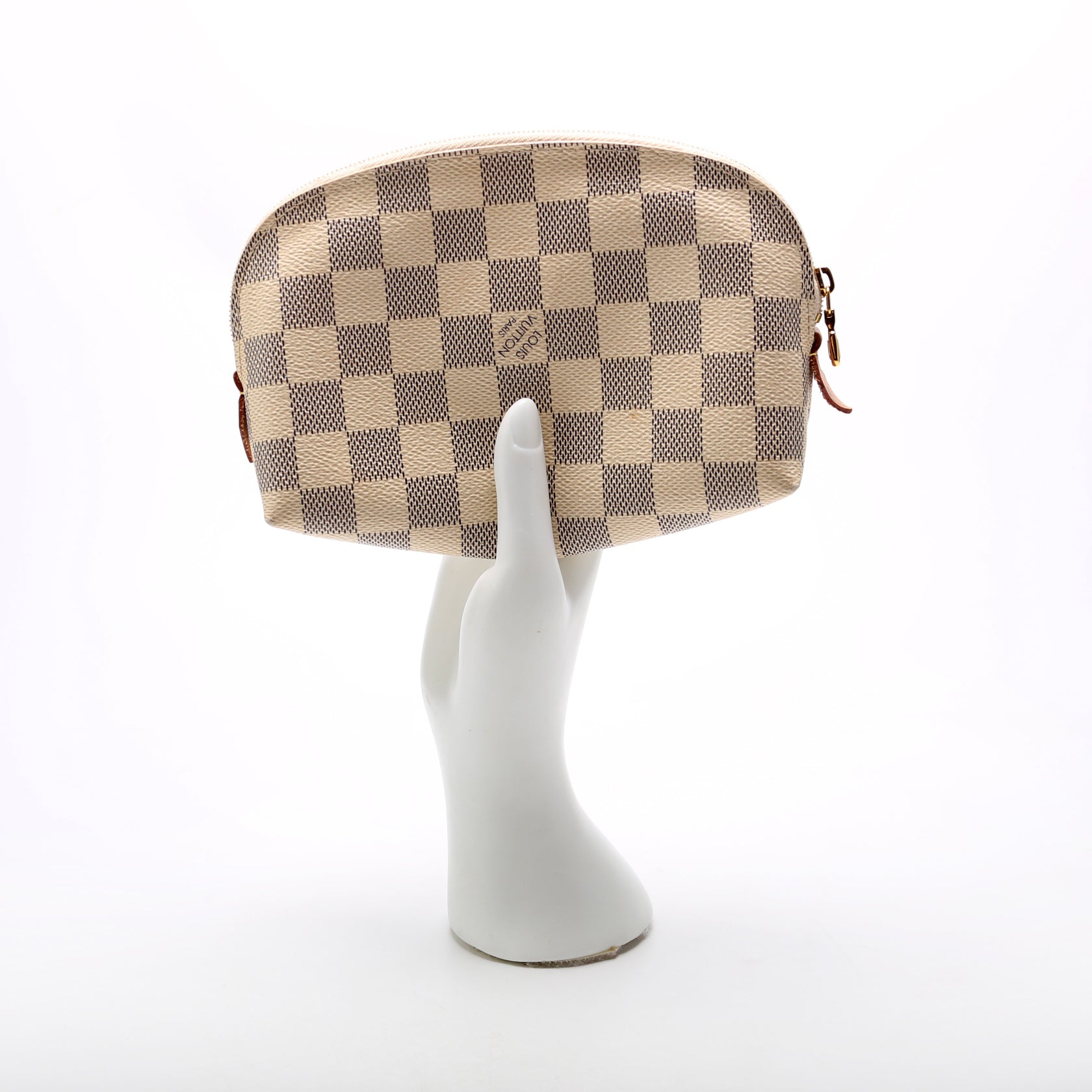 This pre-owned Louis Vuitton Cosmetic Pouch PM is guaranteed 100% authentic. The exterior is in the classic Louis Vuitton Damier Azur coated canvas.