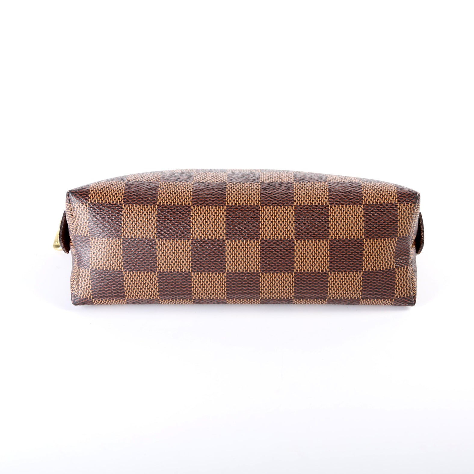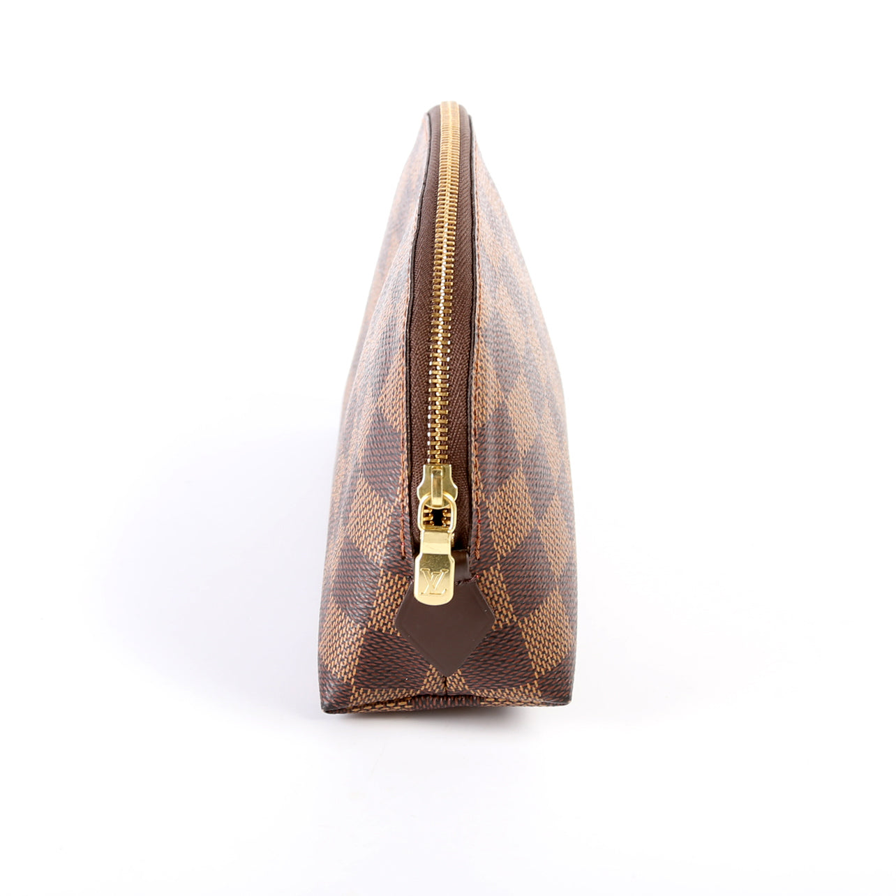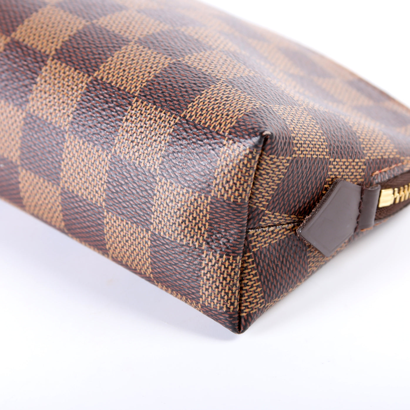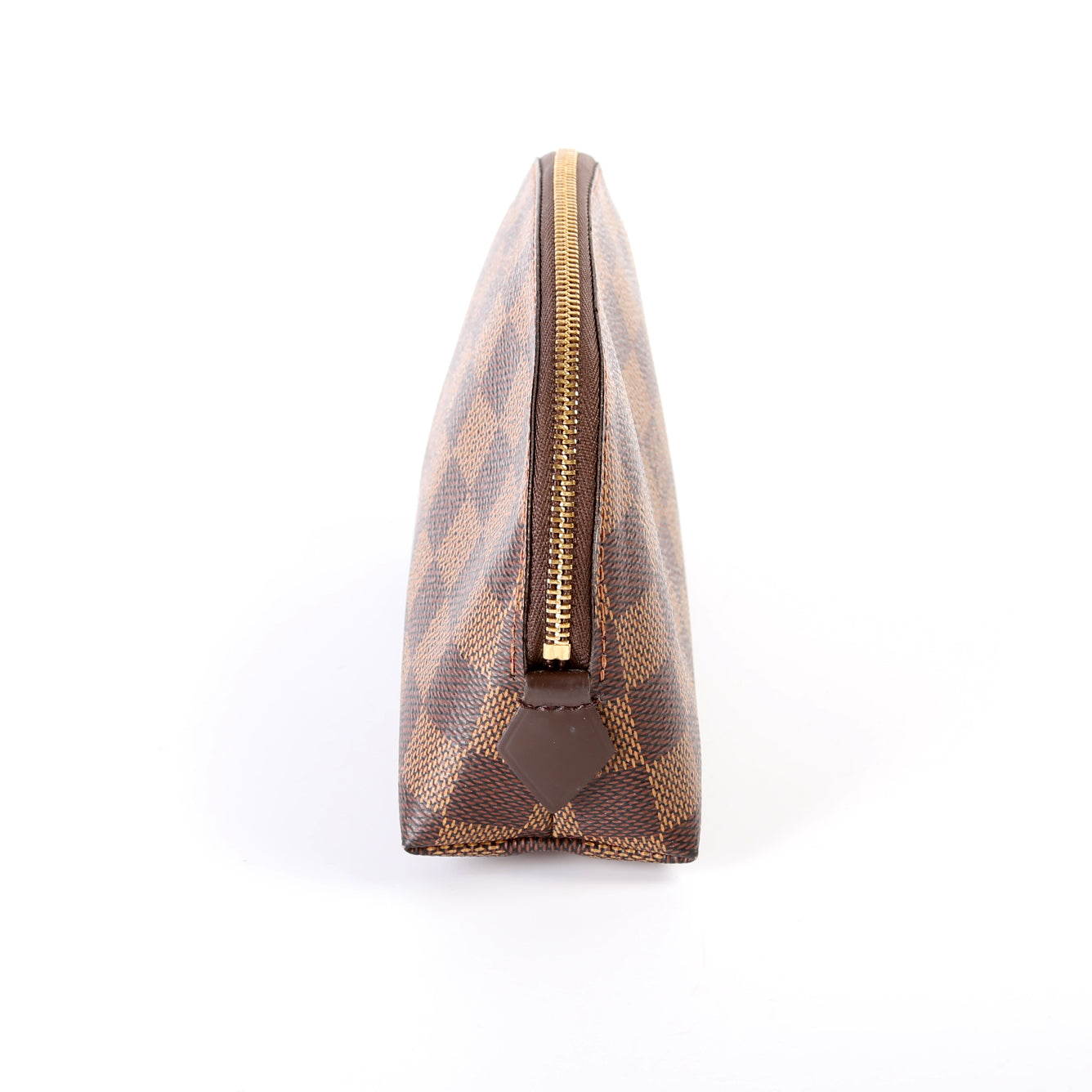 This pre-owned Louis Vuitton Cosmetic Pouch PM is guaranteed 100% authentic. The exterior is in the classic Louis Vuitton Damier Ebene coated canvas.