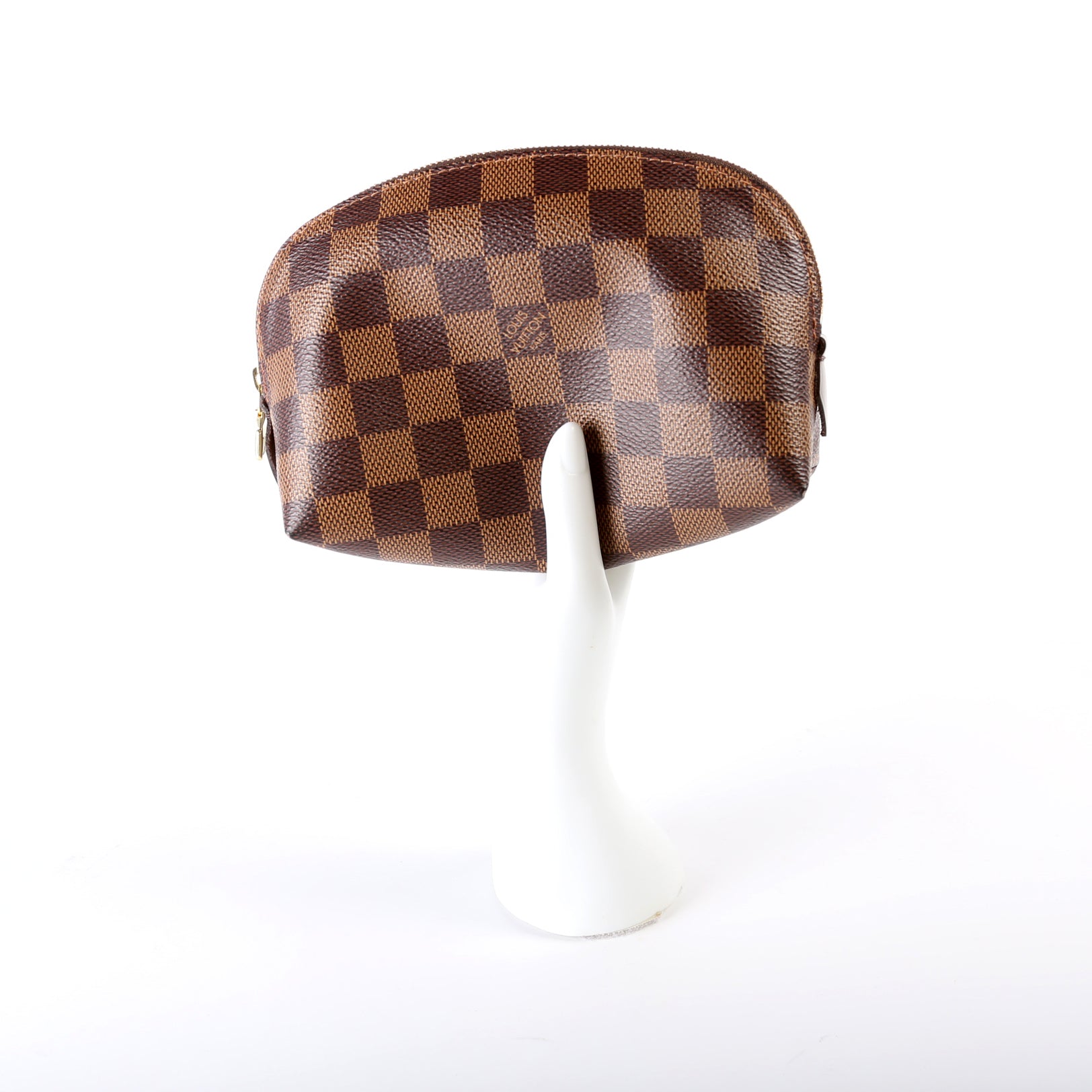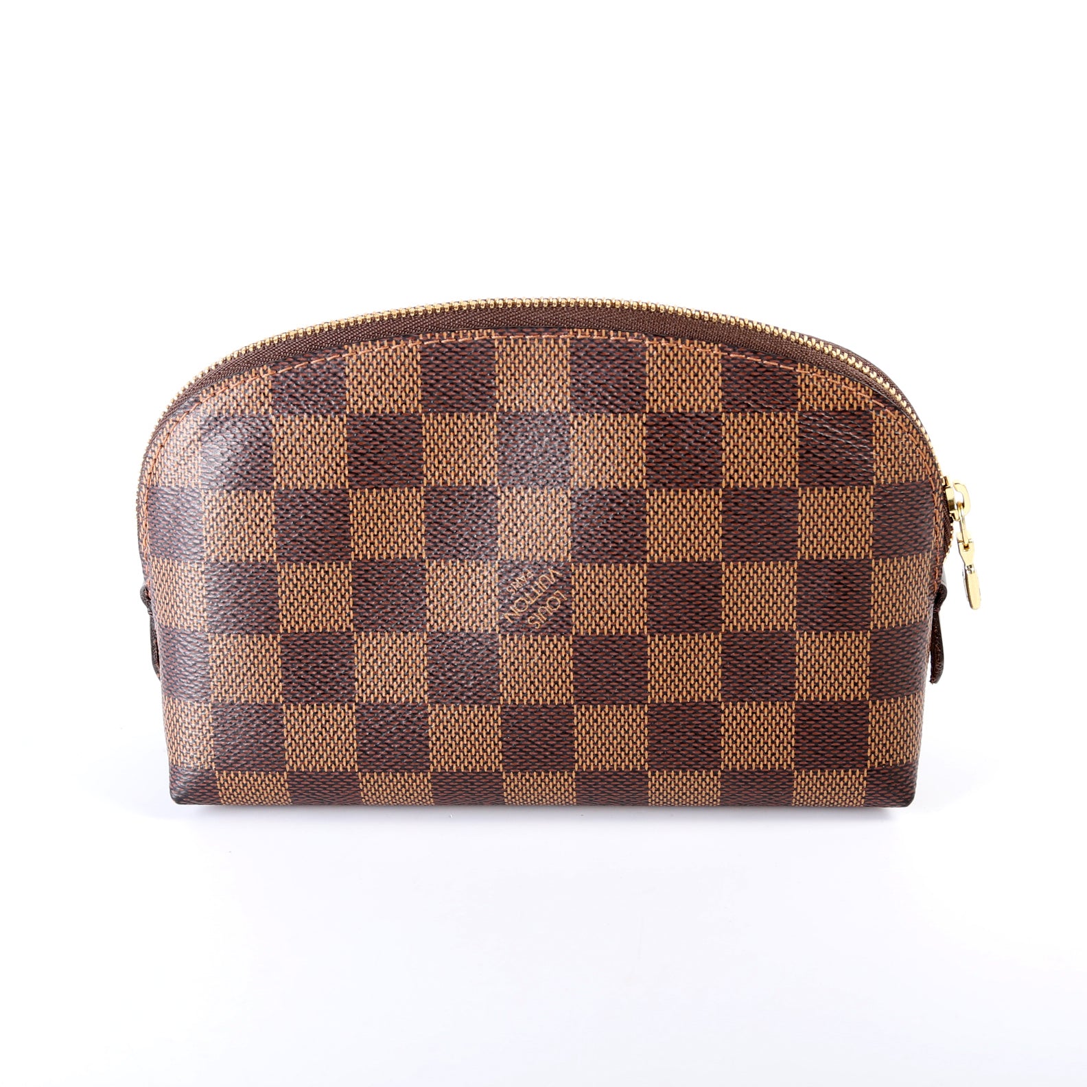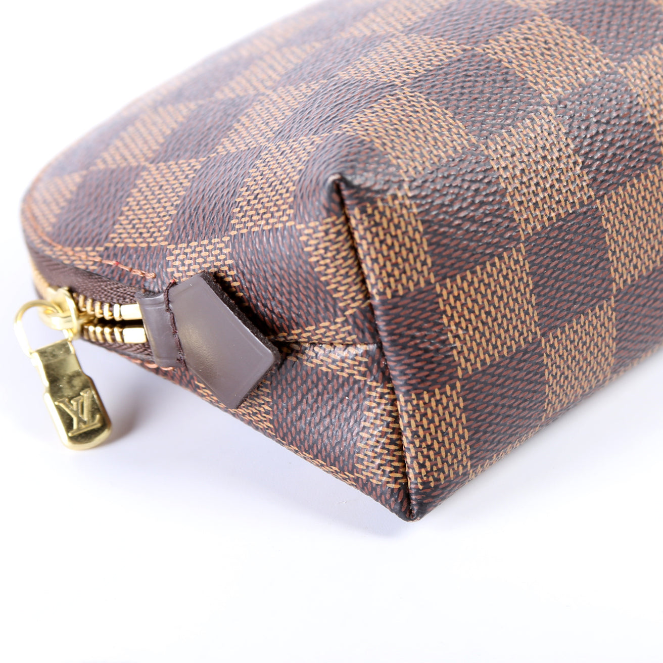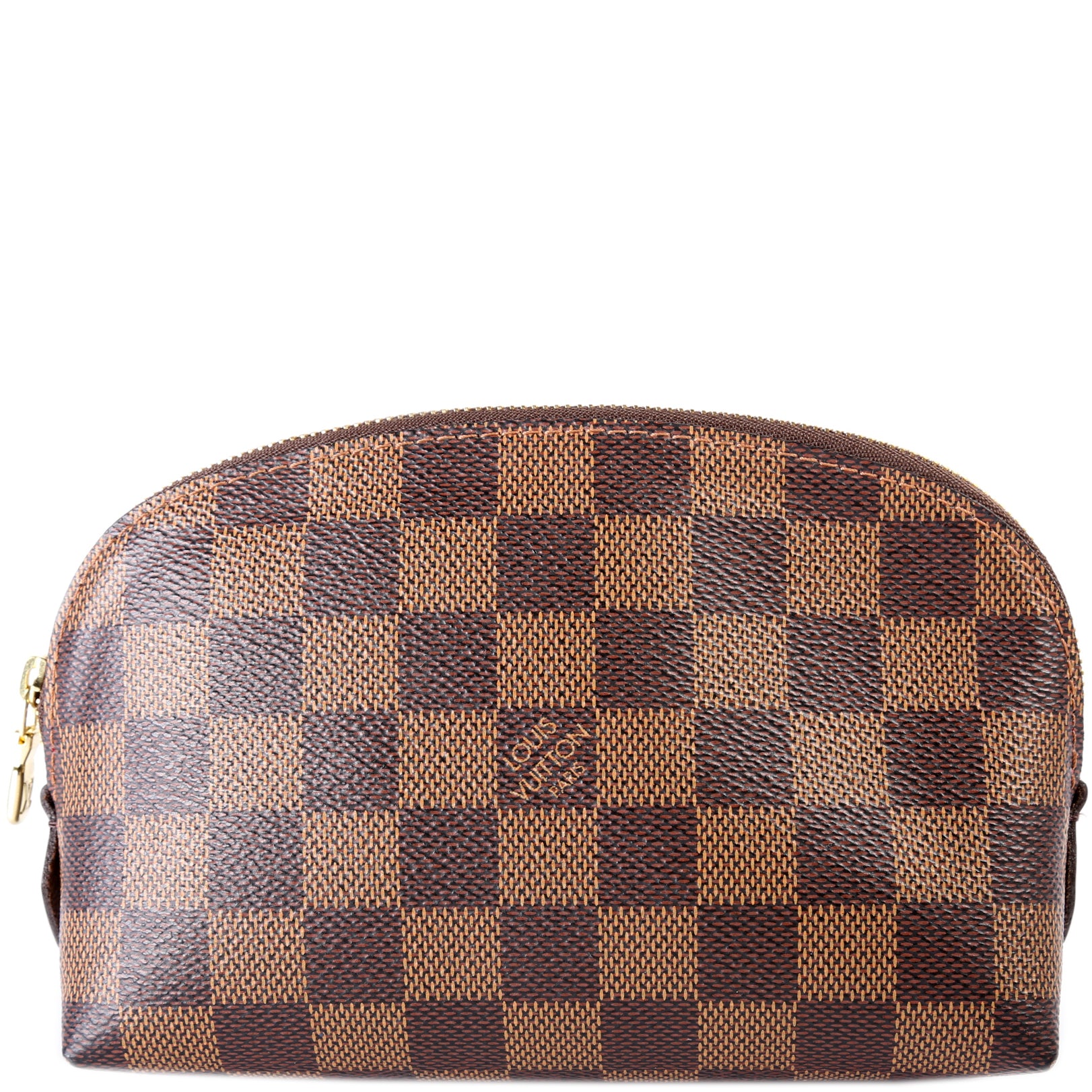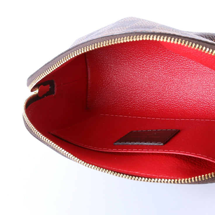 This pre-owned Louis Vuitton Cosmetic Pouch PM is guaranteed 100% authentic. The exterior is in the classic Louis Vuitton Damier Ebene coated canvas.