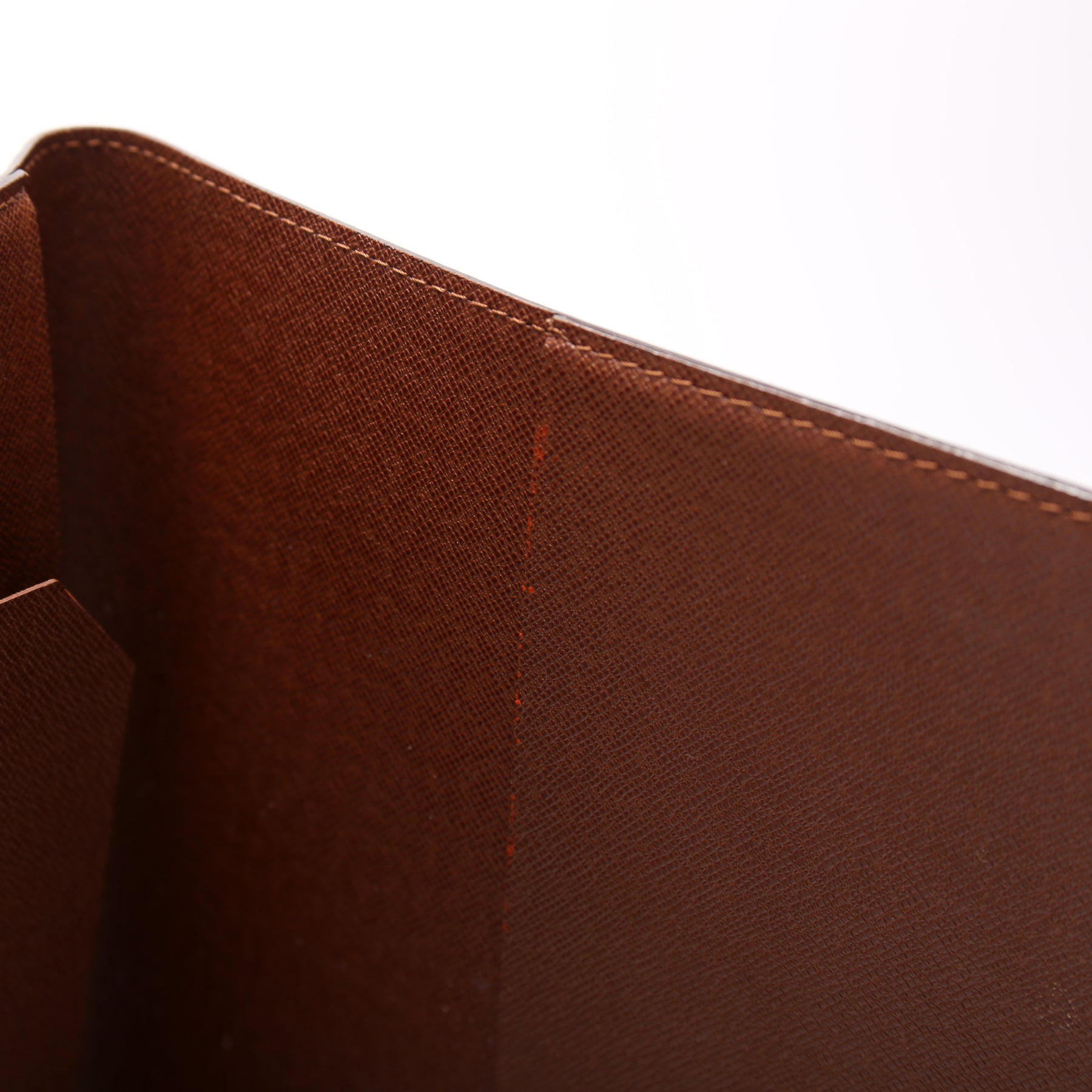 Interior: The interior is free of rips or tears. There are white marks to the interior throughout. There are red marks on the right along the edge of the pocket. The interior features five pockets.
