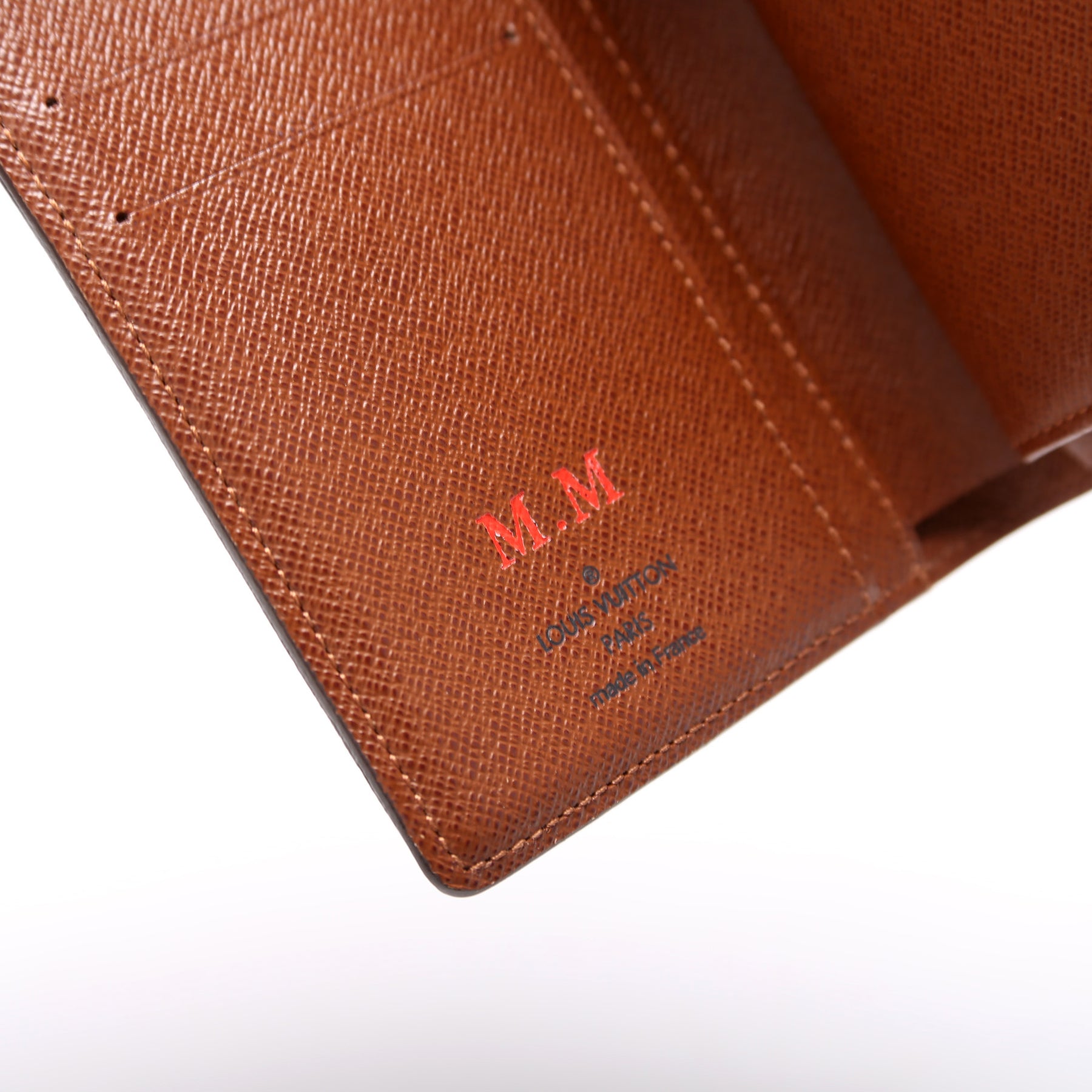 Interior: The interior is clean and features four card slots, two additional open pockets, and one bill slot. There is a heat stamp with the initials "M.M".