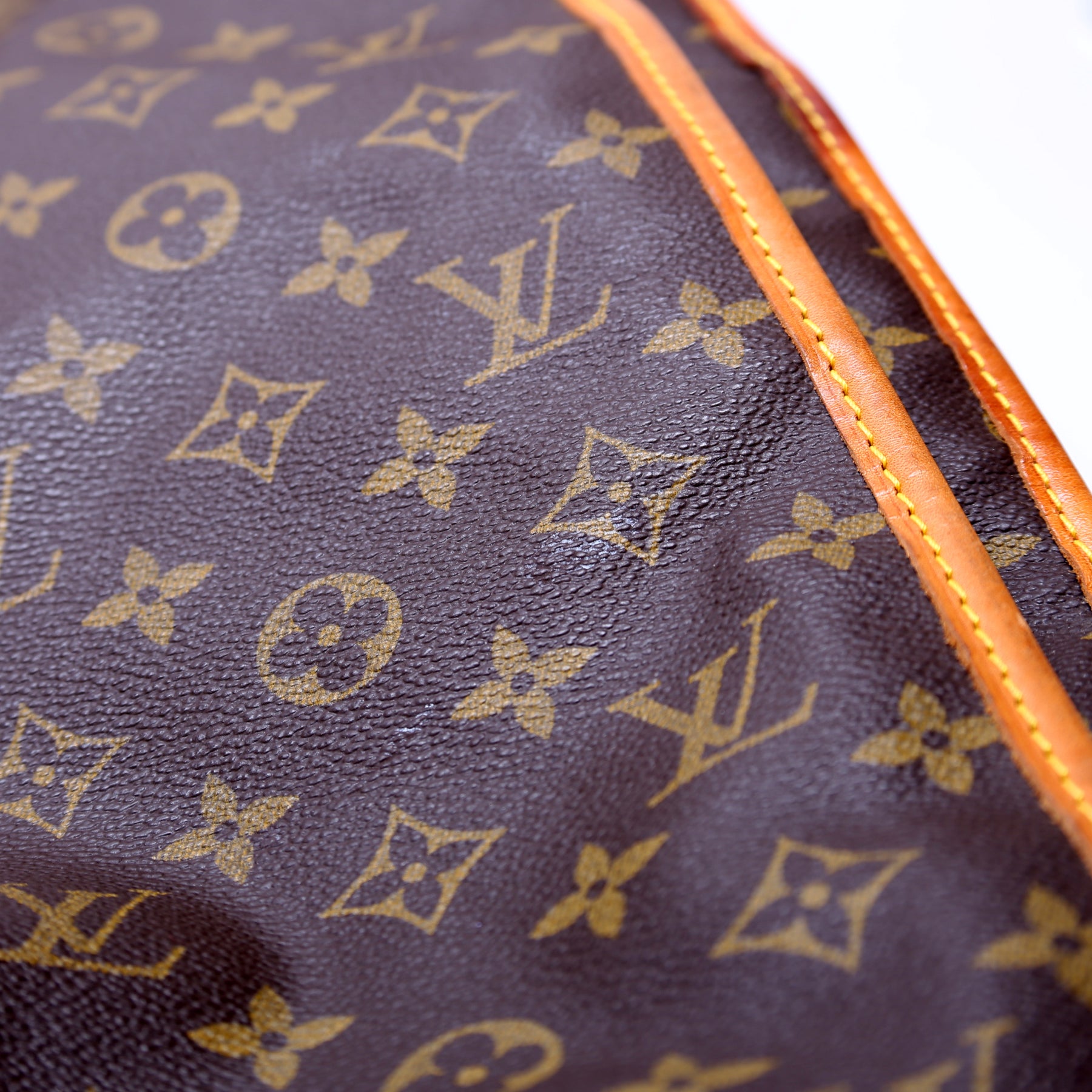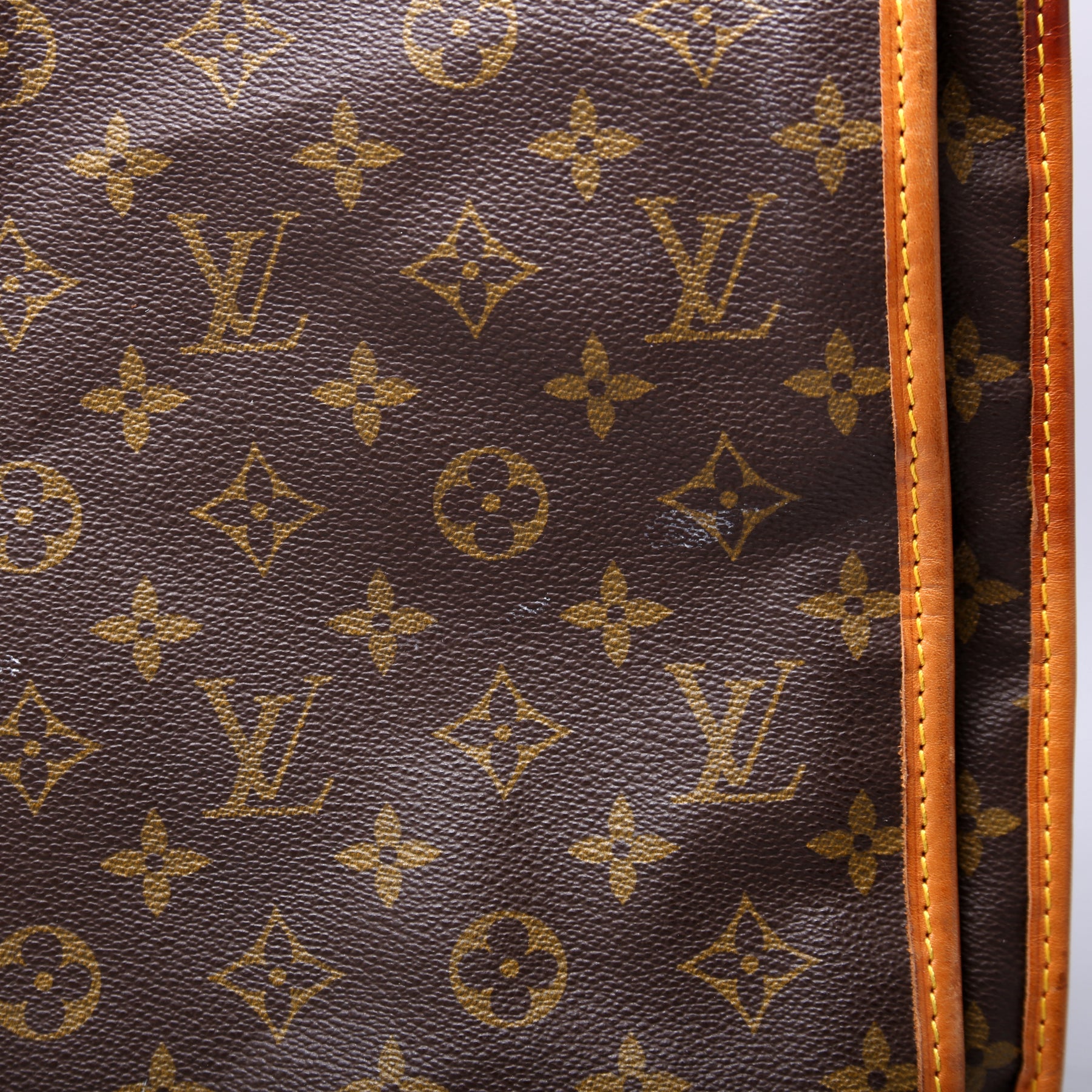 Exterior: The exterior coated canvas is free of any rips or cracks, there are minor scuffs throughout. The corners and leather trim show heavy signs of wear and discoloration as pictured. The exterior features one zipper pocket.