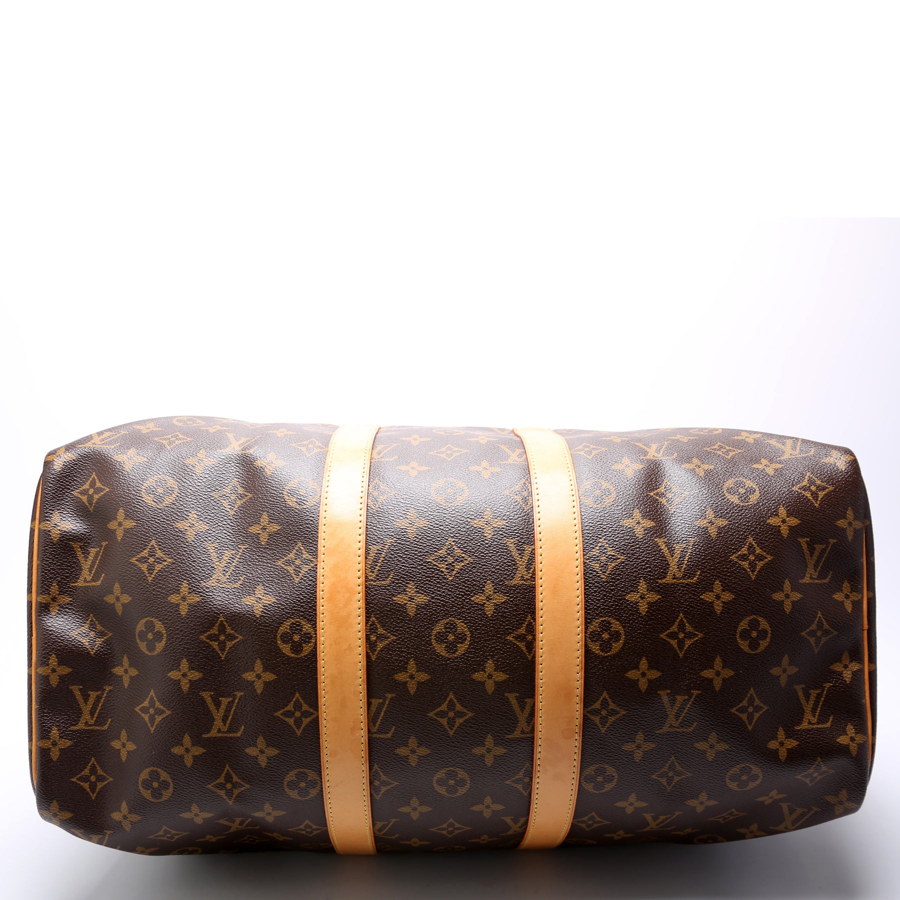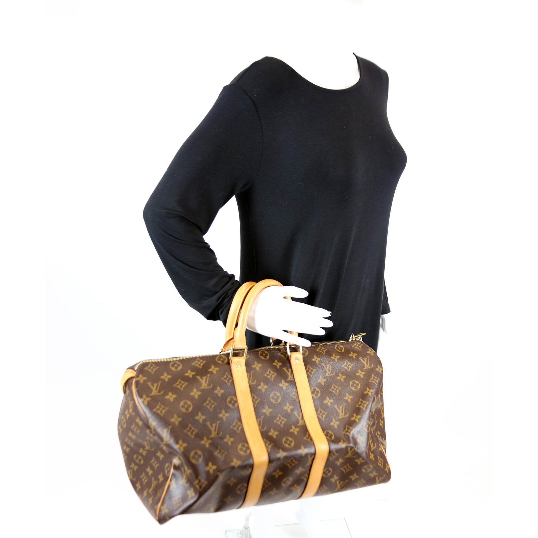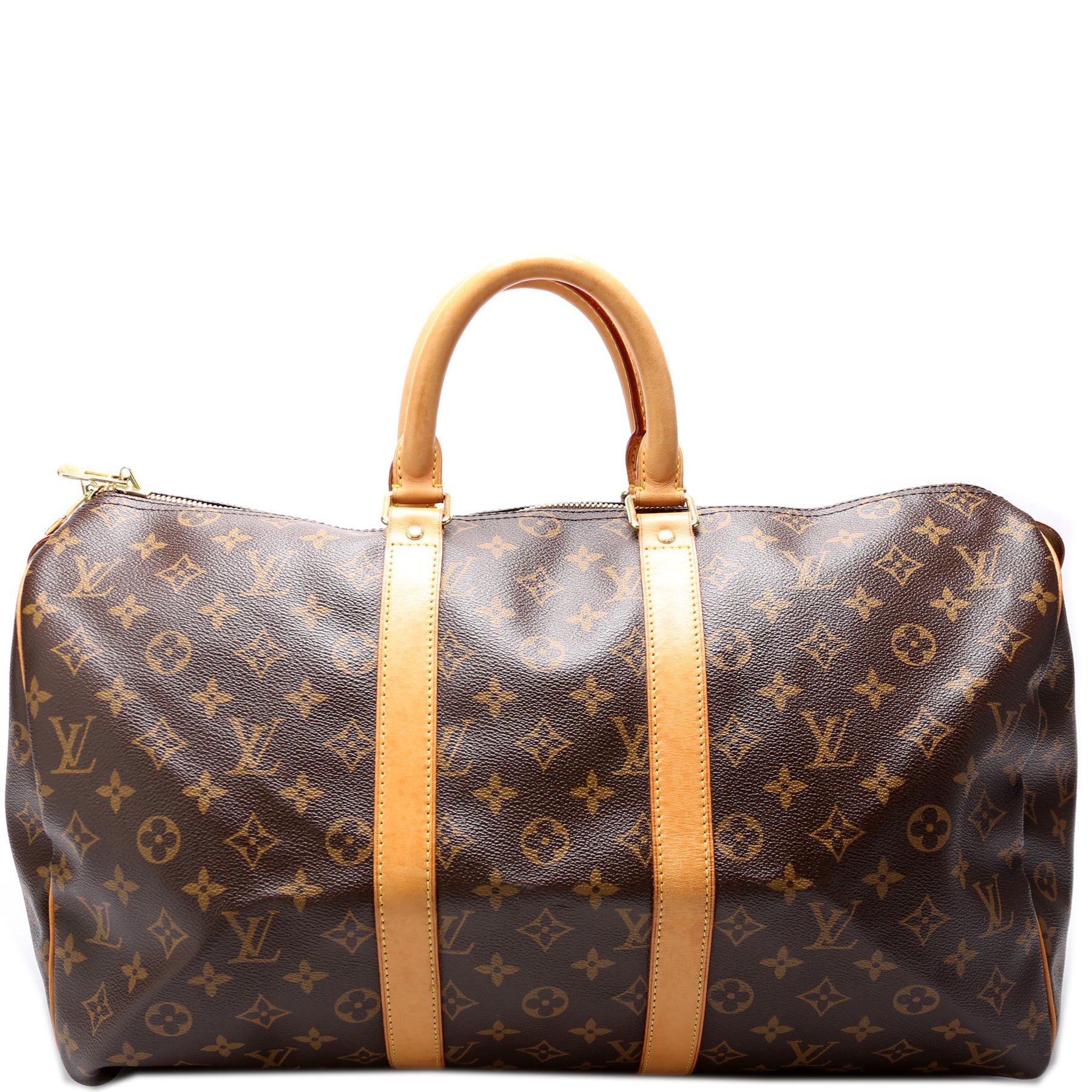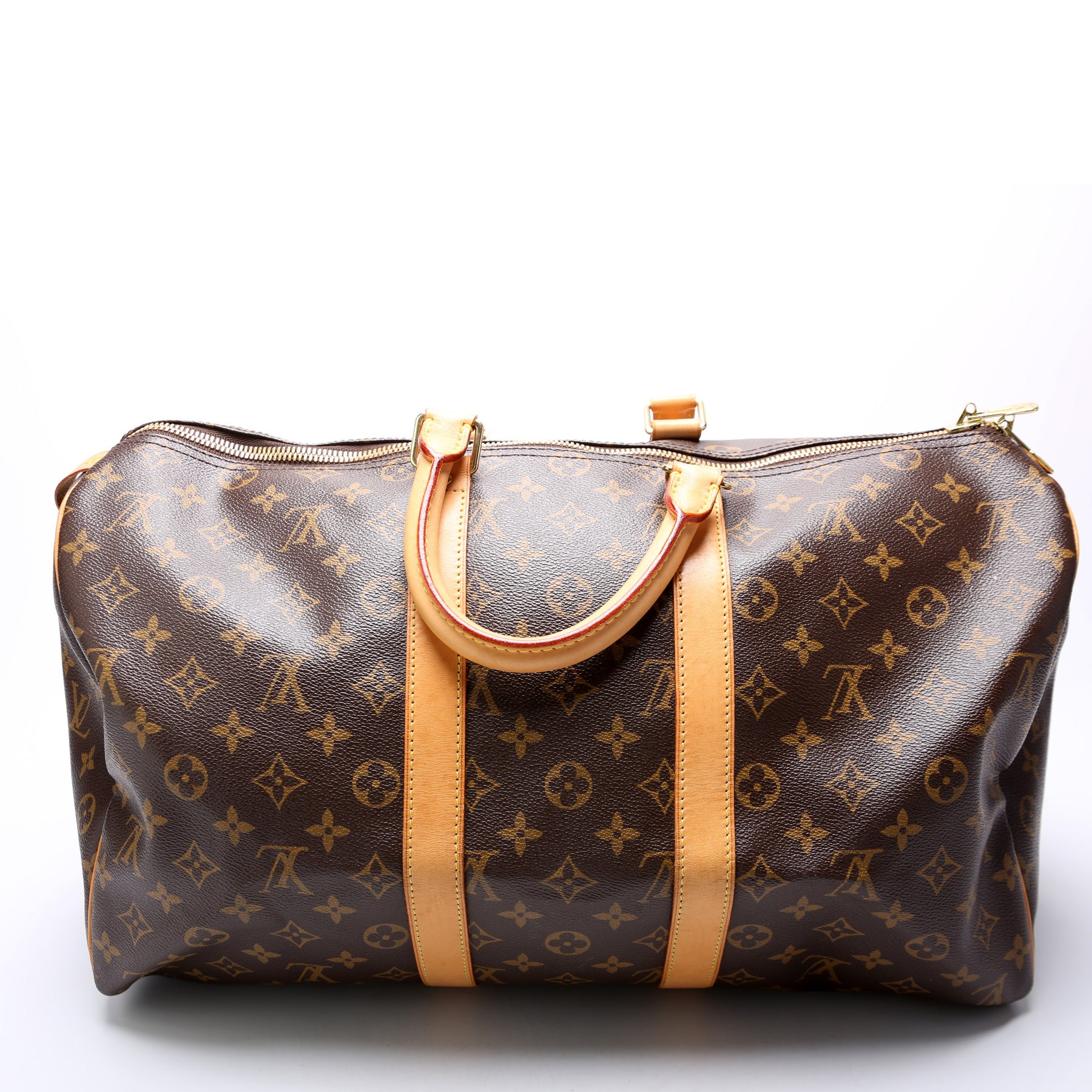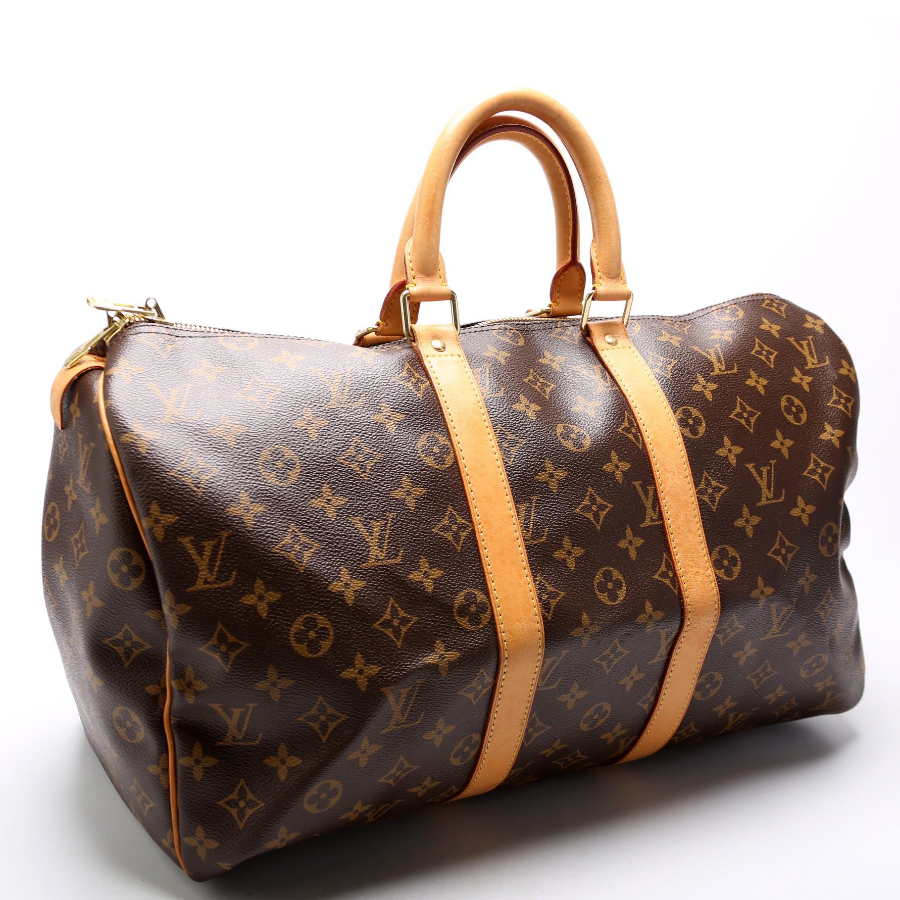 This pre-owned Louis Vuitton Keepall 45 Mono is guaranteed 100% authentic. The exterior is in the classic Louis Vuitton Monogram coated canvas.