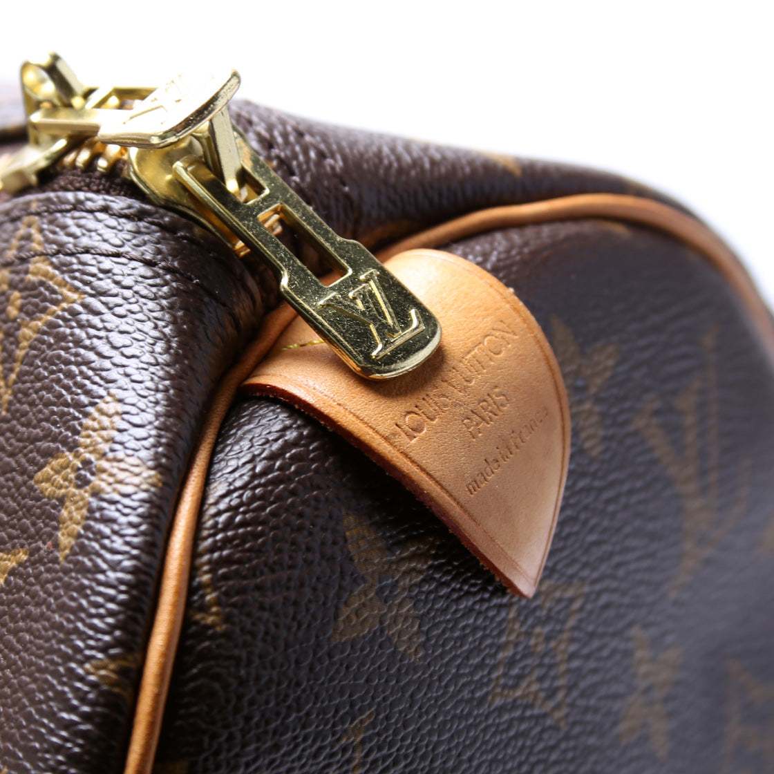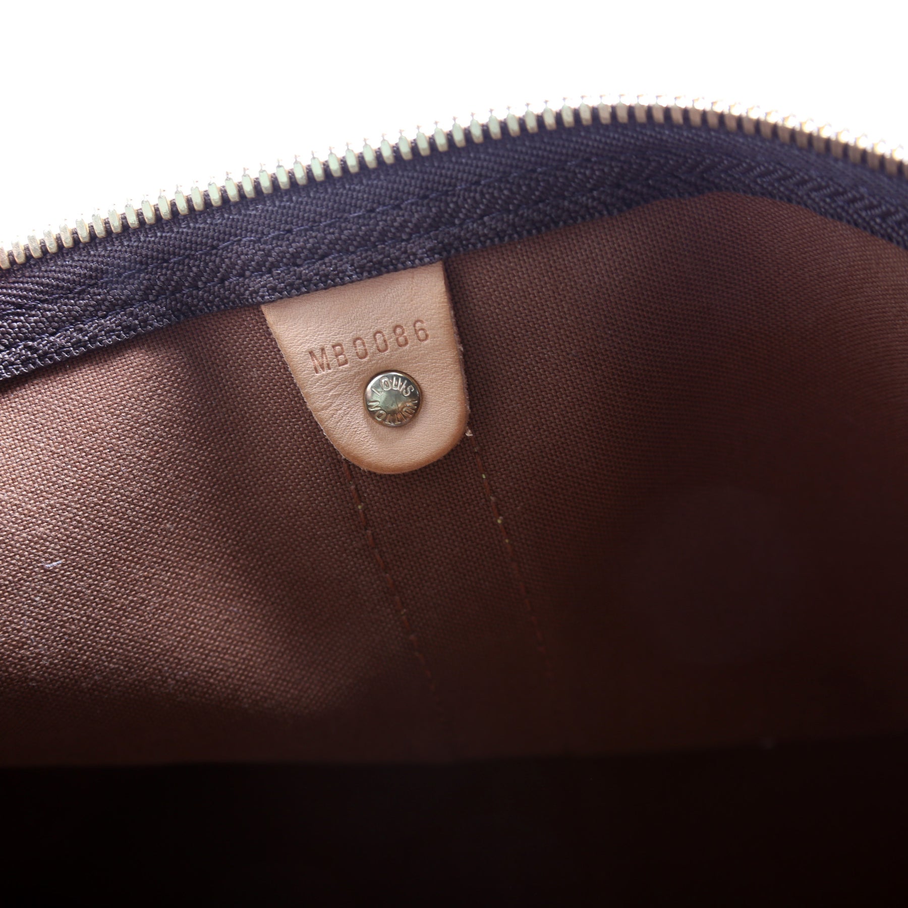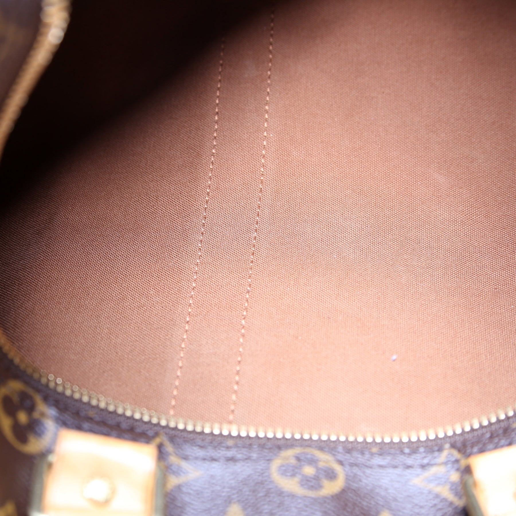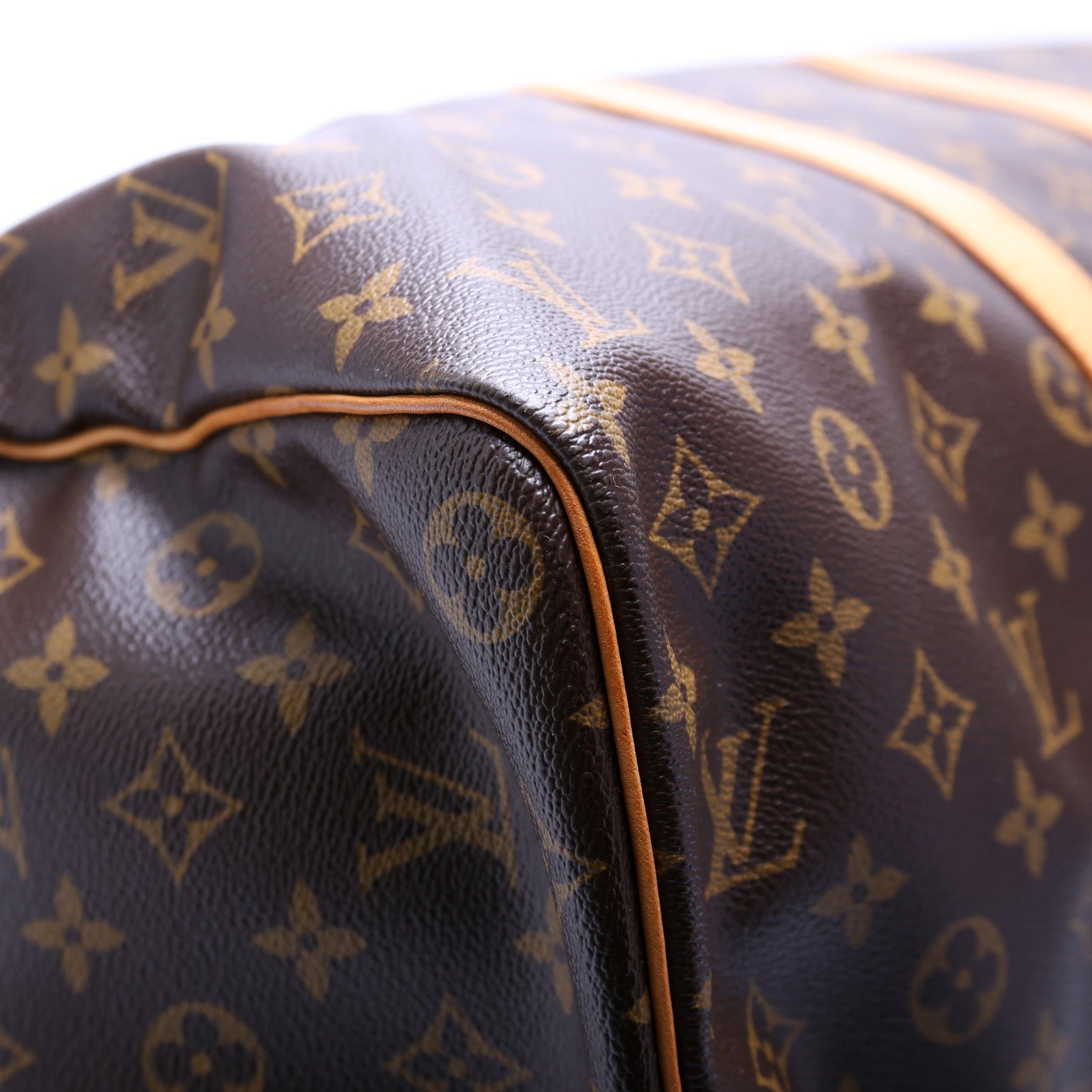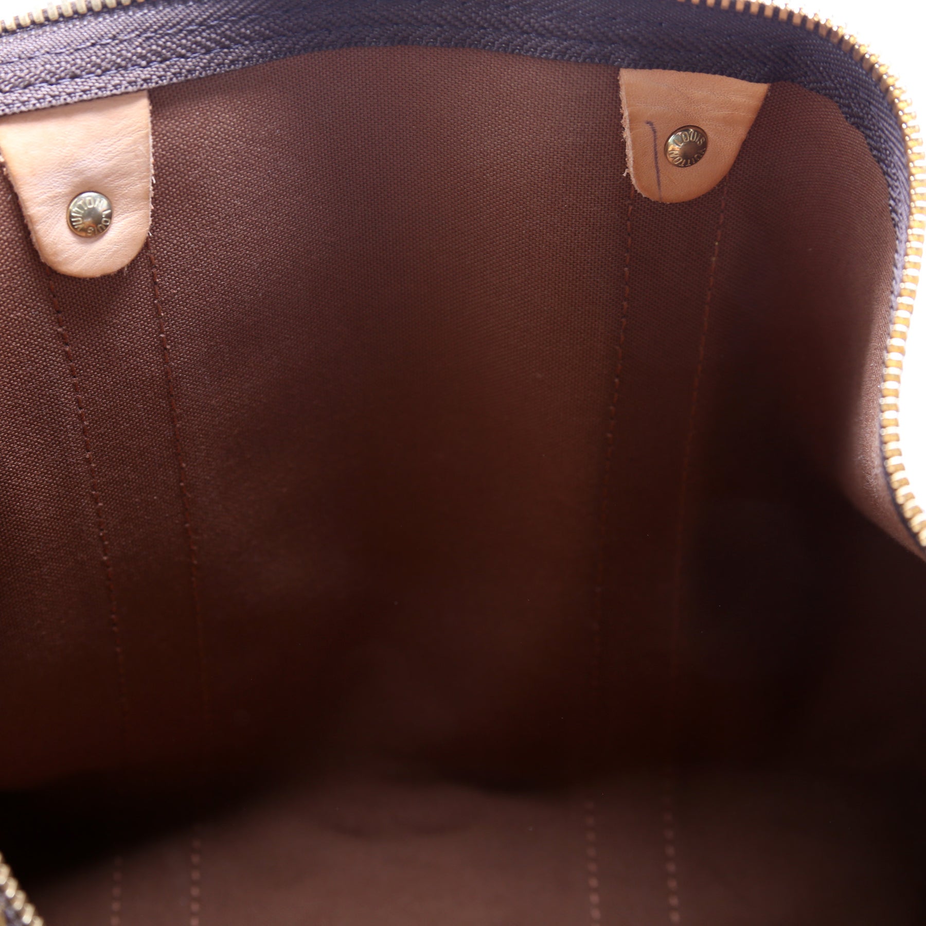 Exterior: The exterior coated canvas is free of any rips or cracks. The corners and leather details show minor wear and discoloration.
