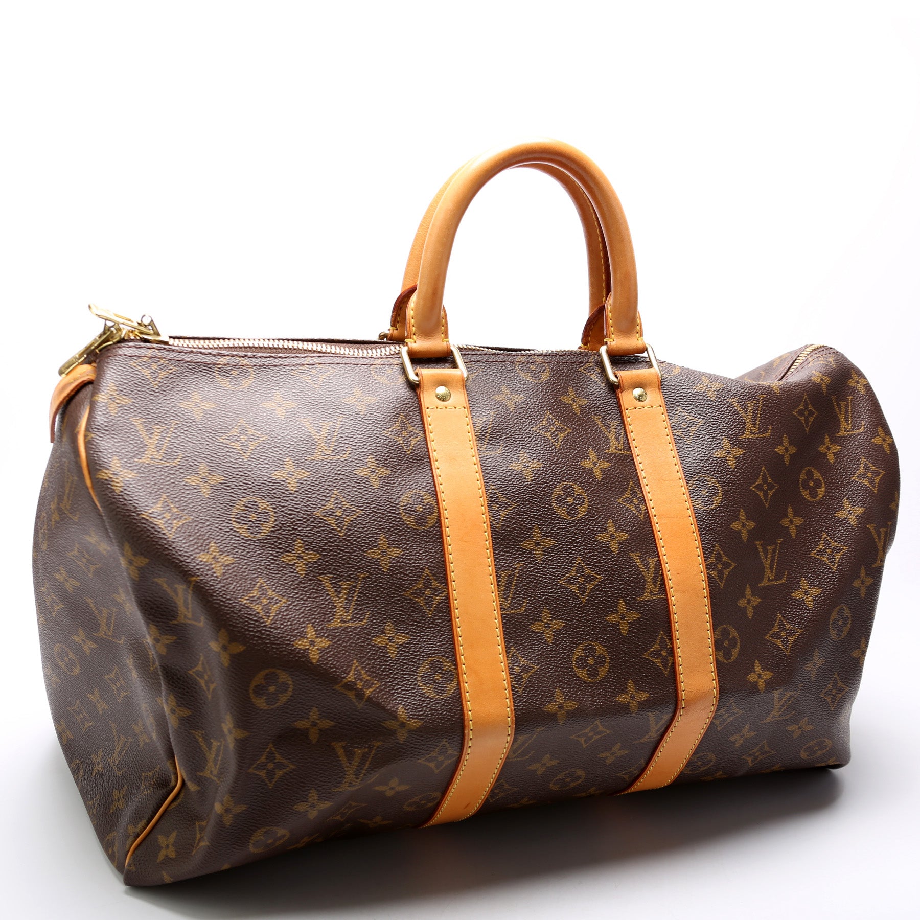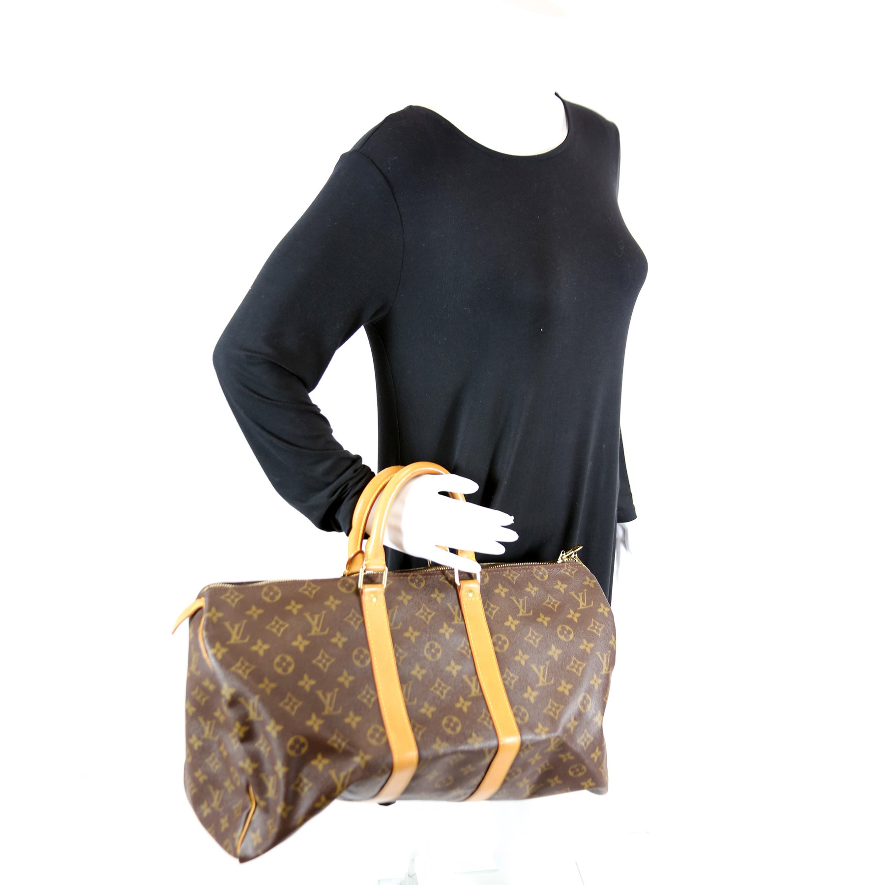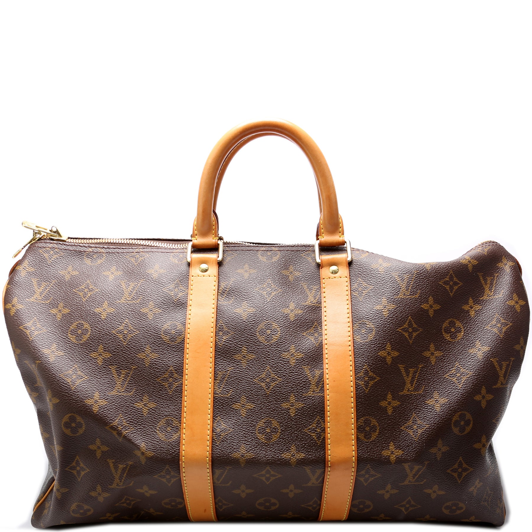This pre-owned Louis Vuitton Keepall 45 Mono is guaranteed 100% authentic. The exterior is in the classic Louis Vuitton Monogram coated canvas.