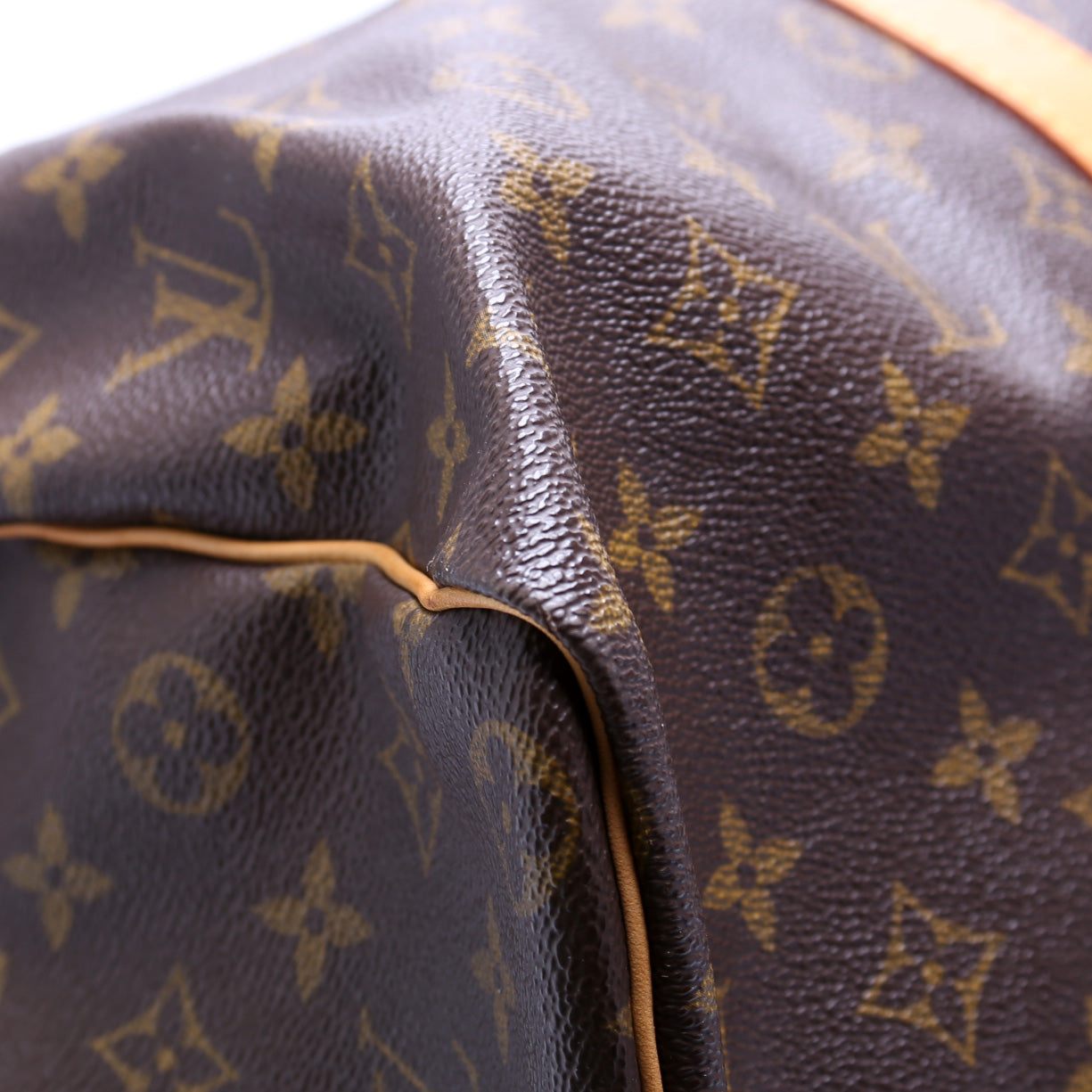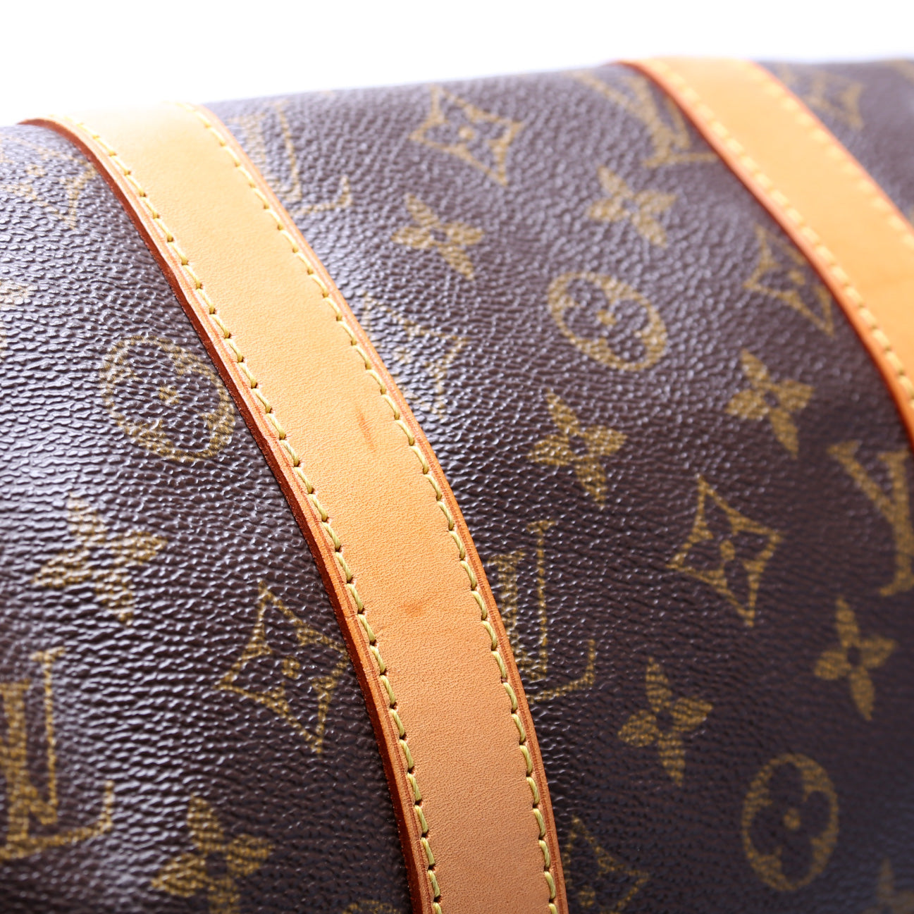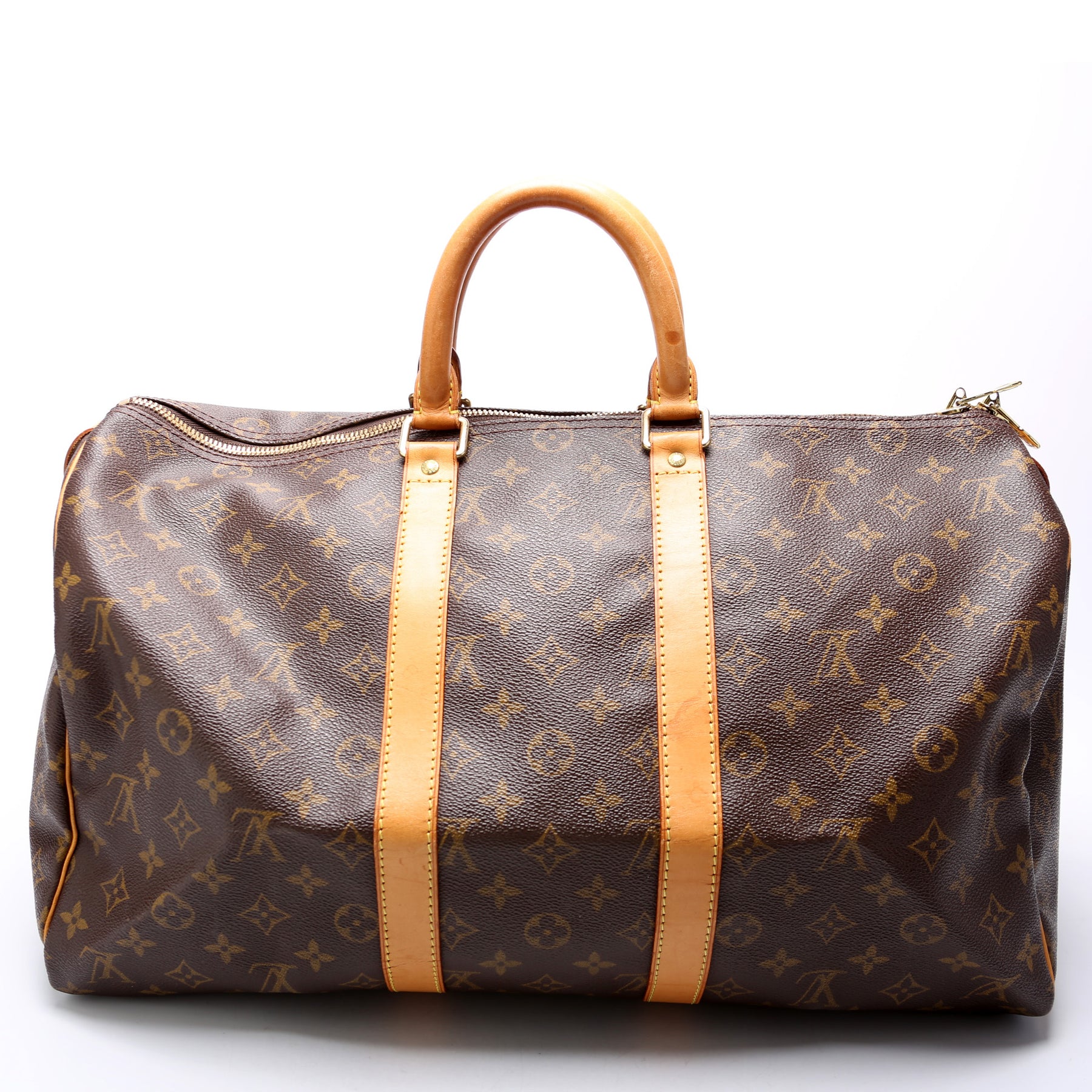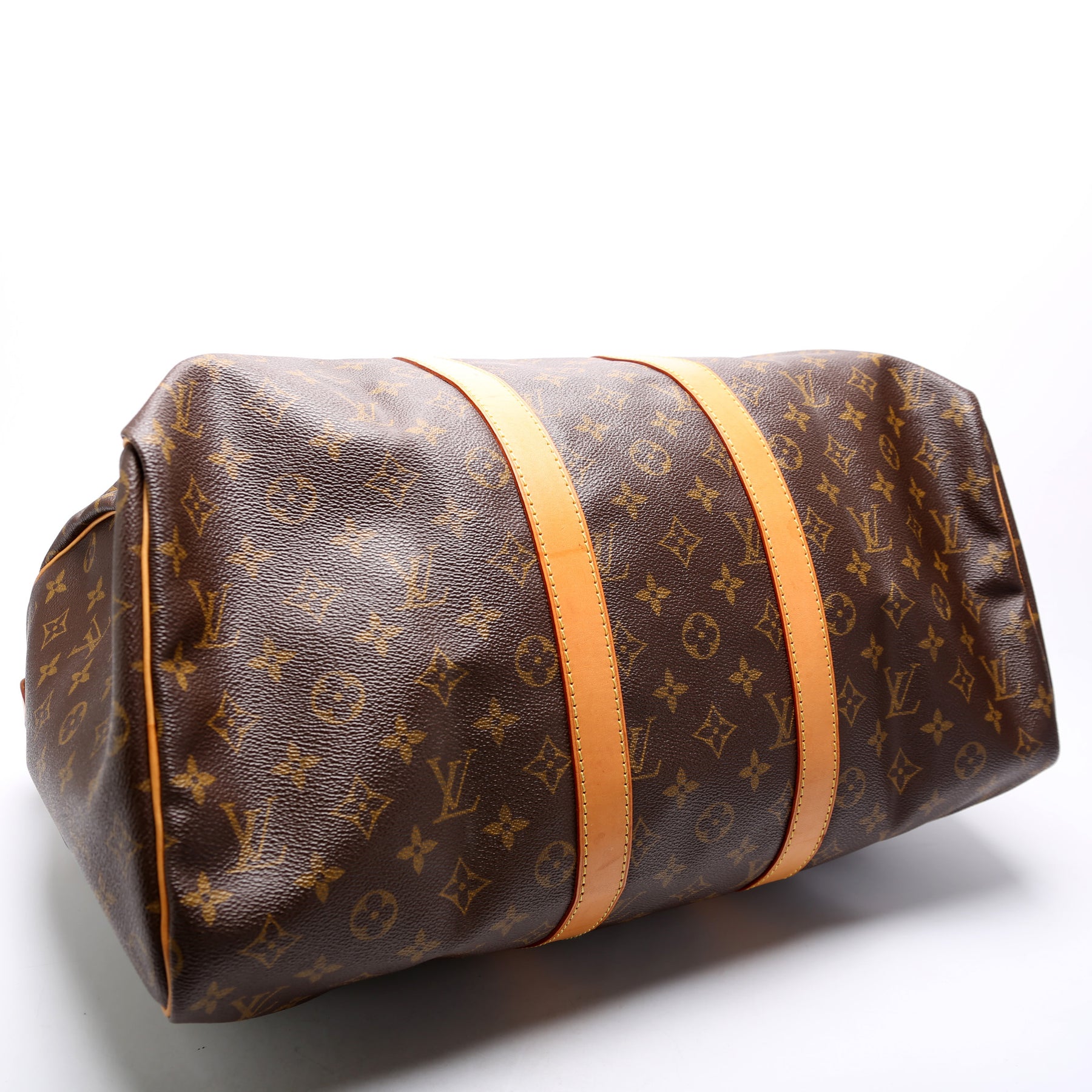 This pre-owned Louis Vuitton Keepall 45 Mono is guaranteed 100% authentic. The exterior is in the classic Louis Vuitton Monogram coated canvas.