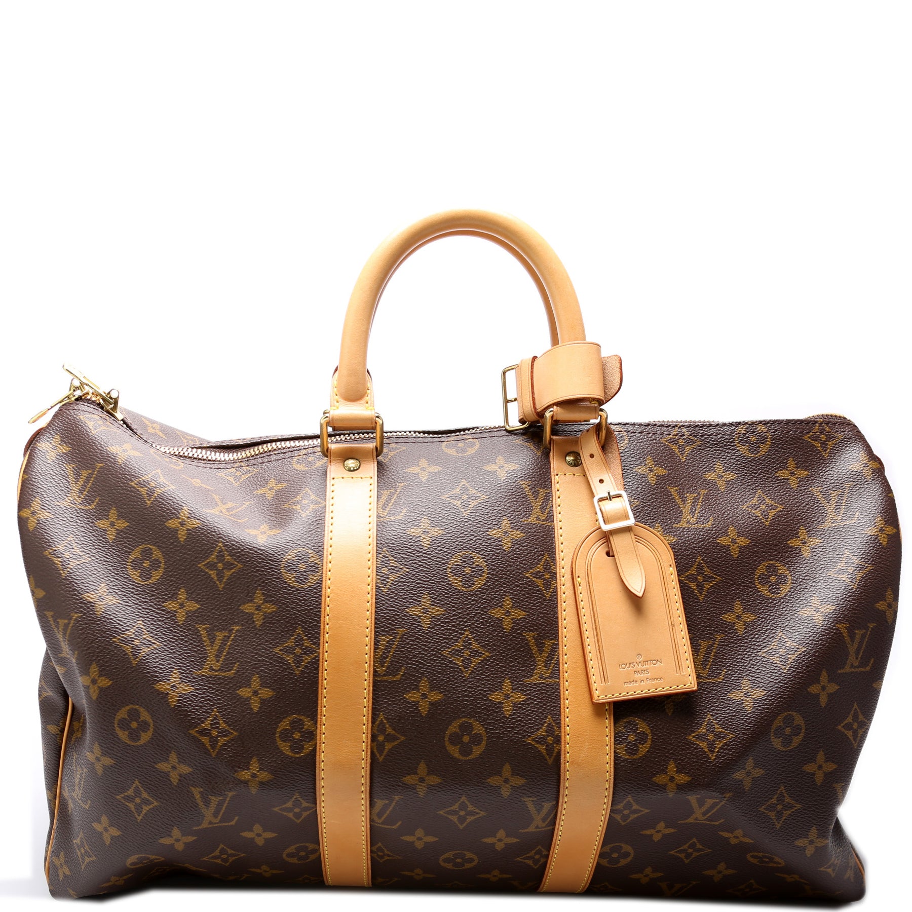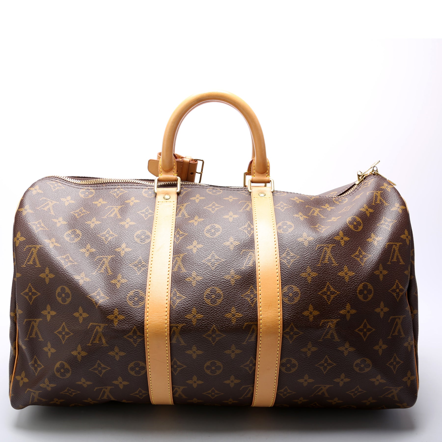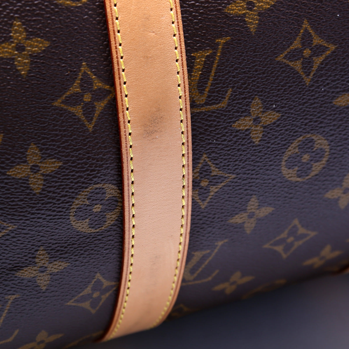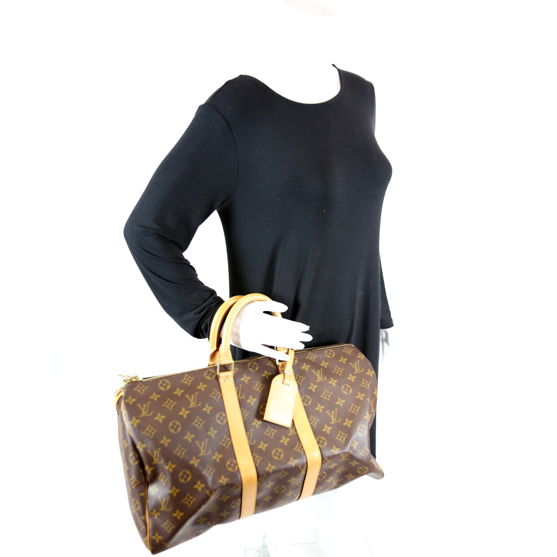 This pre-owned Louis Vuitton Keepall 45 is guaranteed 100% authentic. The exterior is in the classic Louis Vuitton Monogram coated canvas.