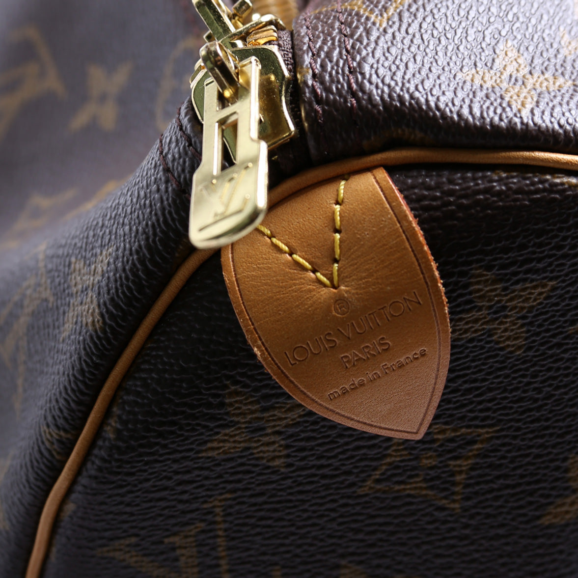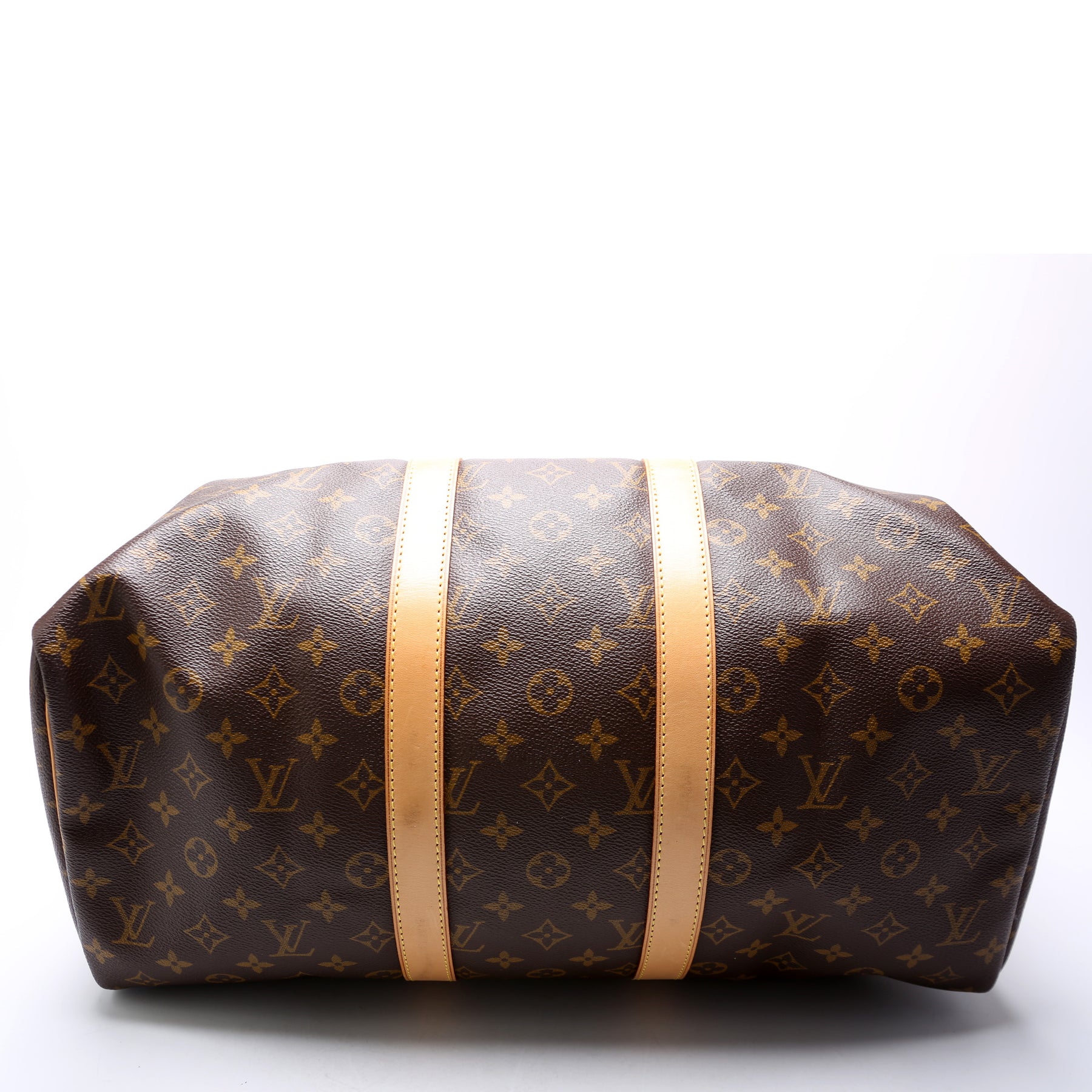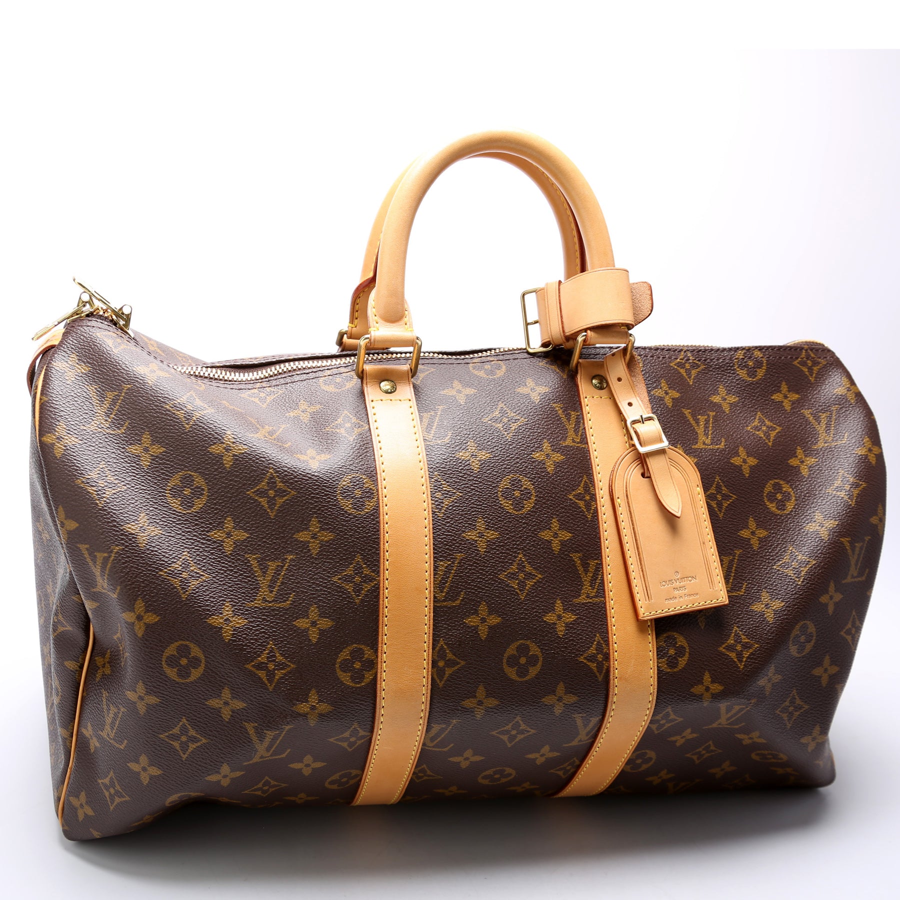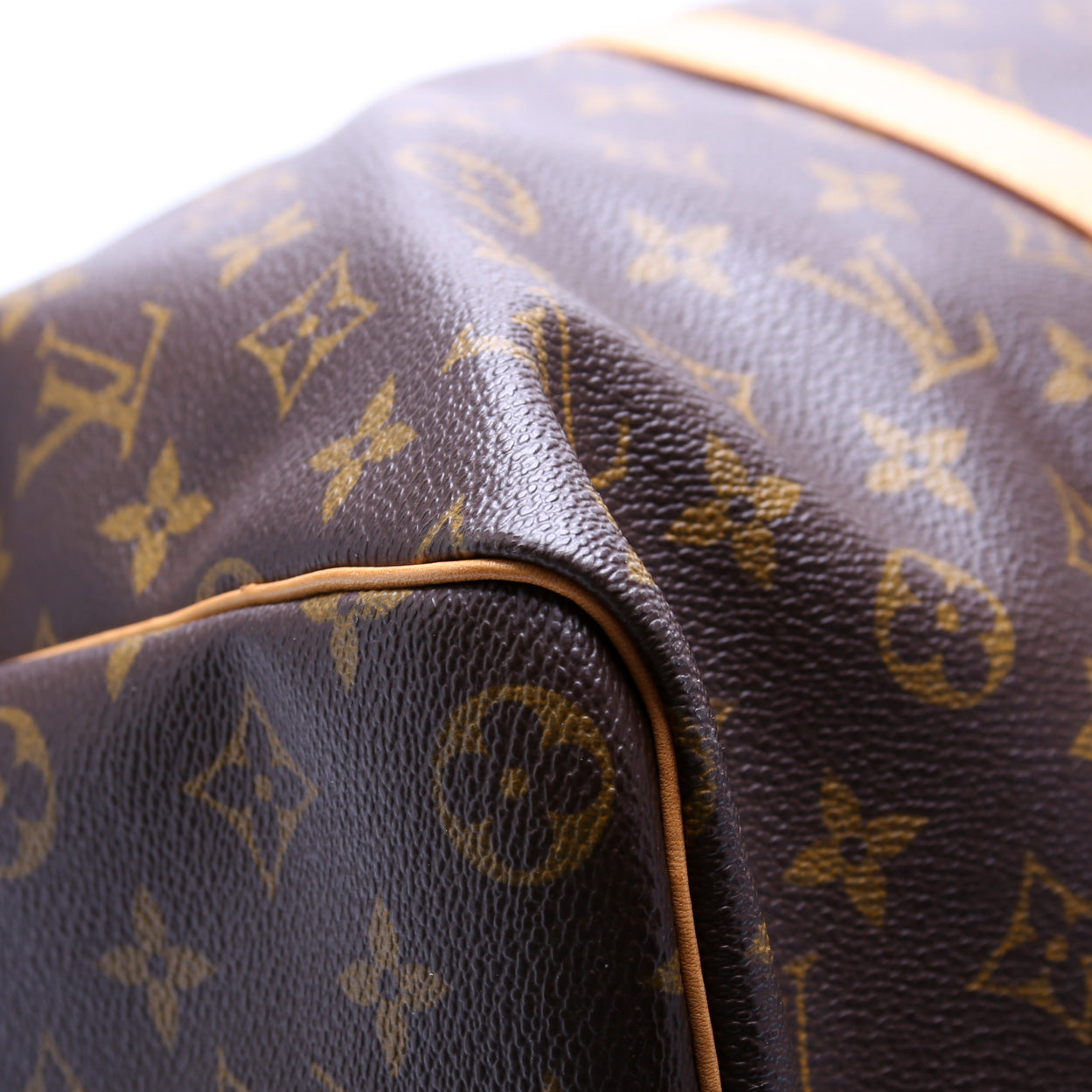 This pre-owned Louis Vuitton Keepall 45 is guaranteed 100% authentic. The exterior is in the classic Louis Vuitton Monogram coated canvas.