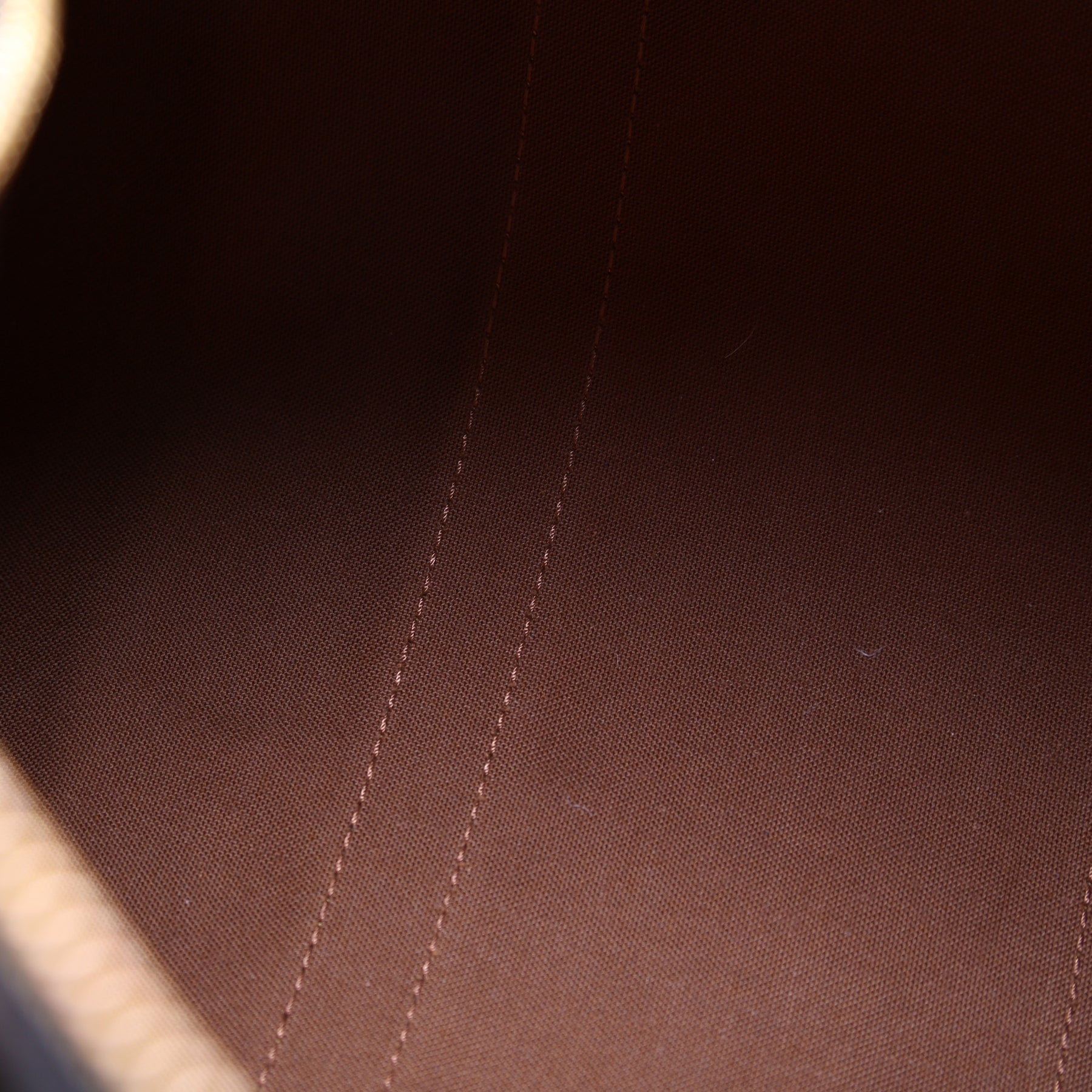 Exterior: The exterior coated canvas is free of any rips or cracks. The corners and leather details show minor discoloration.