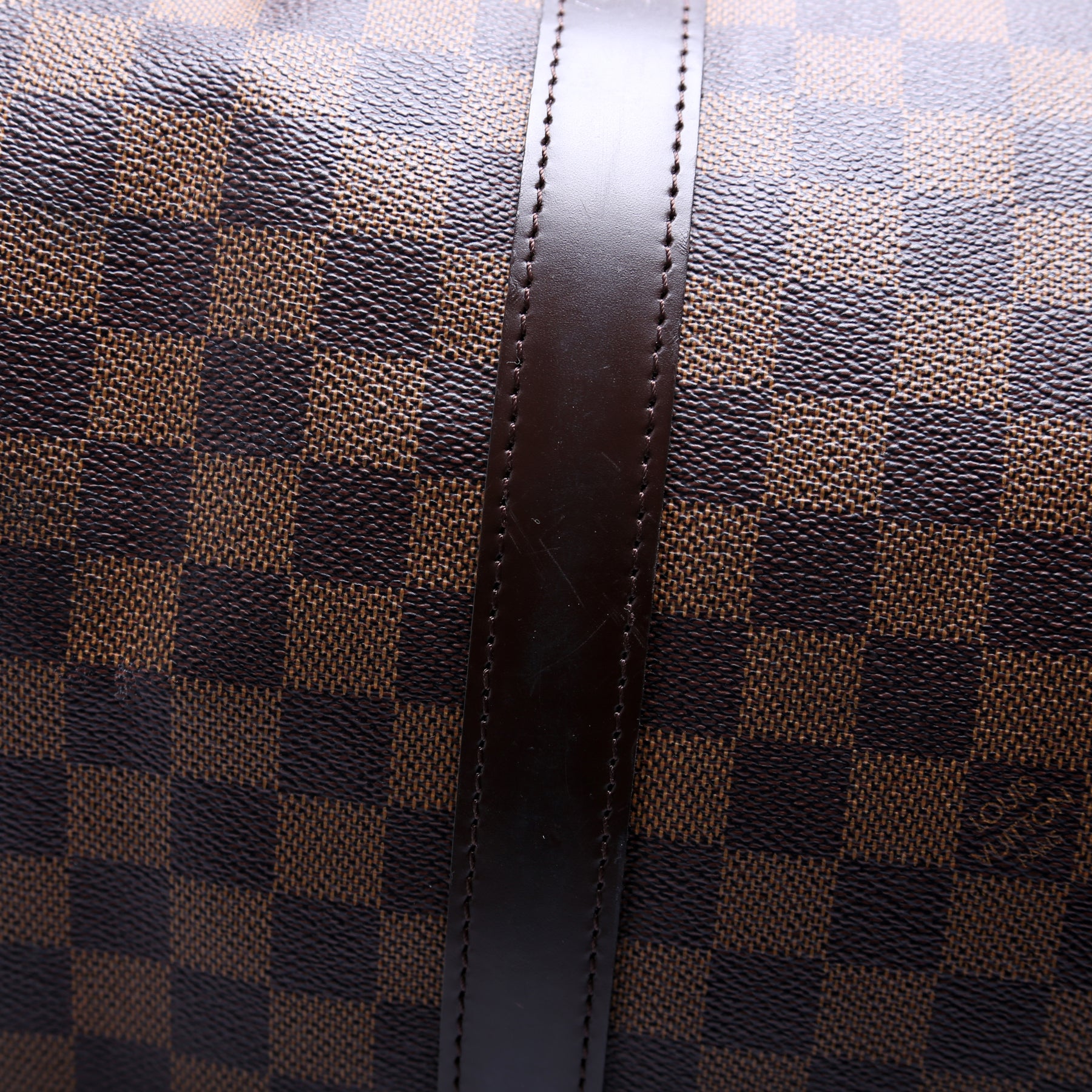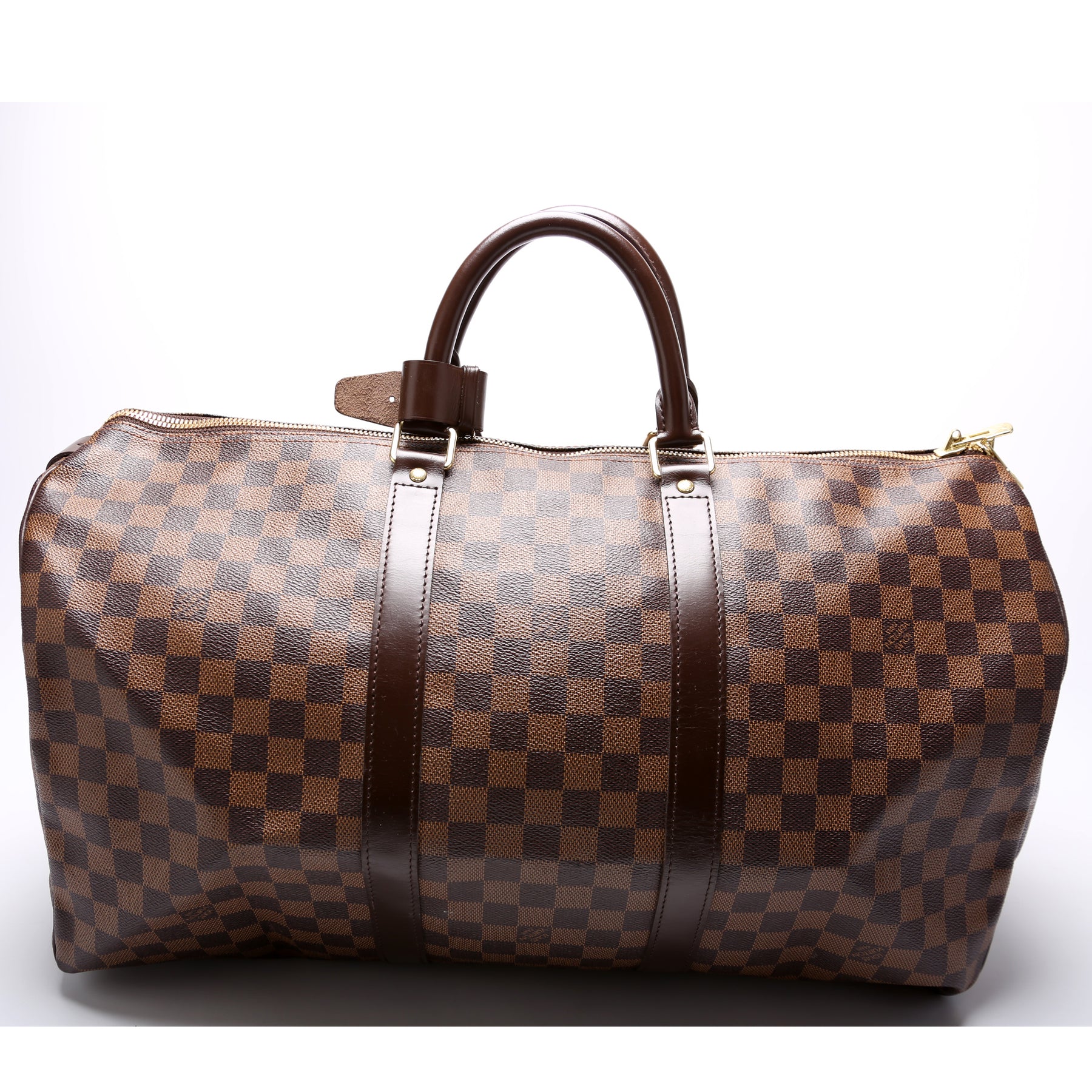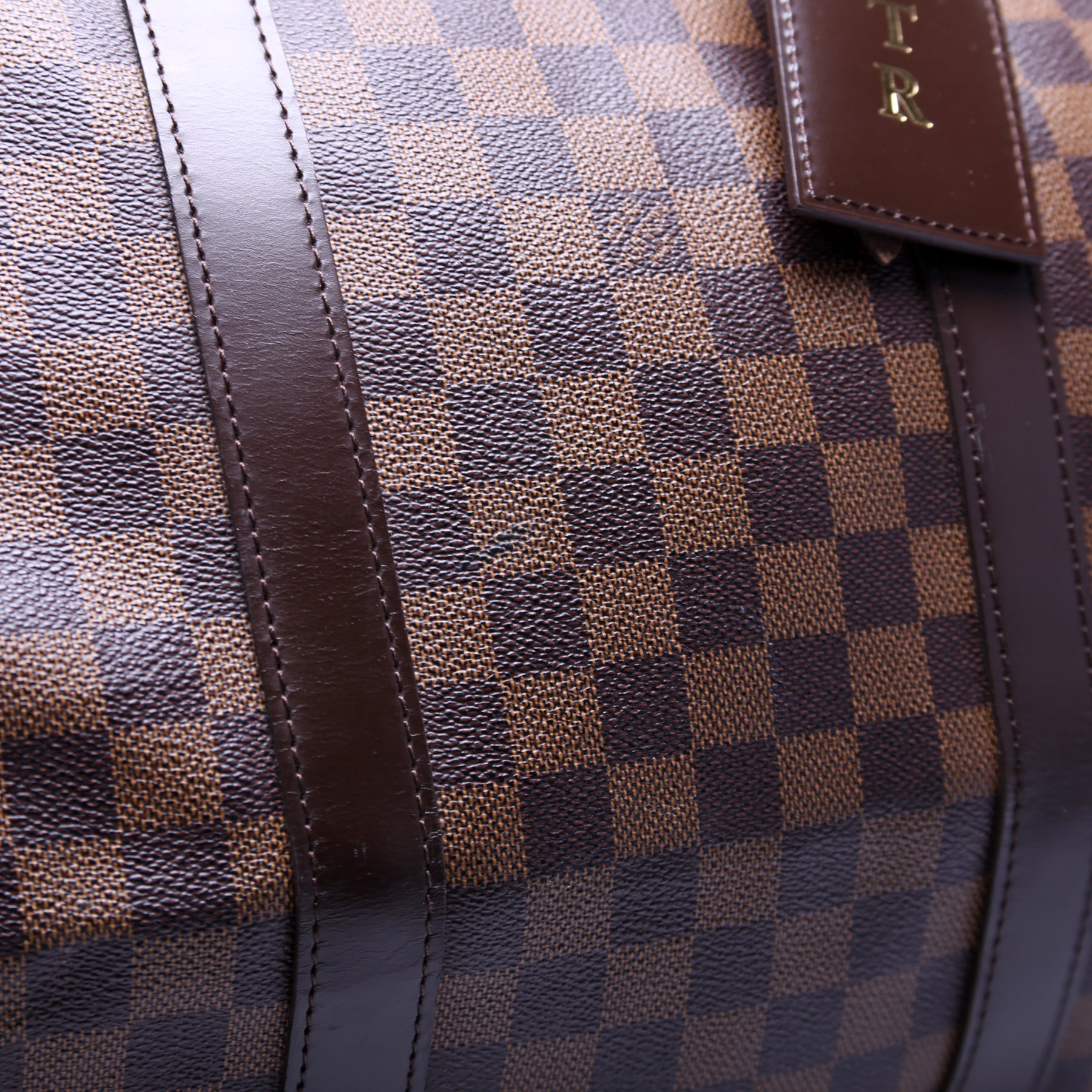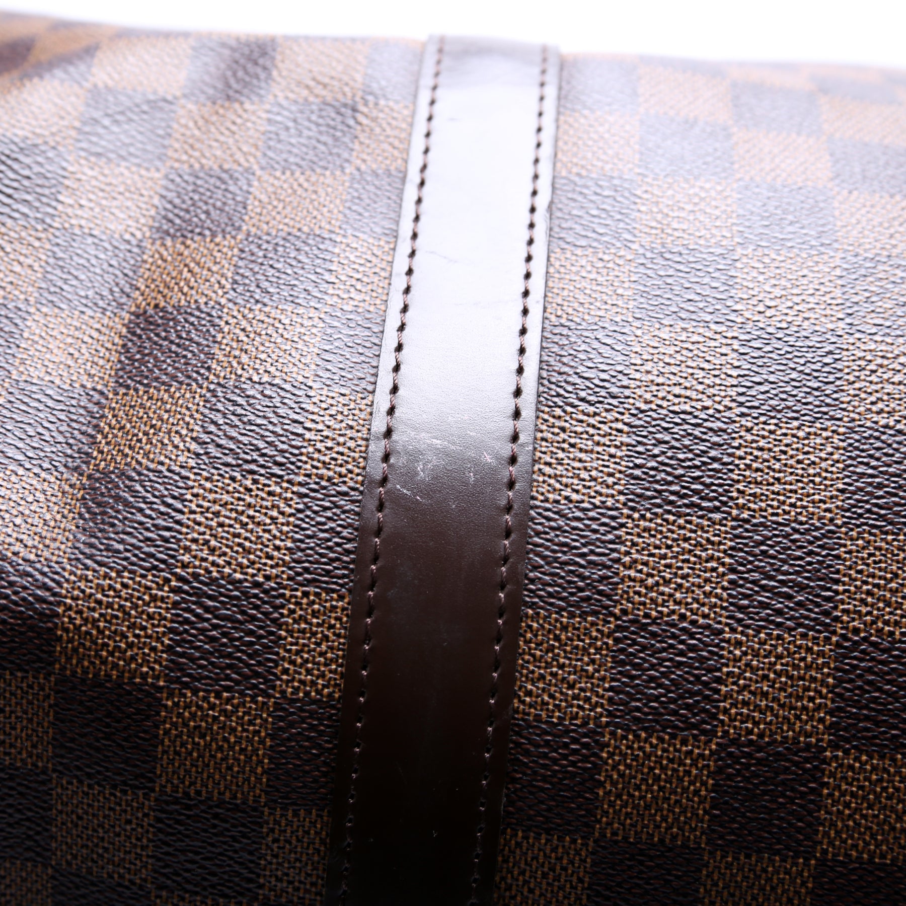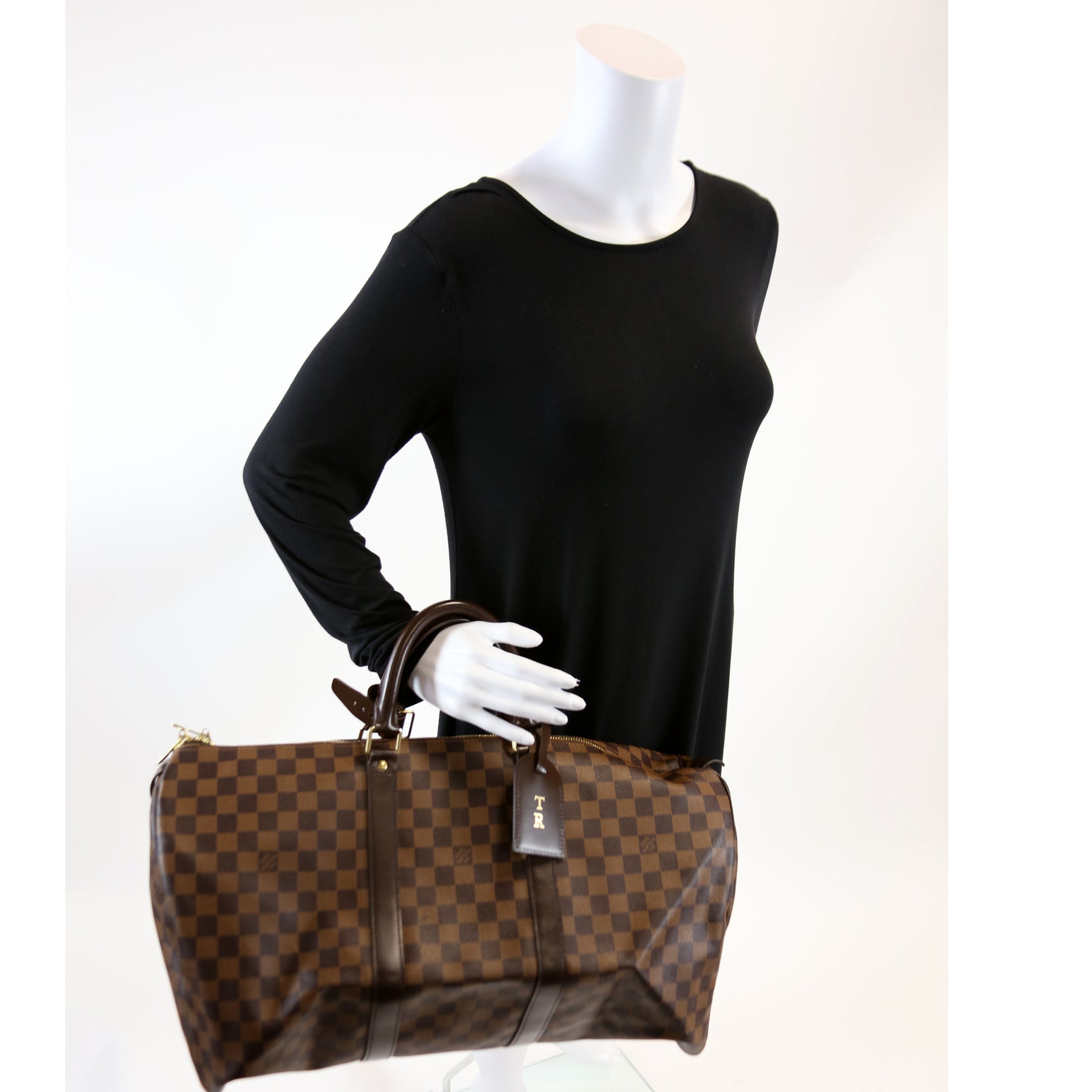 This pre-owned Louis Vuitton Keepall 50 is guaranteed 100% authentic. The exterior is in the classic Louis Vuitton Damier Ebene coated canvas.