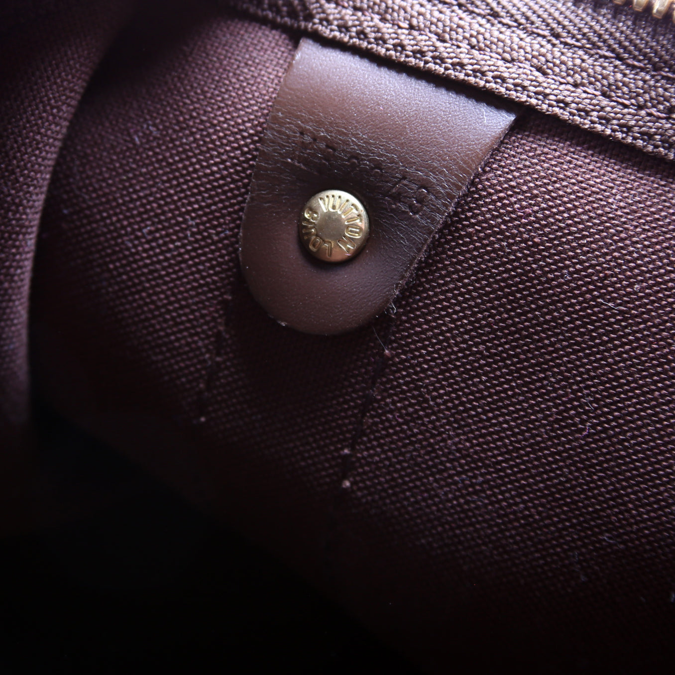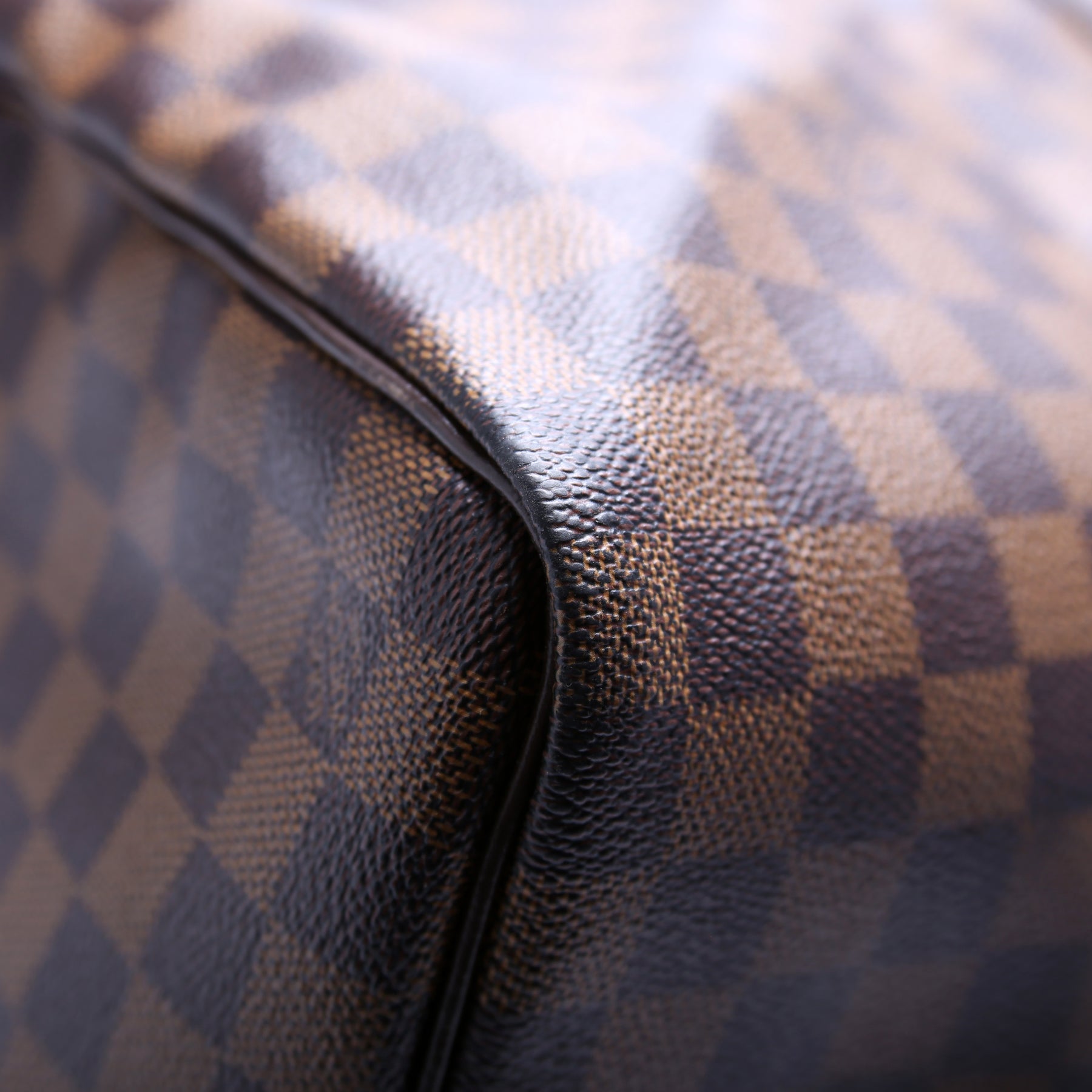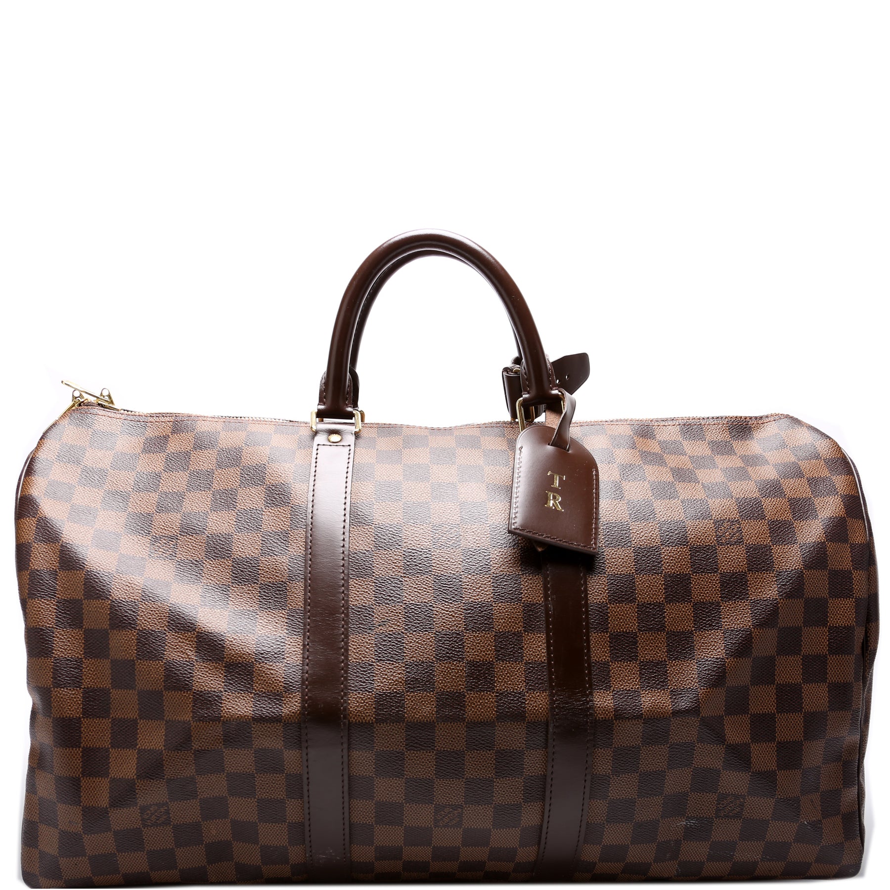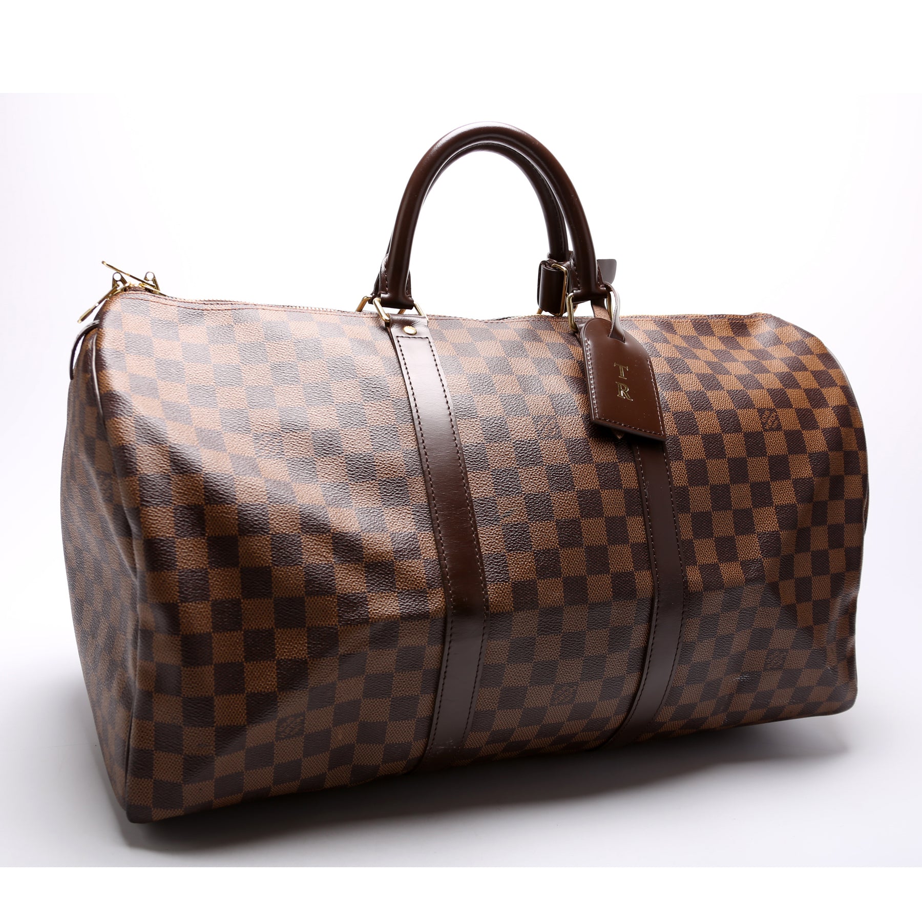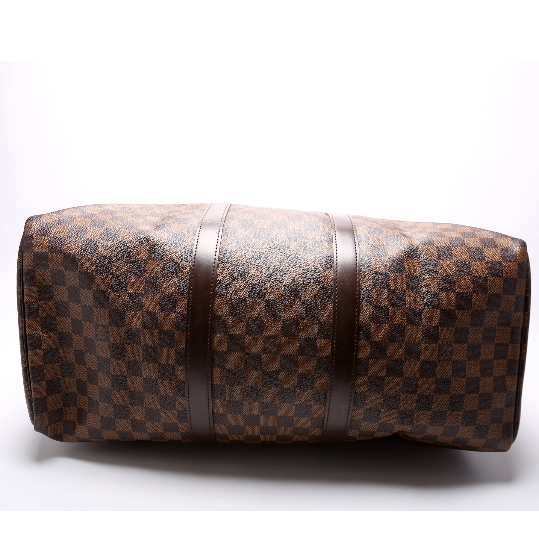 This pre-owned Louis Vuitton Keepall 50 is guaranteed 100% authentic. The exterior is in the classic Louis Vuitton Damier Ebene coated canvas.