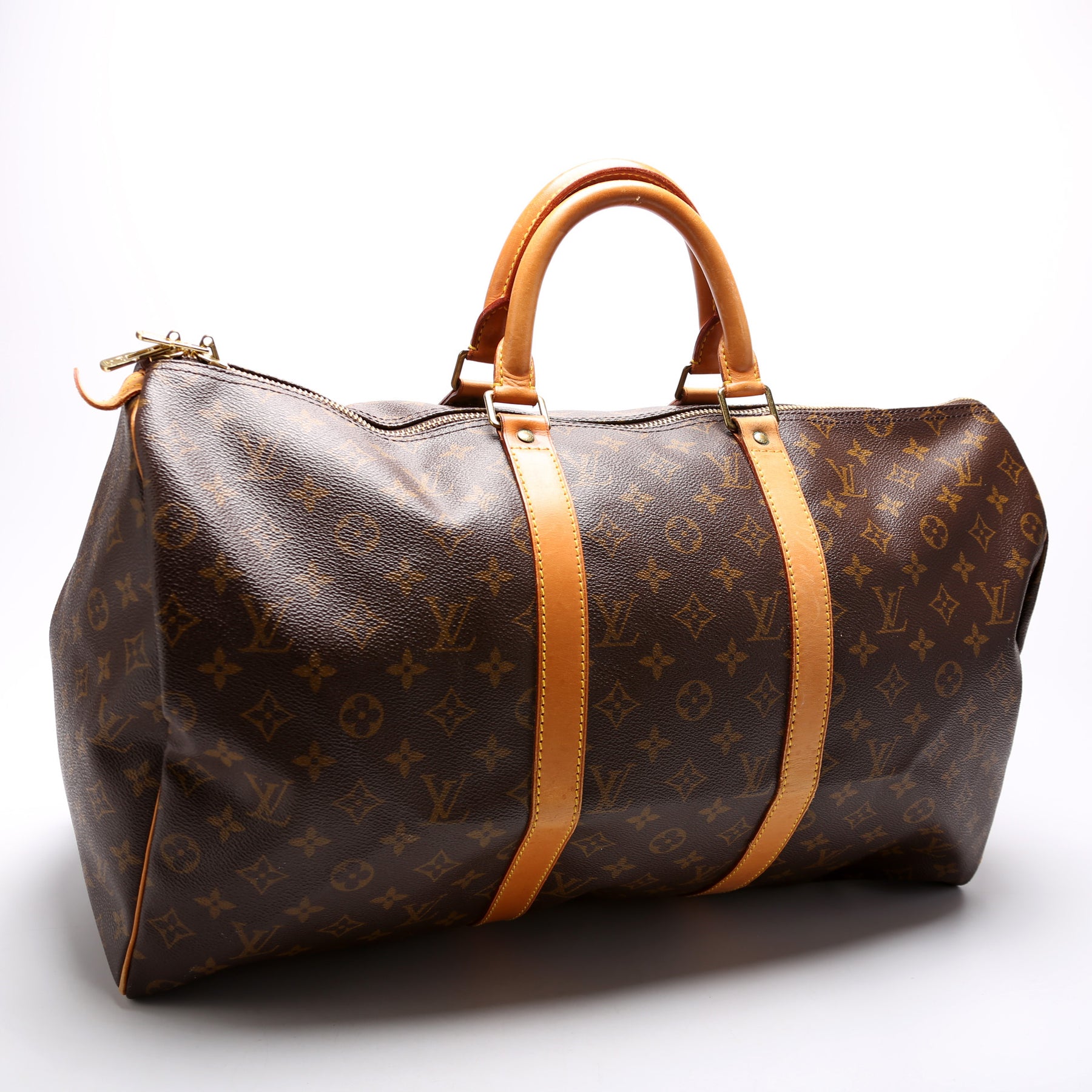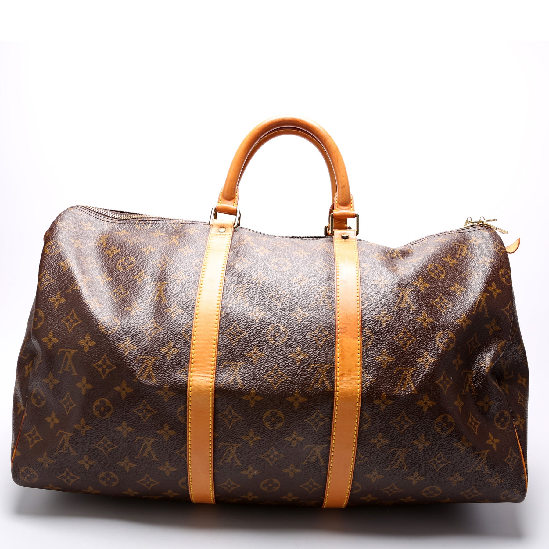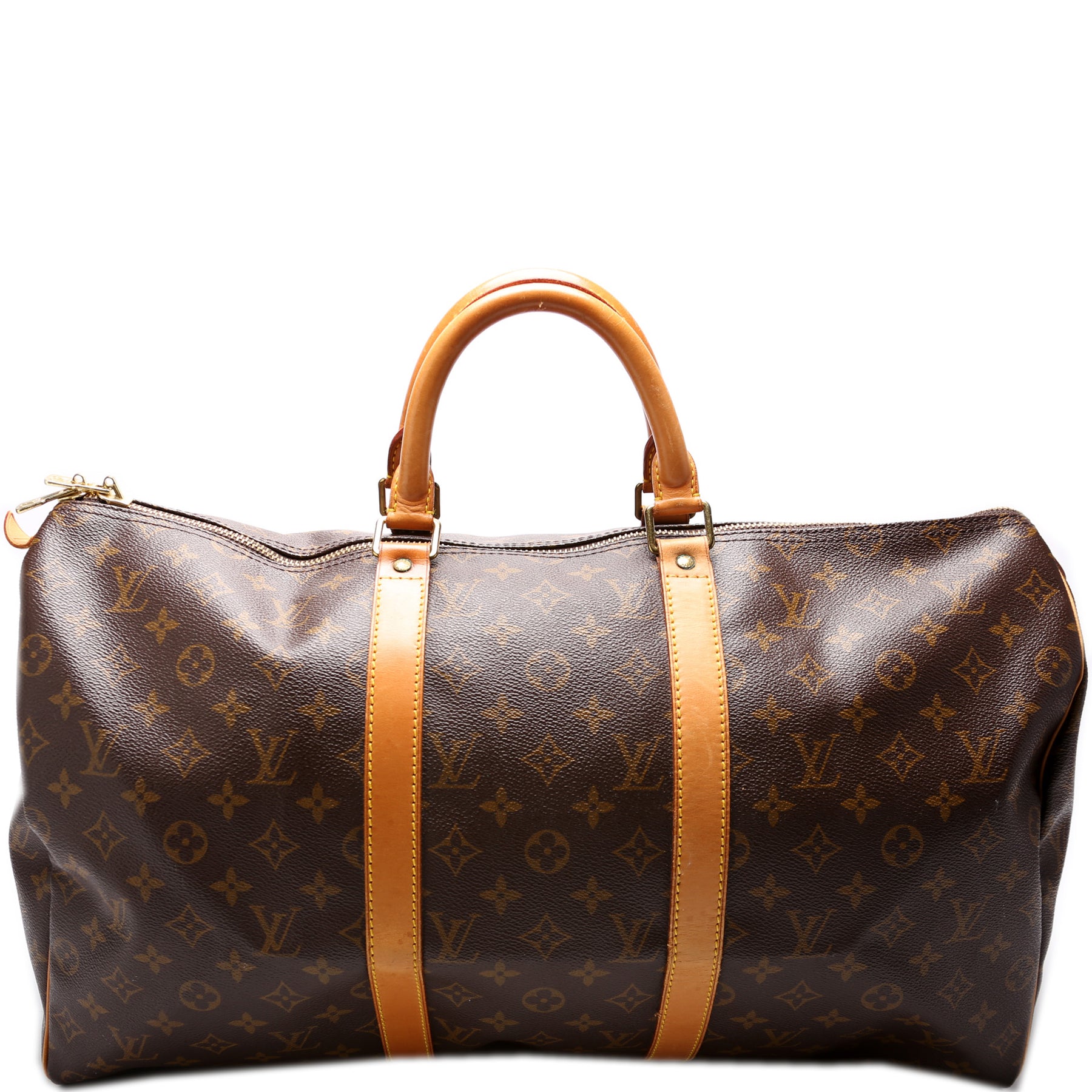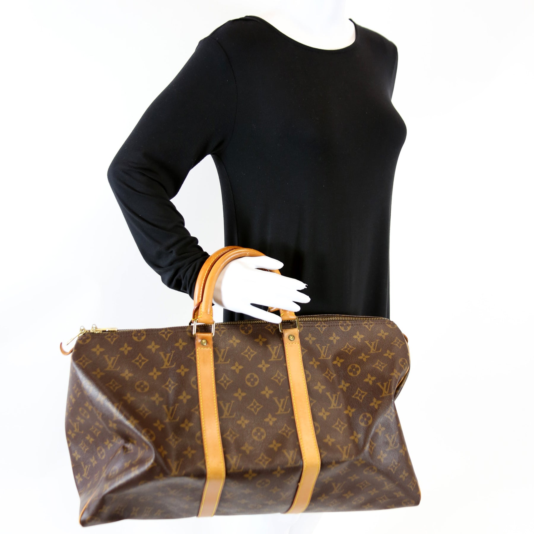 This pre-owned Louis Vuitton Keepall 50 is guaranteed 100% authentic. The exterior is in the classic Louis Vuitton Monogram coated canvas.