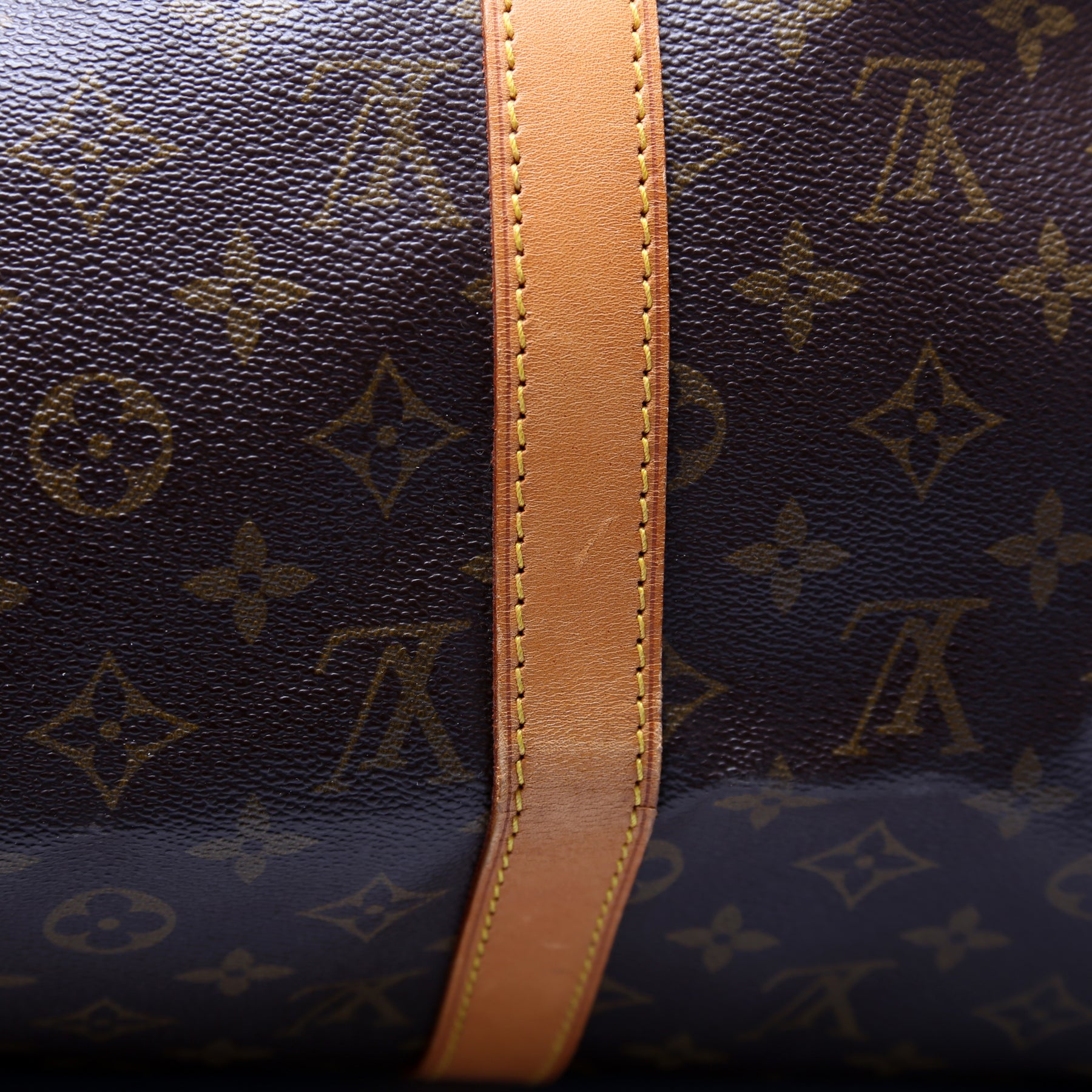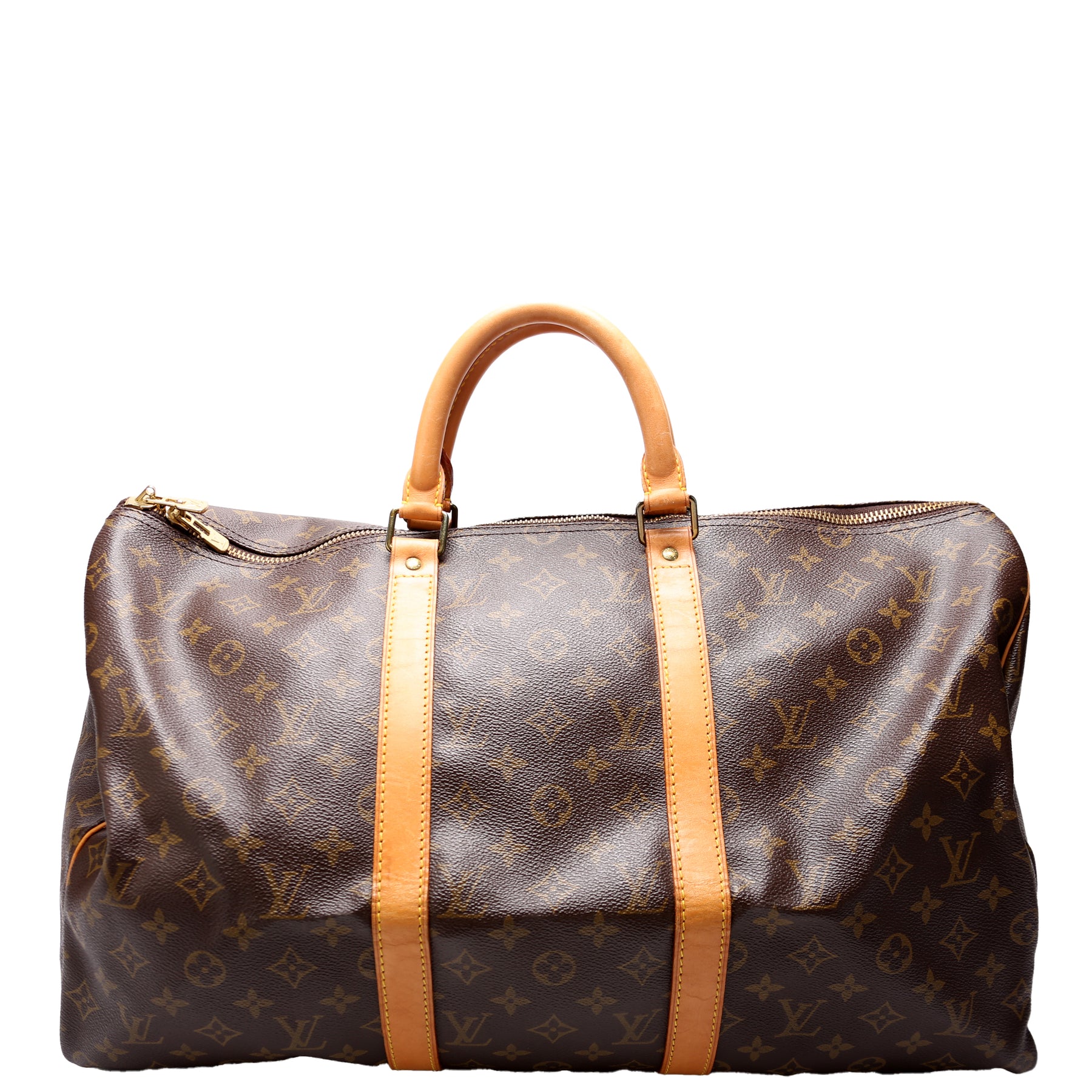 This pre-owned Louis Vuitton Keepall 50 is guaranteed 100% authentic. The exterior is in the classic Louis Vuitton Monogram coated canvas.