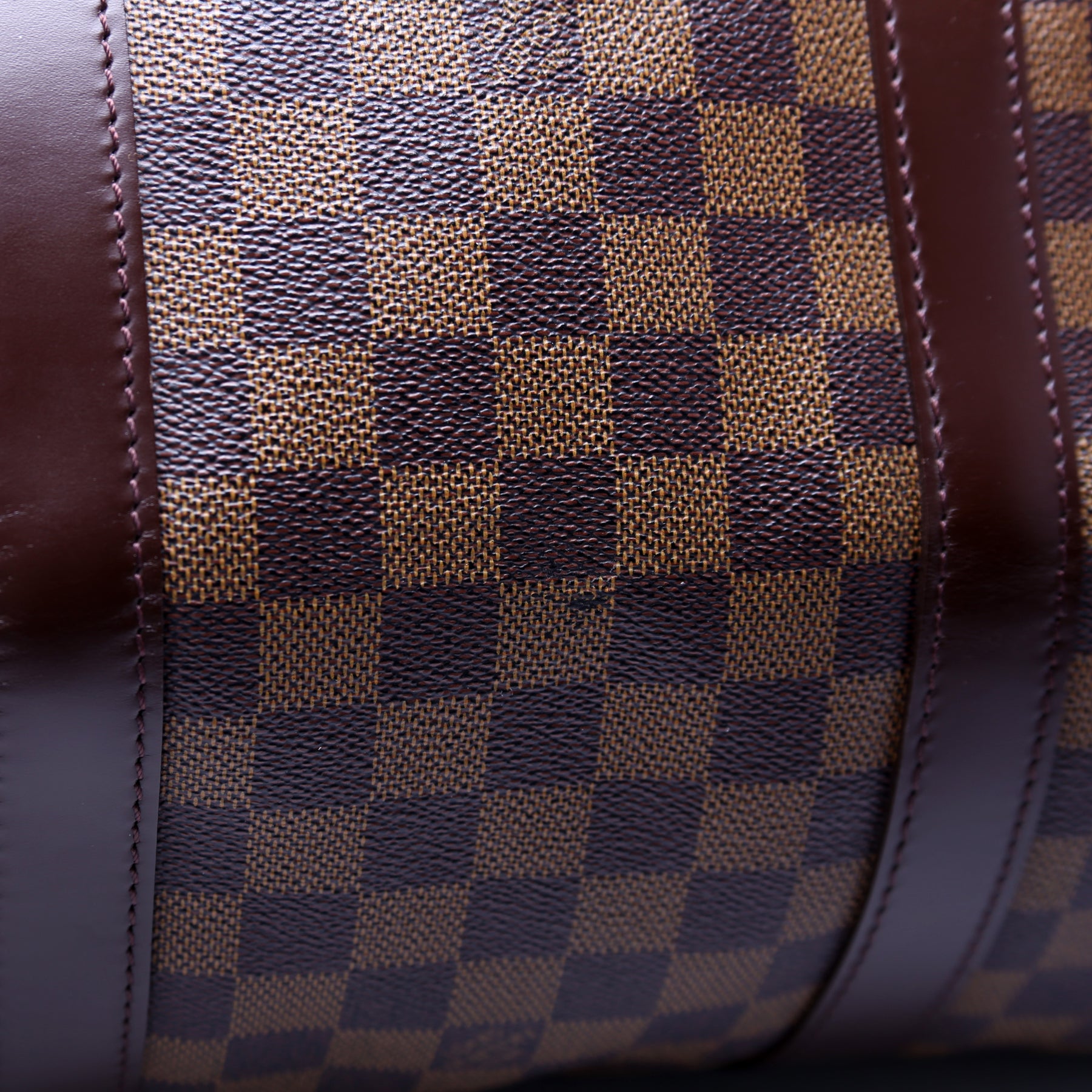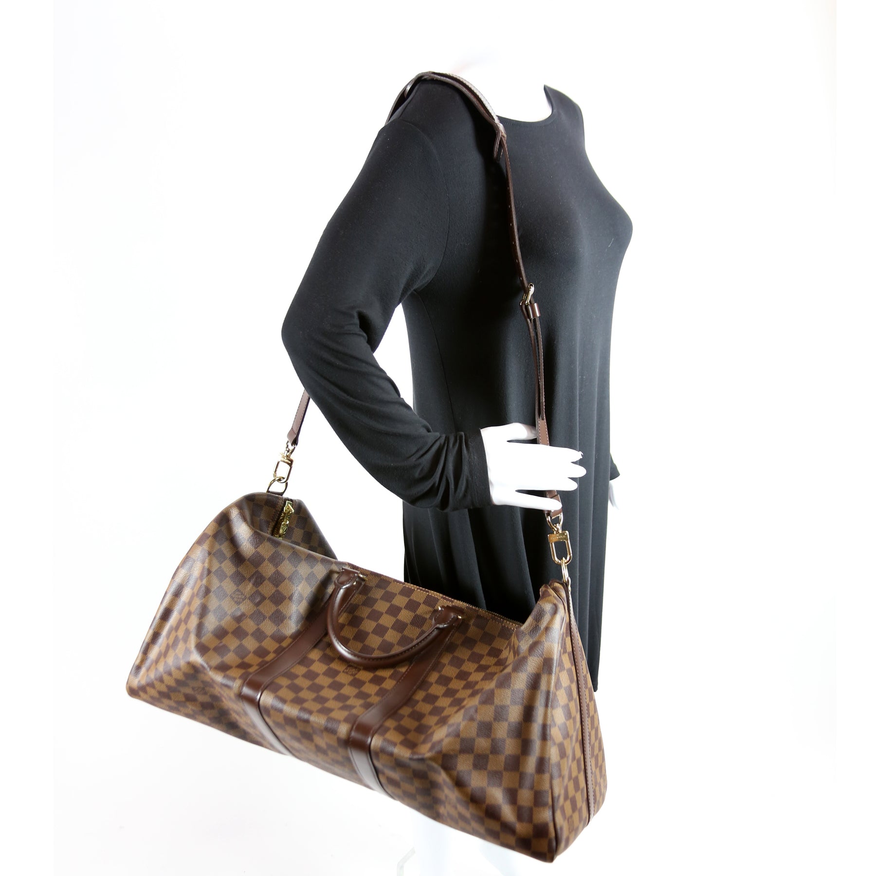 This pre-owned Louis Vuitton Keepall 55 Bandouliere is guaranteed 100% authentic. The exterior is in the classic Louis Vuitton Damier Ebene coated canvas.