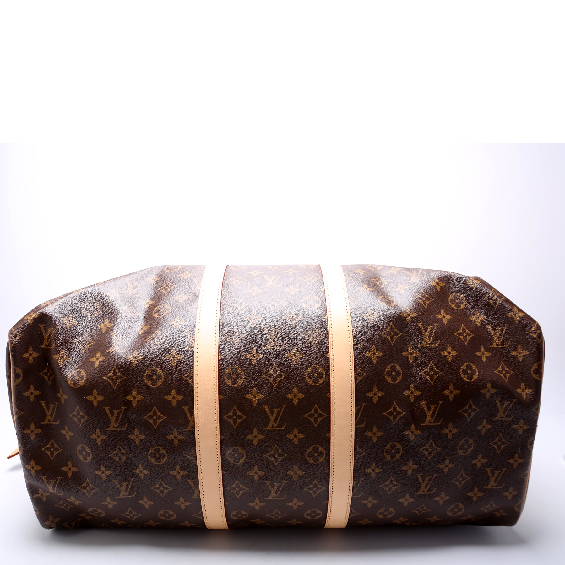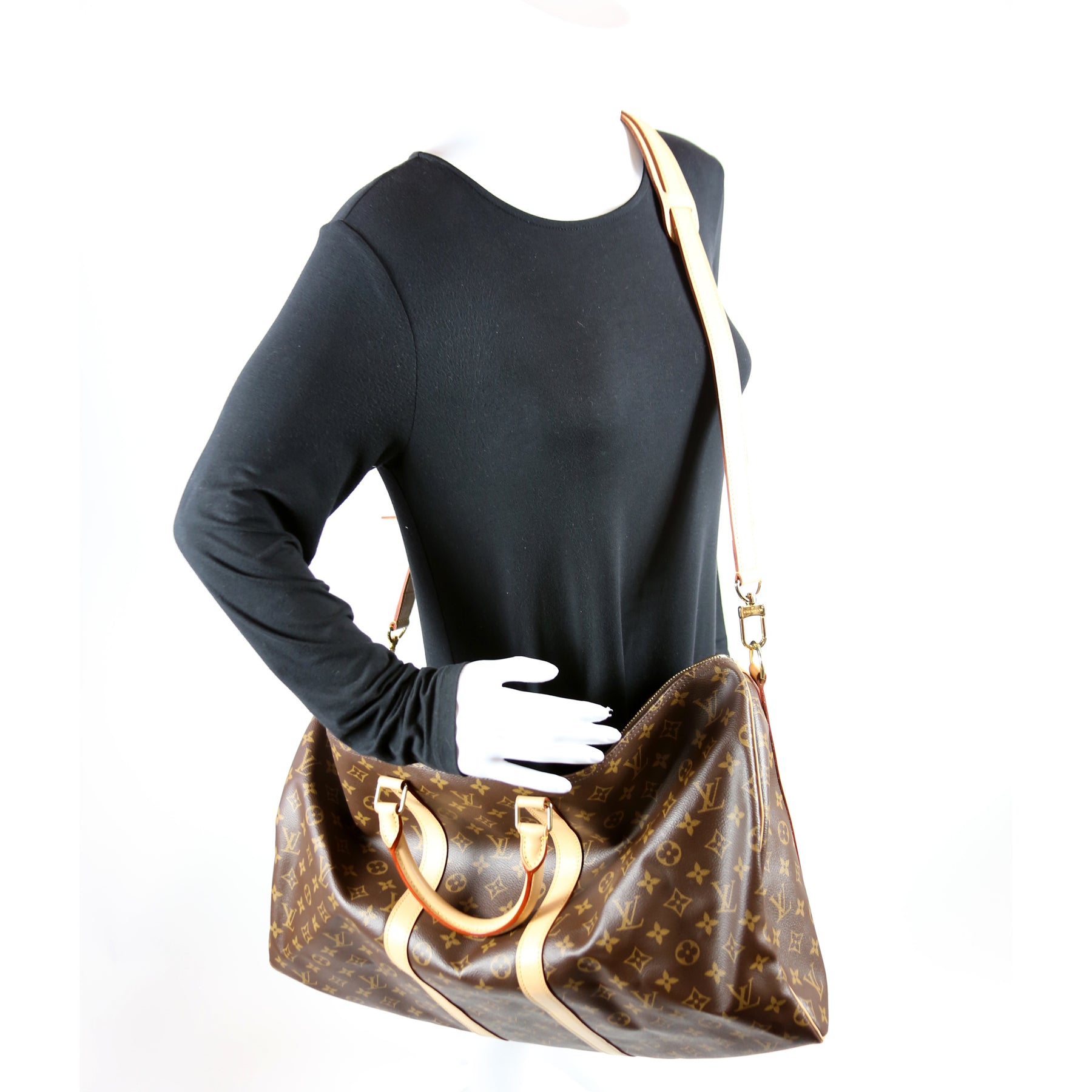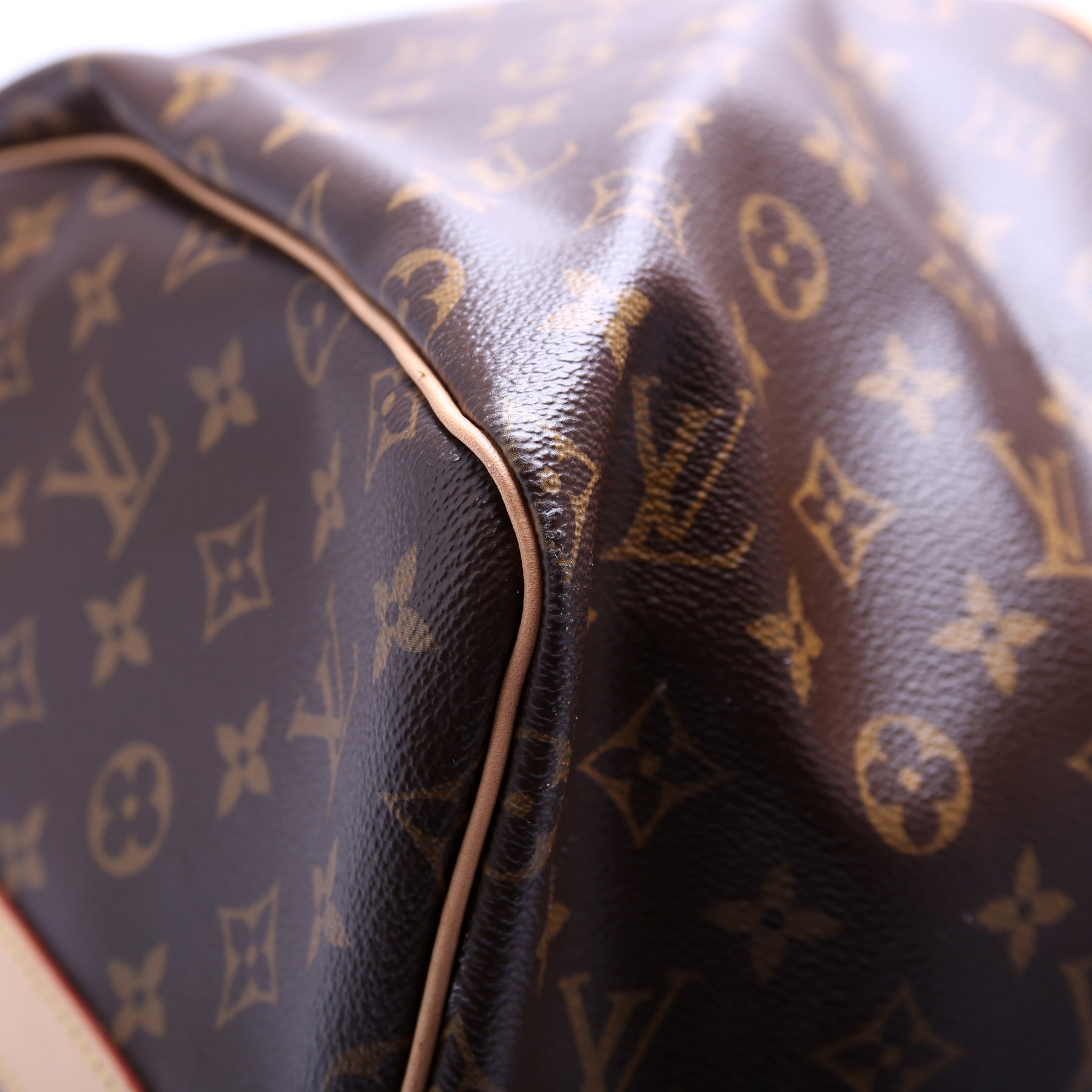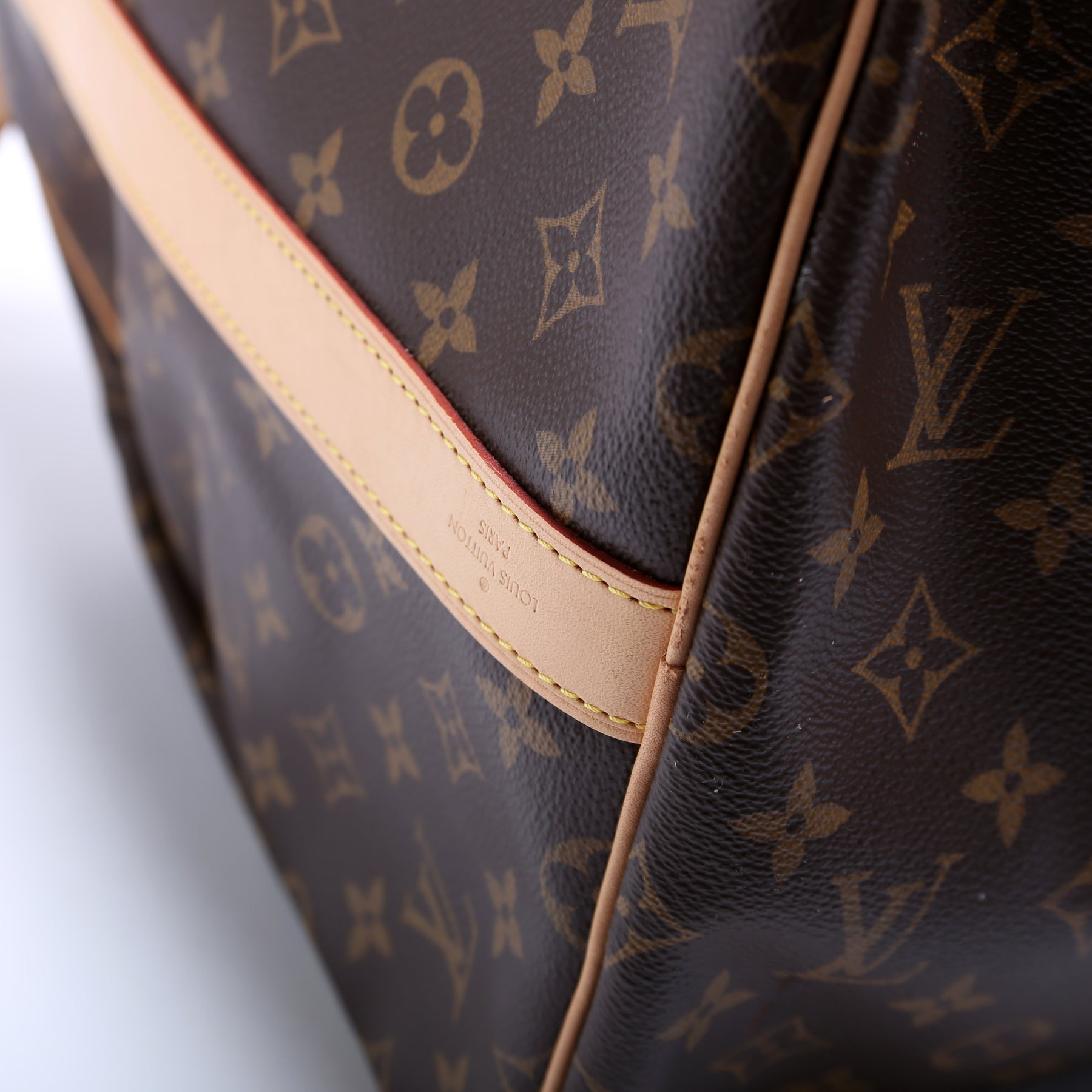 This pre-owned Louis Vuitton Keepall 55 is guaranteed 100% authentic. The exterior is in the classic Louis Vuitton Monogram coated canvas.