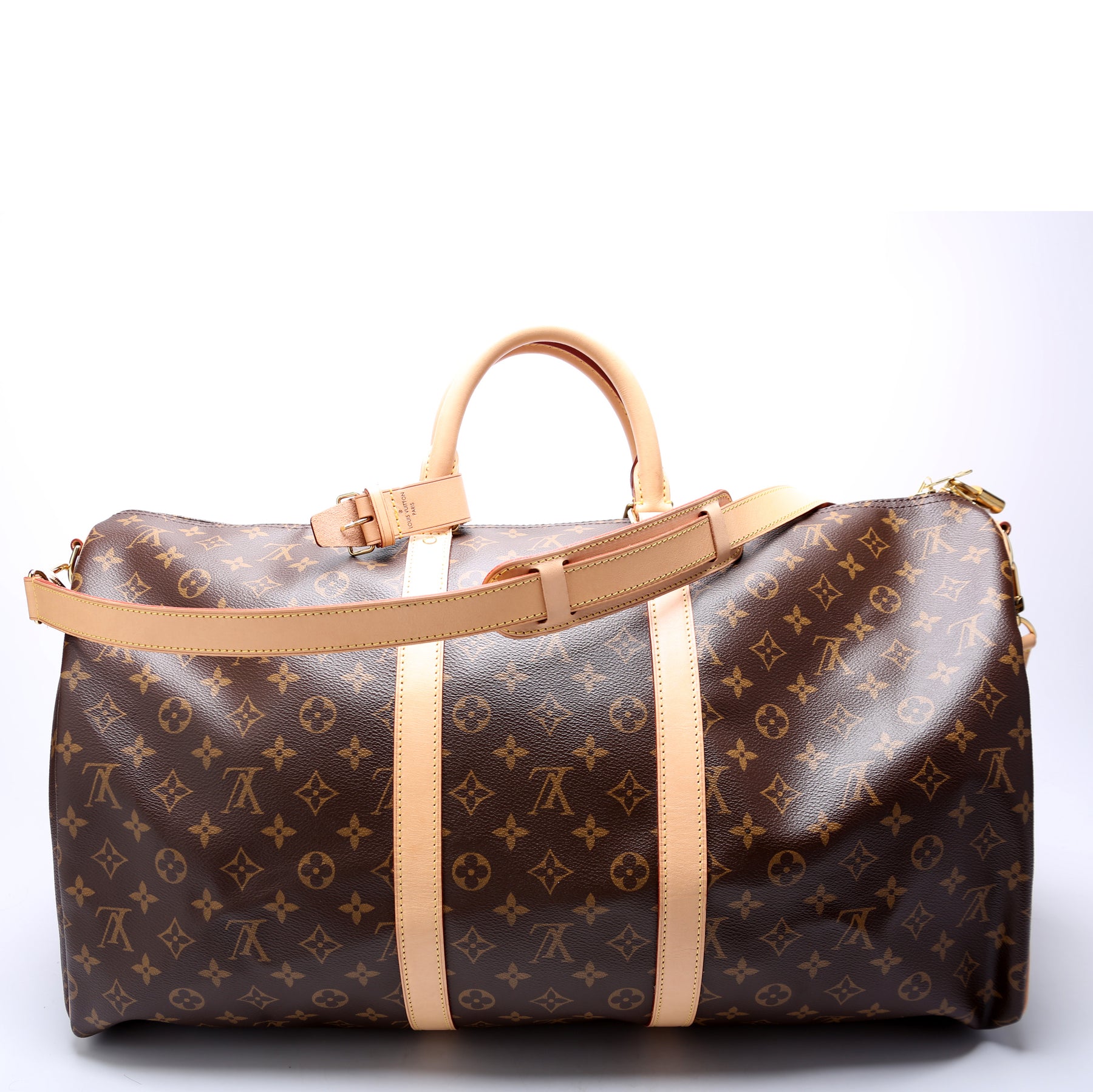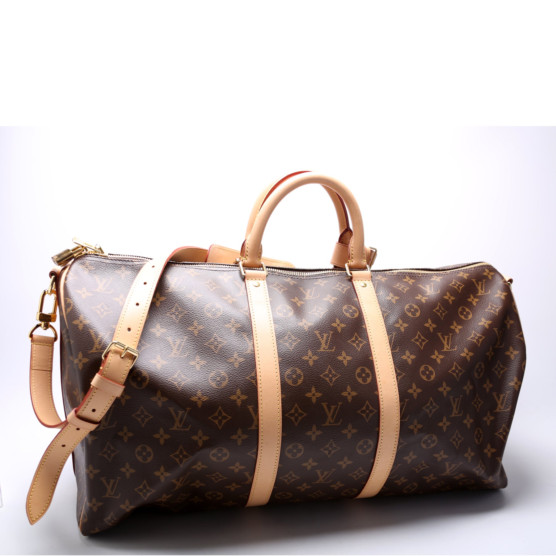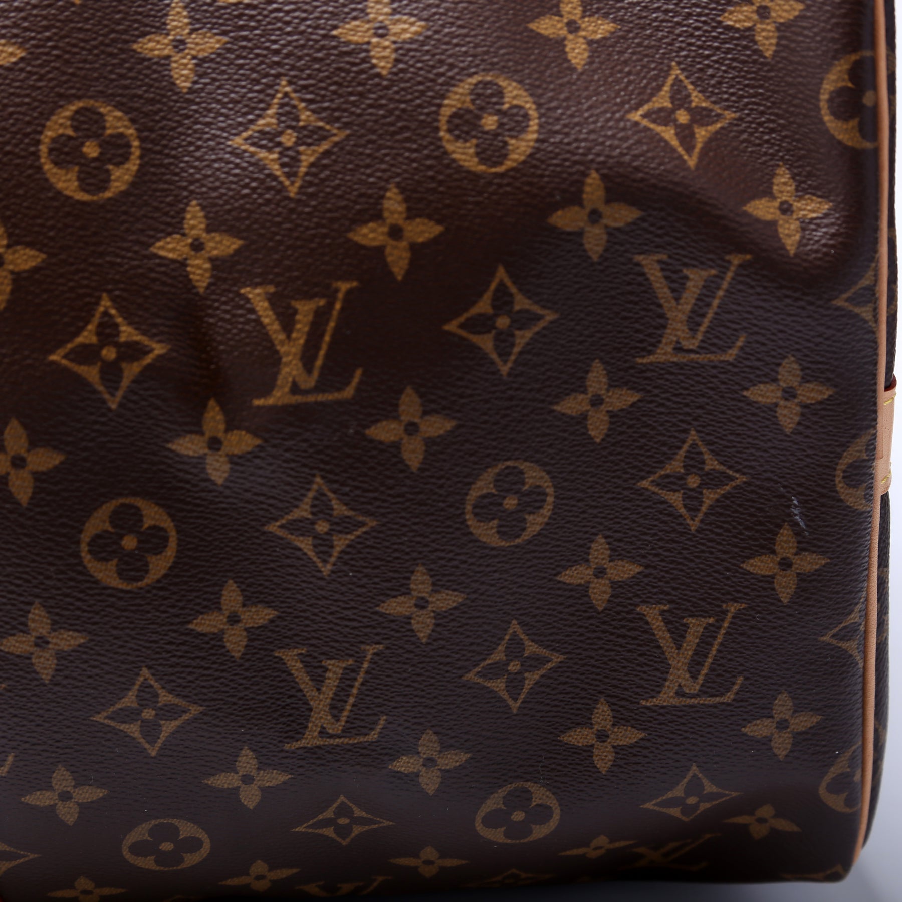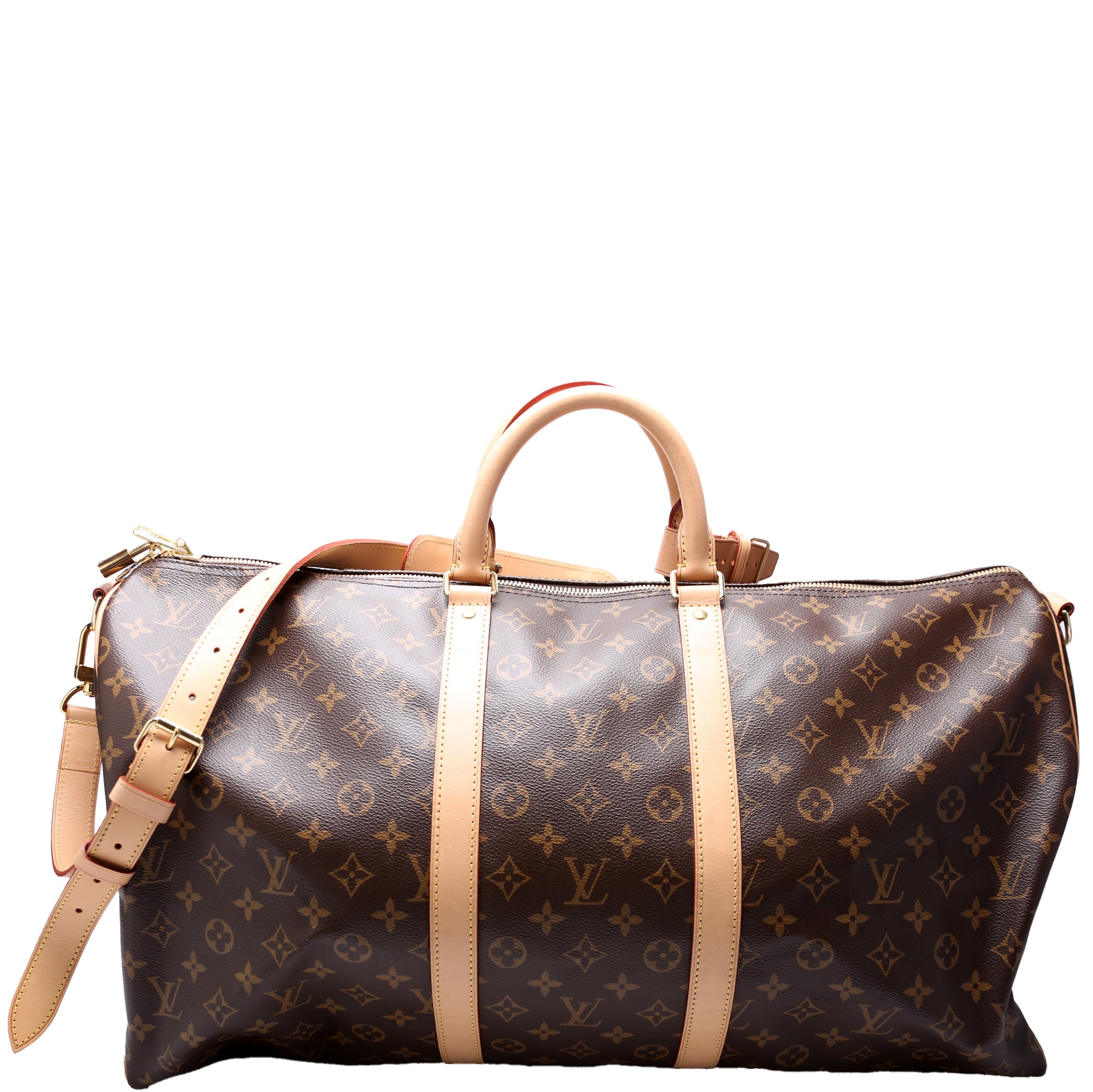 This pre-owned Louis Vuitton Keepall 55 is guaranteed 100% authentic. The exterior is in the classic Louis Vuitton Monogram coated canvas.