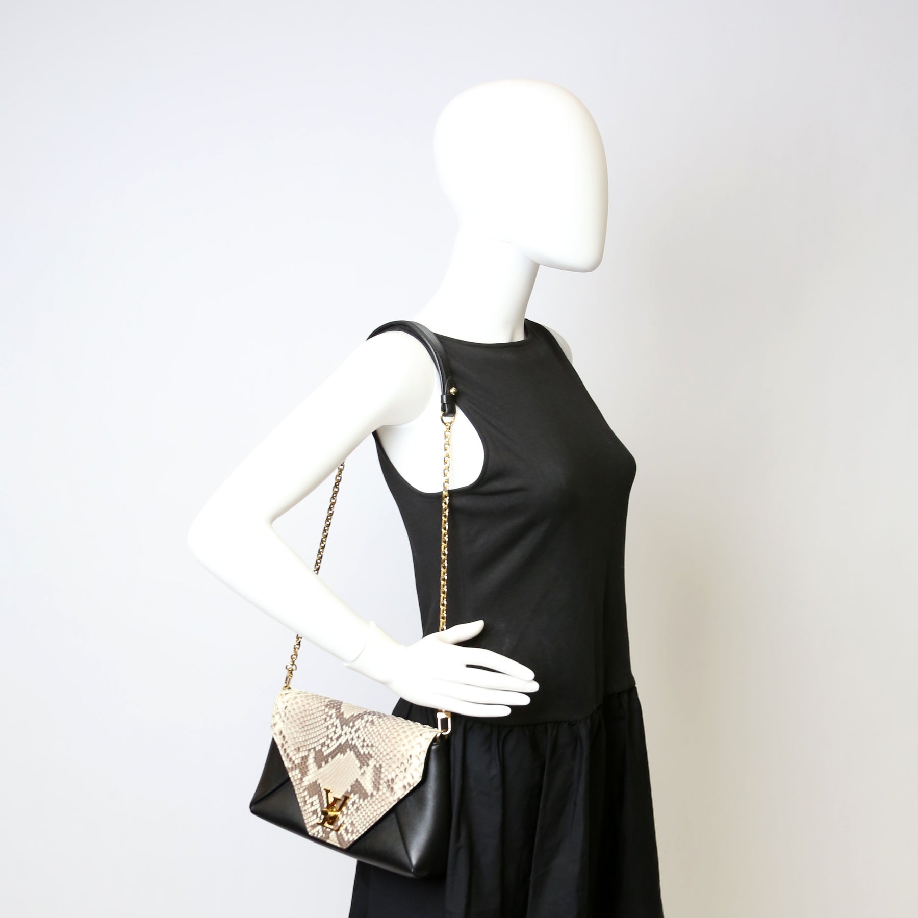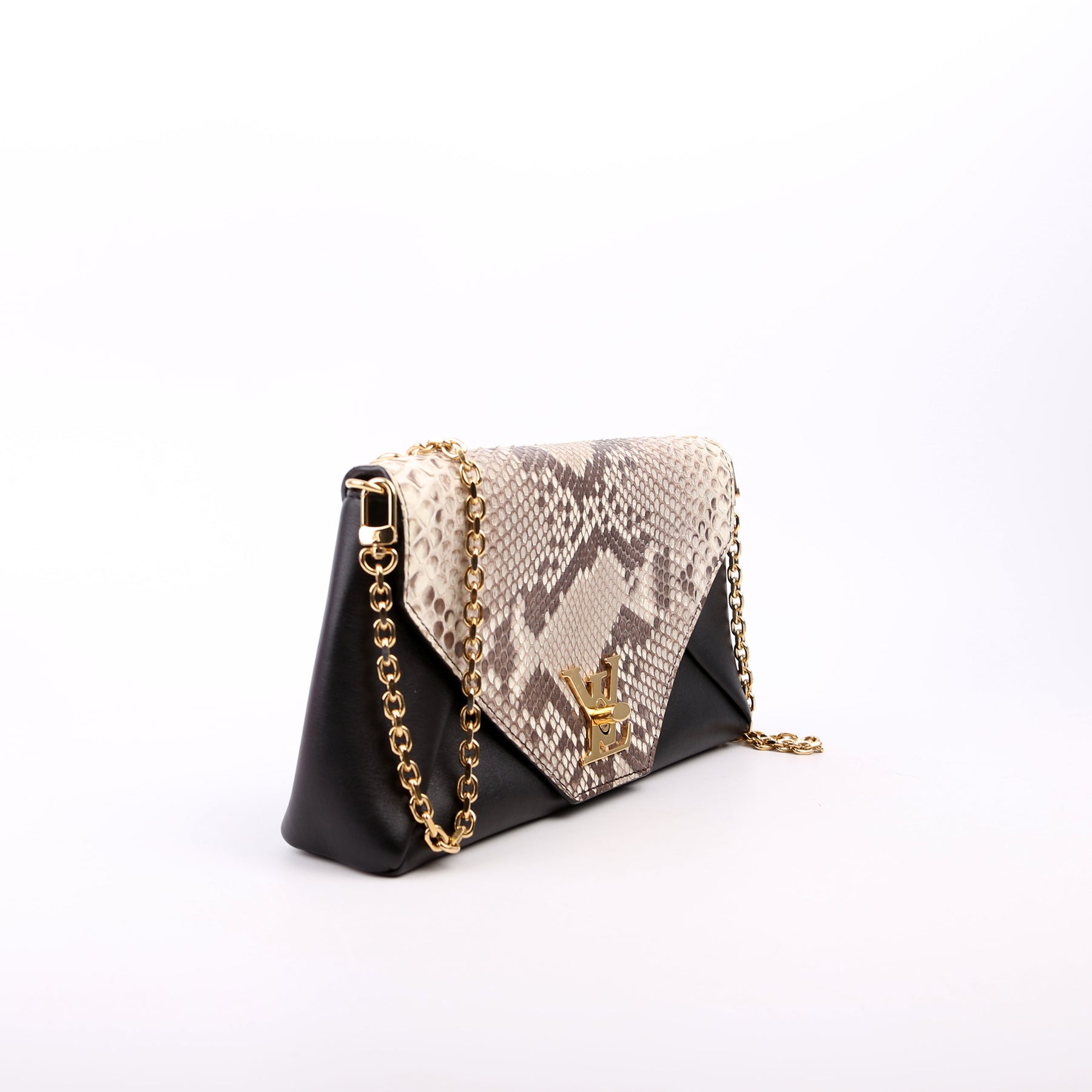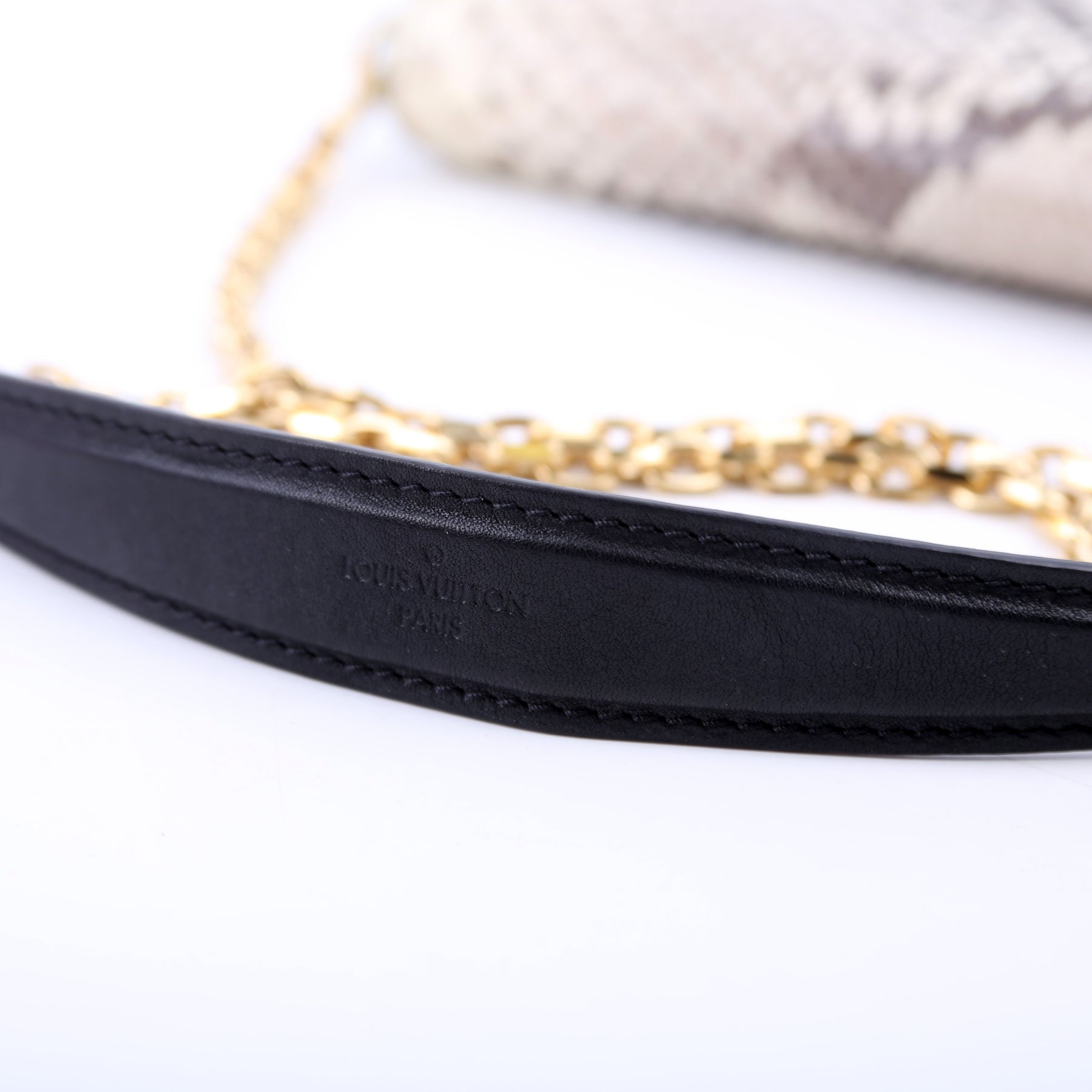 This pre-owned Louis Vuitton Love Note Chain Clutch is guaranteed 100% authentic. The exterior is in the classic Louis Vuitton Calfskin leather.