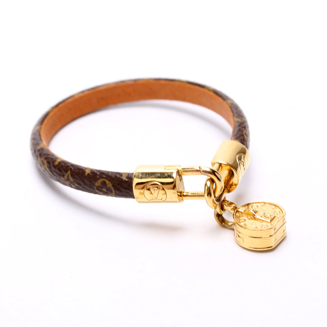 This pre-owned Louis Vuitton LV Tribute Bracelet is guaranteed 100% authentic. The exterior is in the classic Louis Vuitton Monogram coated canvas.