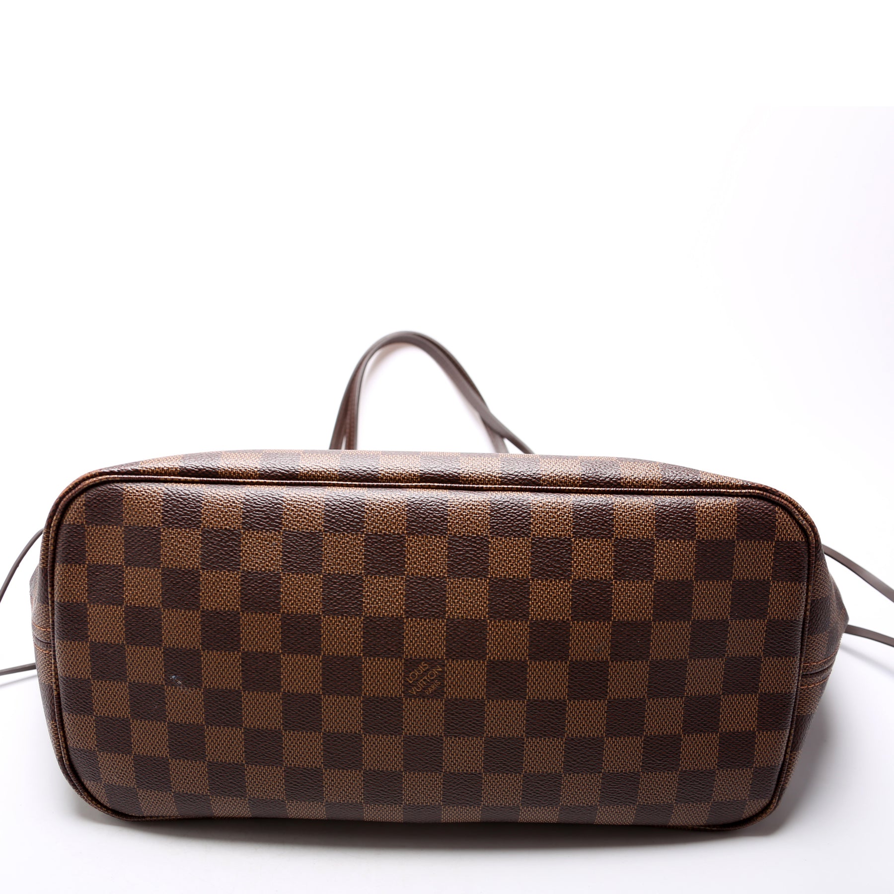 This pre-owned Louis Vuitton Neverfull MM W/Wallet is guaranteed 100% authentic. The exterior is in the classic Louis Vuitton Damier Ebene coated canvas.