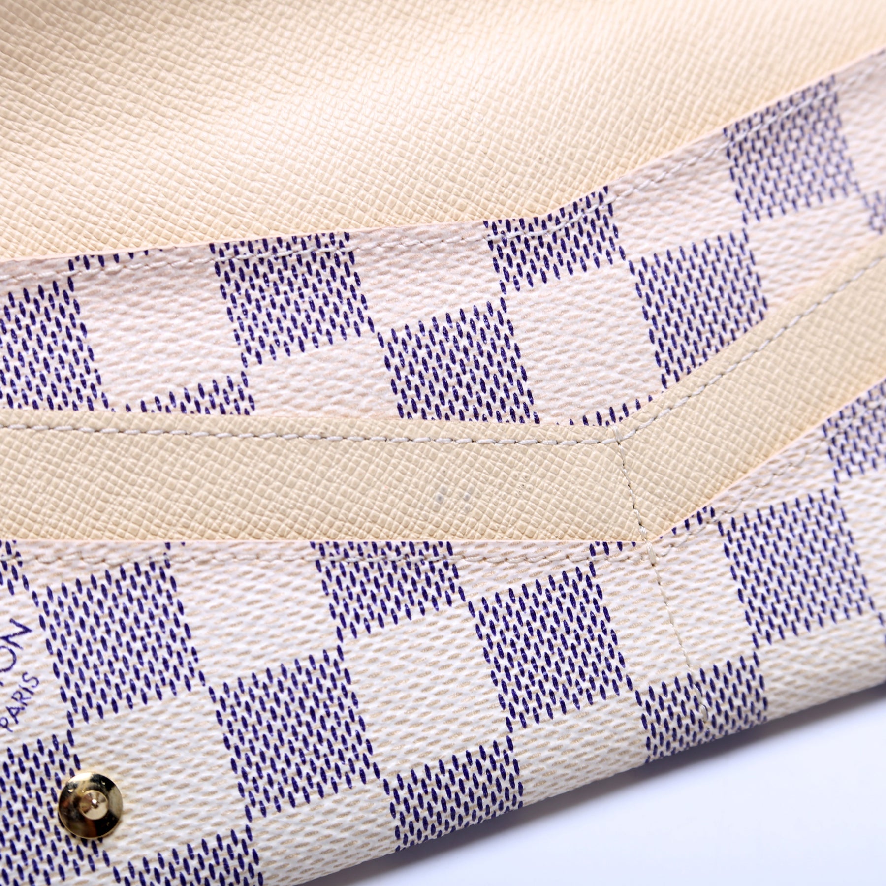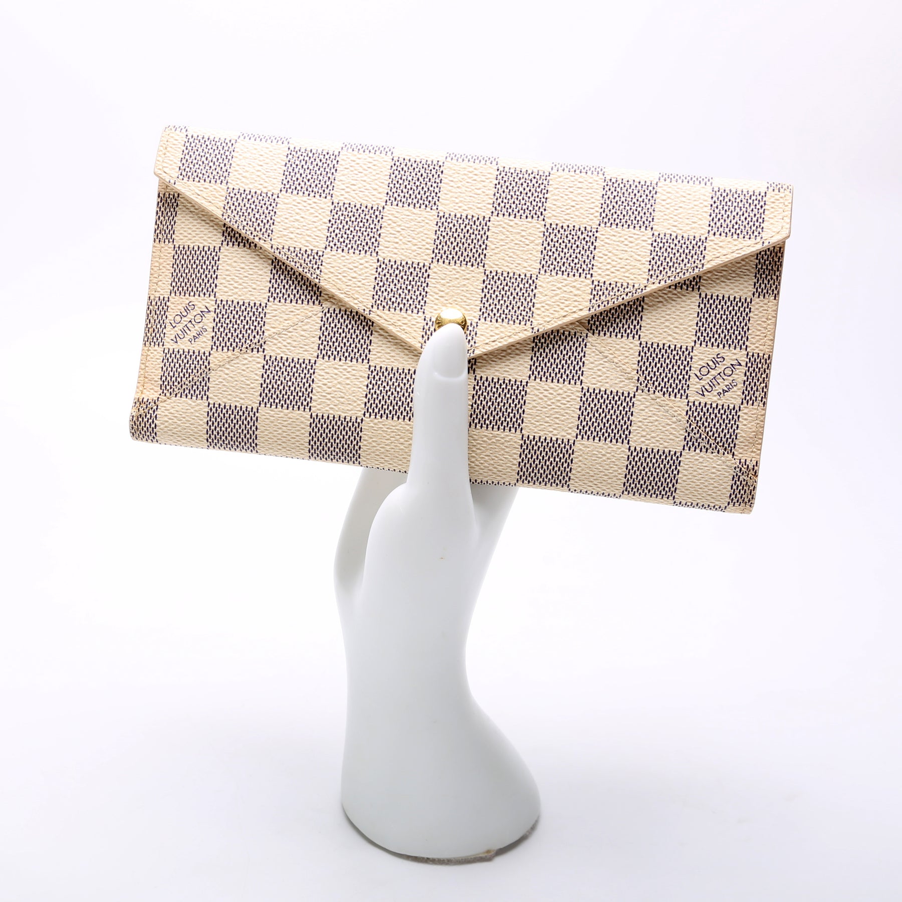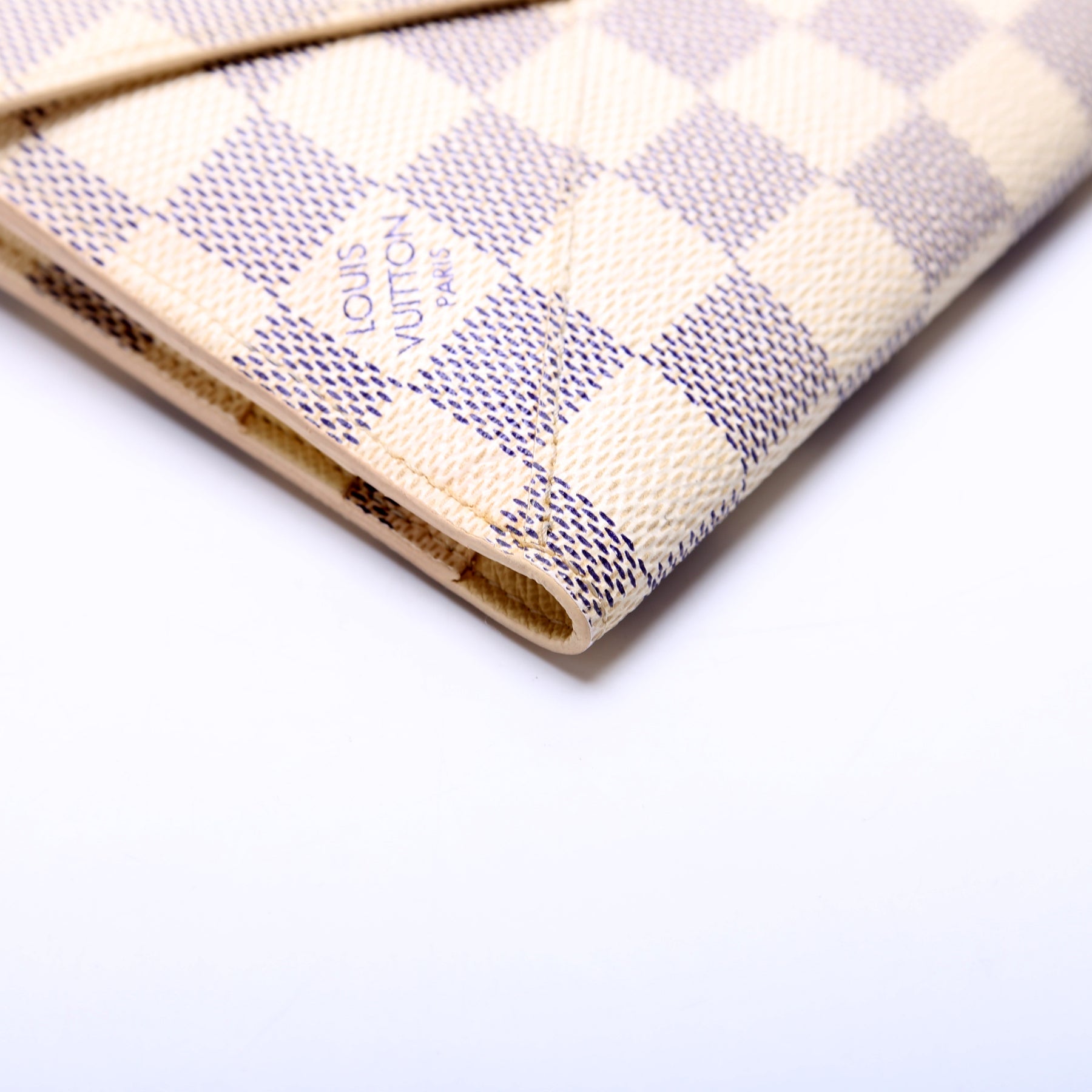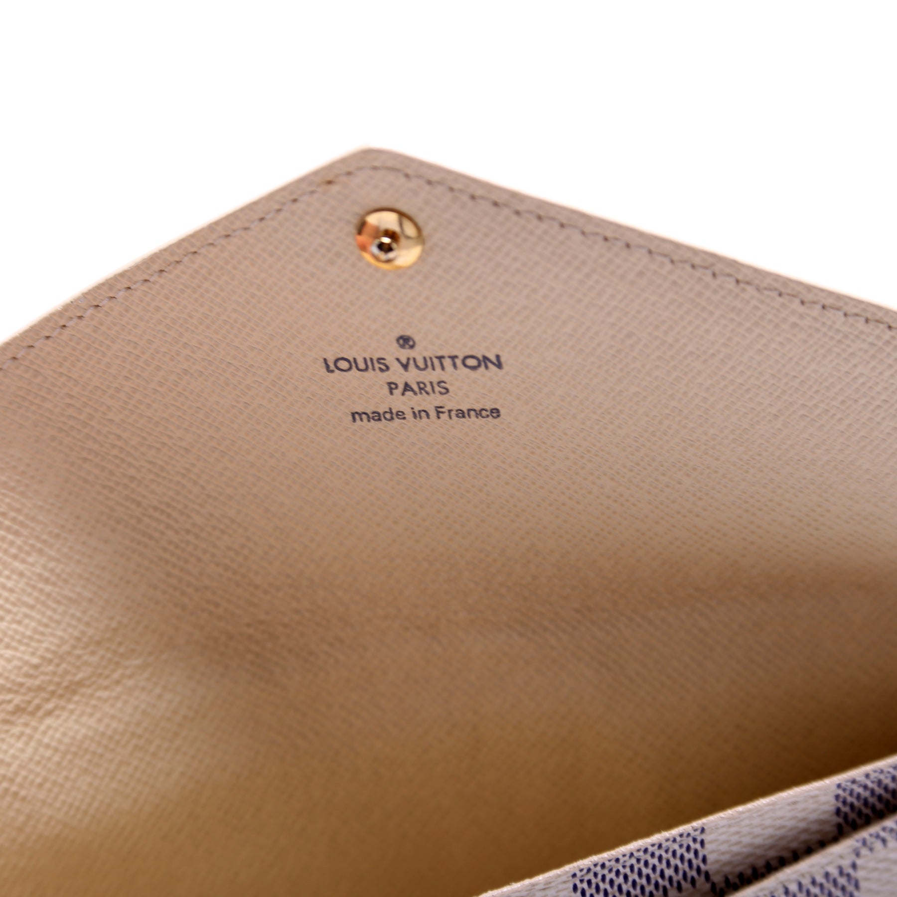 This pre-owned Louis Vuitton Origami Long Wallet is guaranteed 100% authentic. The exterior is in the classic Louis Vuitton Damier Azur coated canvas.