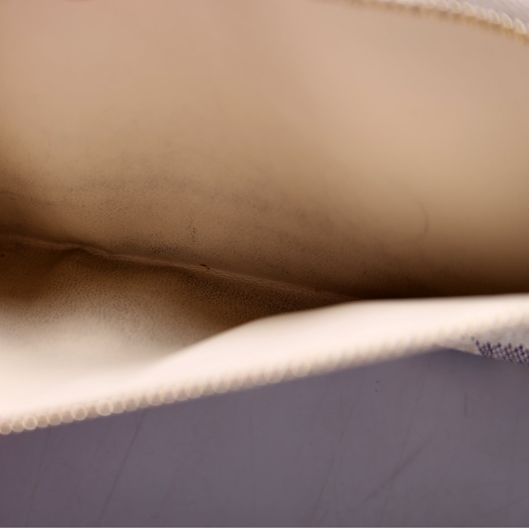Exterior: The exterior coated canvas is free of any rips or cracks. The exterior features one zip closure coin pouch. The canvas has minor discoloration. The glazing has minor cracks.