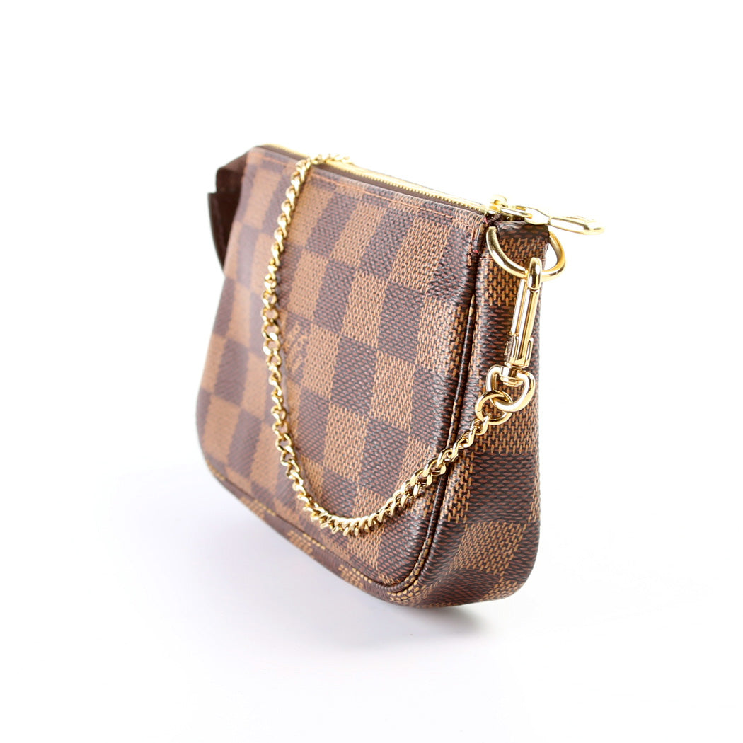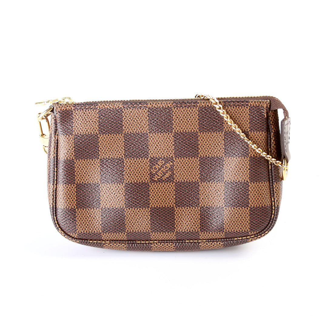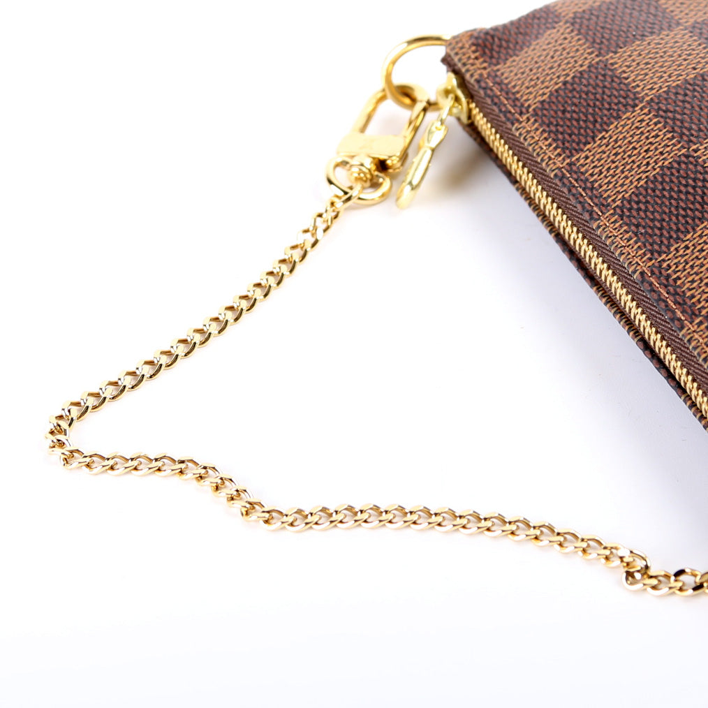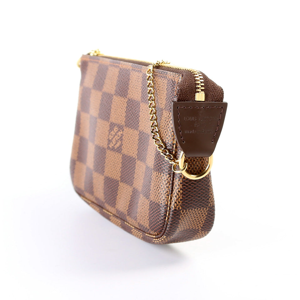 This pre-owned Louis Vuitton Pochette Accessories Mini is guaranteed 100% authentic. The exterior is in the classic Louis Vuitton Damier Ebene coated canvas.