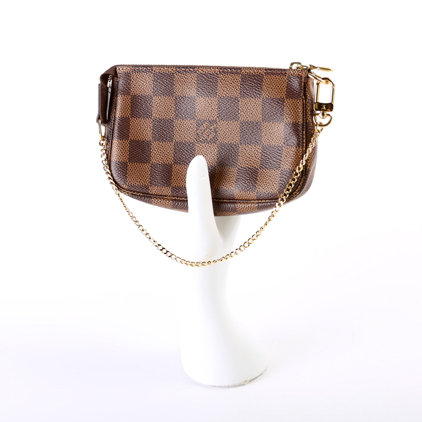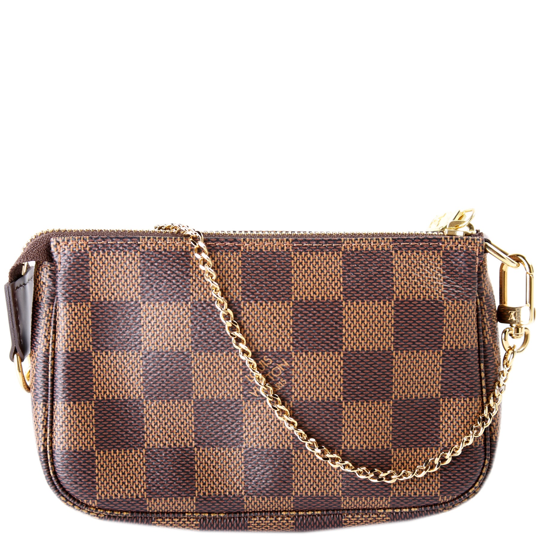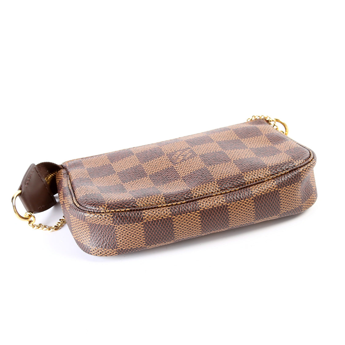 This pre-owned Louis Vuitton Pochette Accessories Mini is guaranteed 100% authentic. The exterior is in the classic Louis Vuitton Damier Ebene coated canvas.