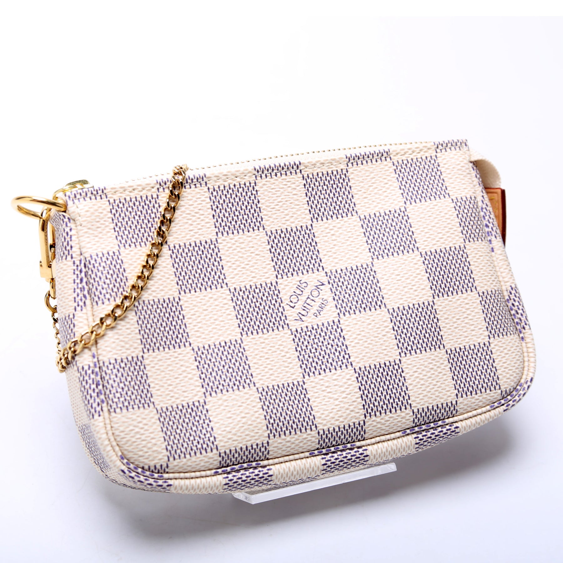 This pre-owned Louis Vuitton Pochette Accessories is guaranteed 100% authentic. The exterior is in the classic Louis Vuitton Damier Azur coated canvas.