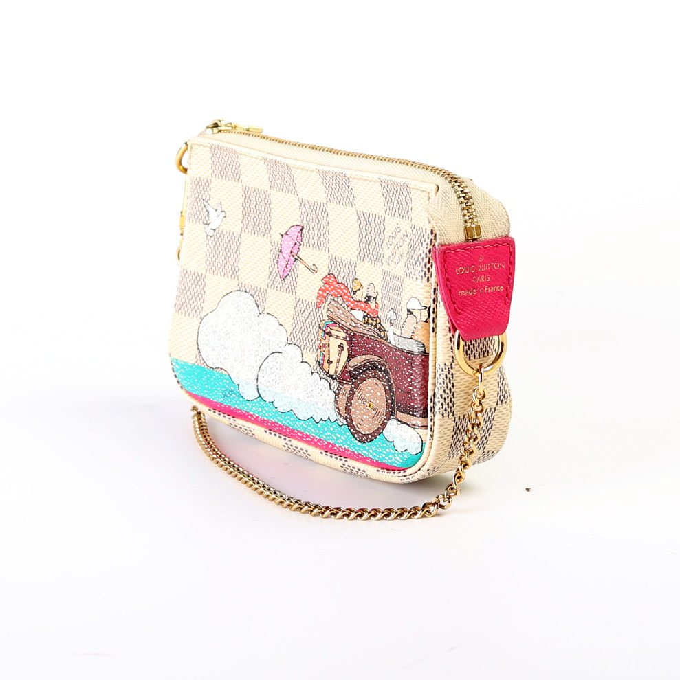 This pre-owned Louis Vuitton Pochette Accessories Mini Azur Evasion is guaranteed 100% authentic. The exterior is in the classic Louis Vuitton Damier Azur coated canvas.