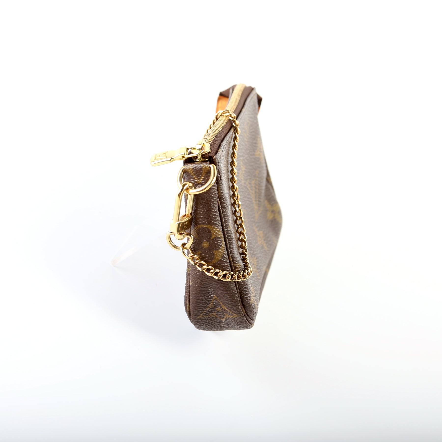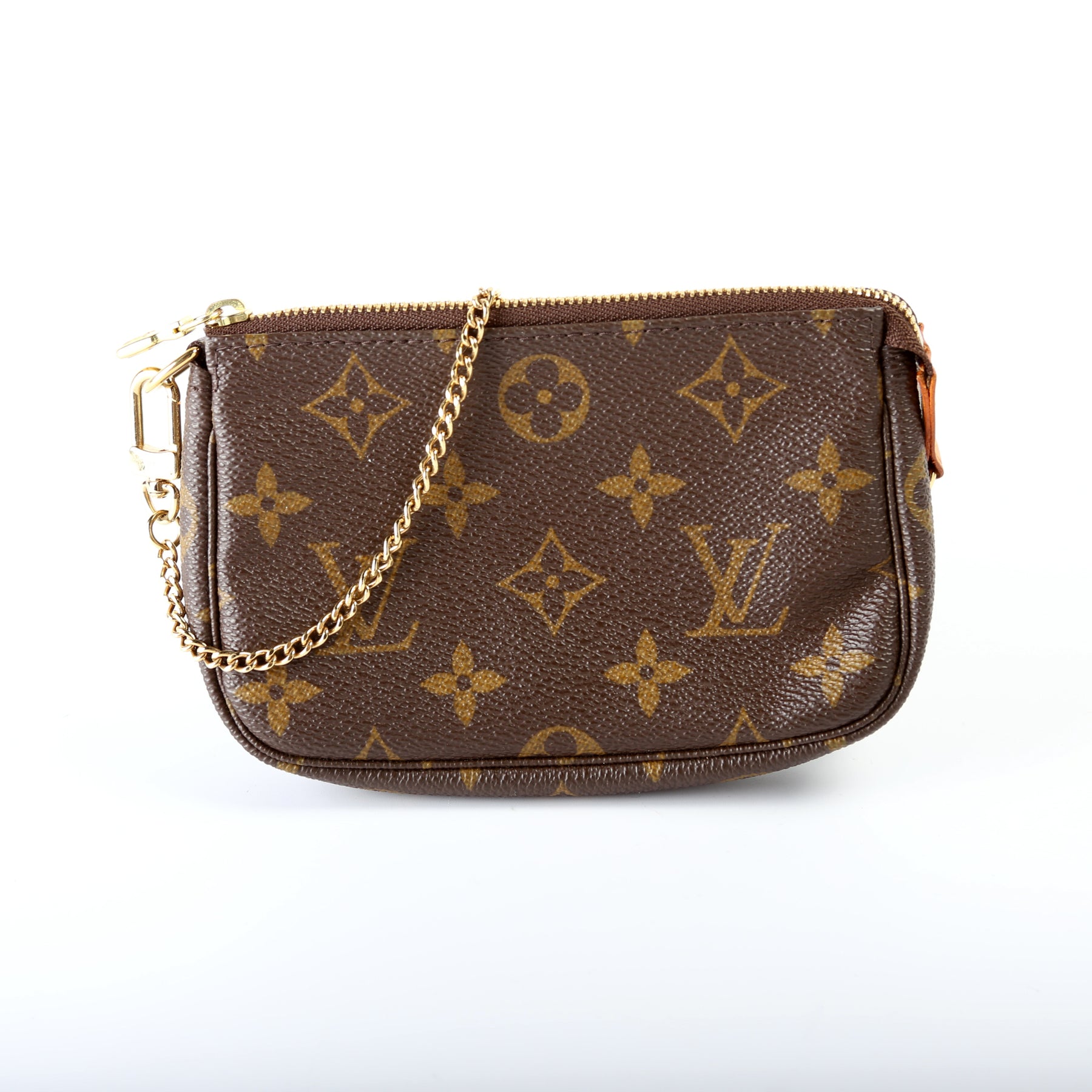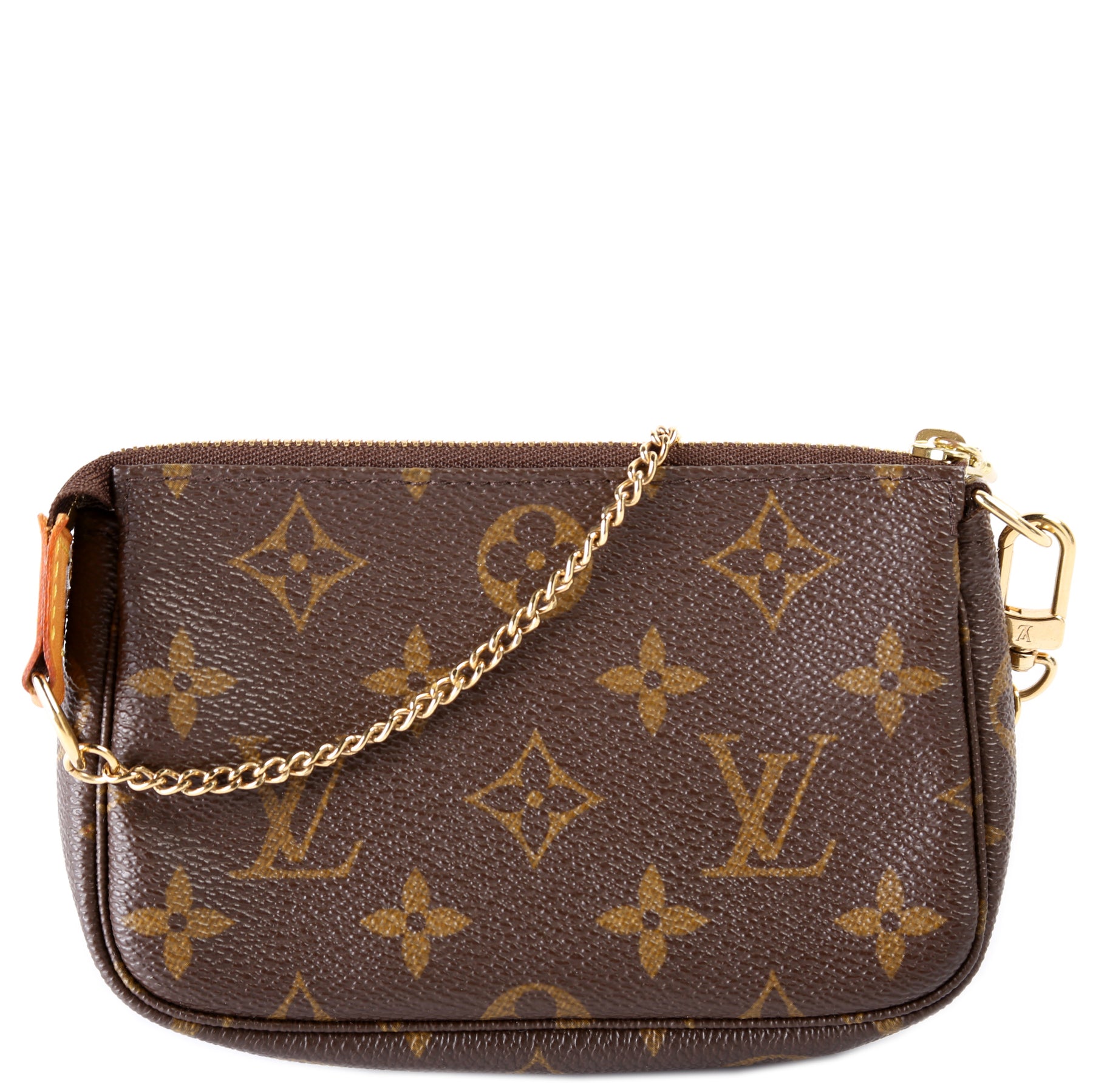 This pre-owned Louis Vuitton Pochette Accessories Mini is guaranteed 100% authentic. The exterior is in the classic Louis Vuitton Monogram coated canvas.
