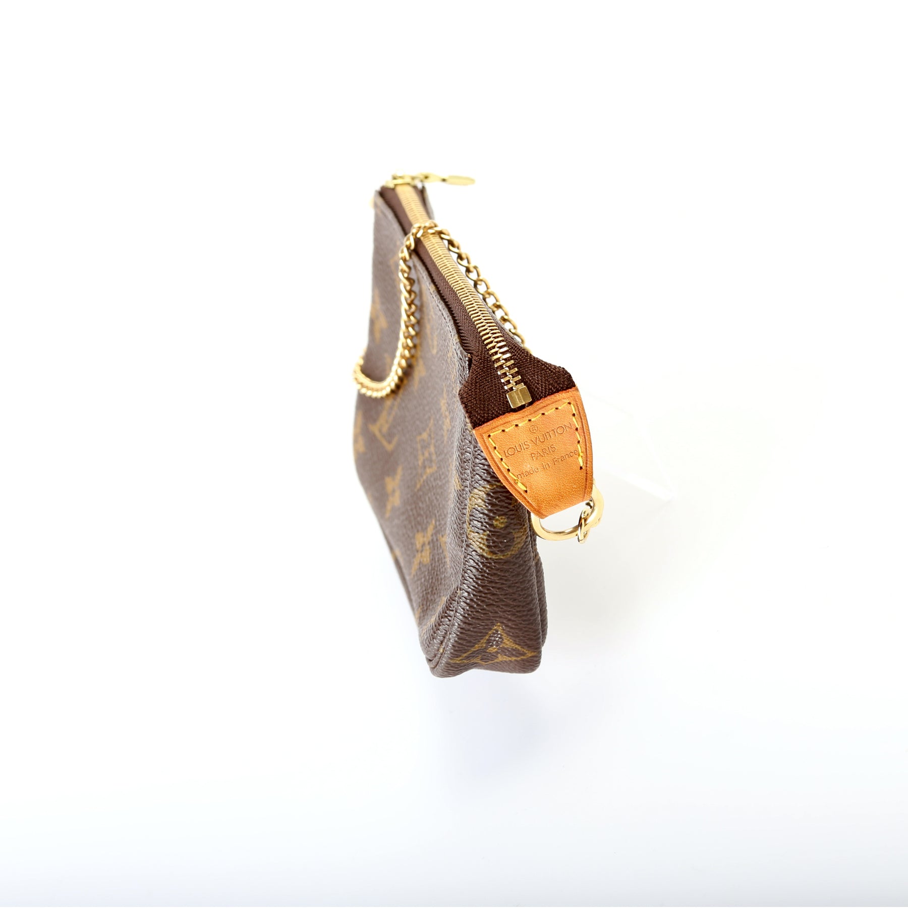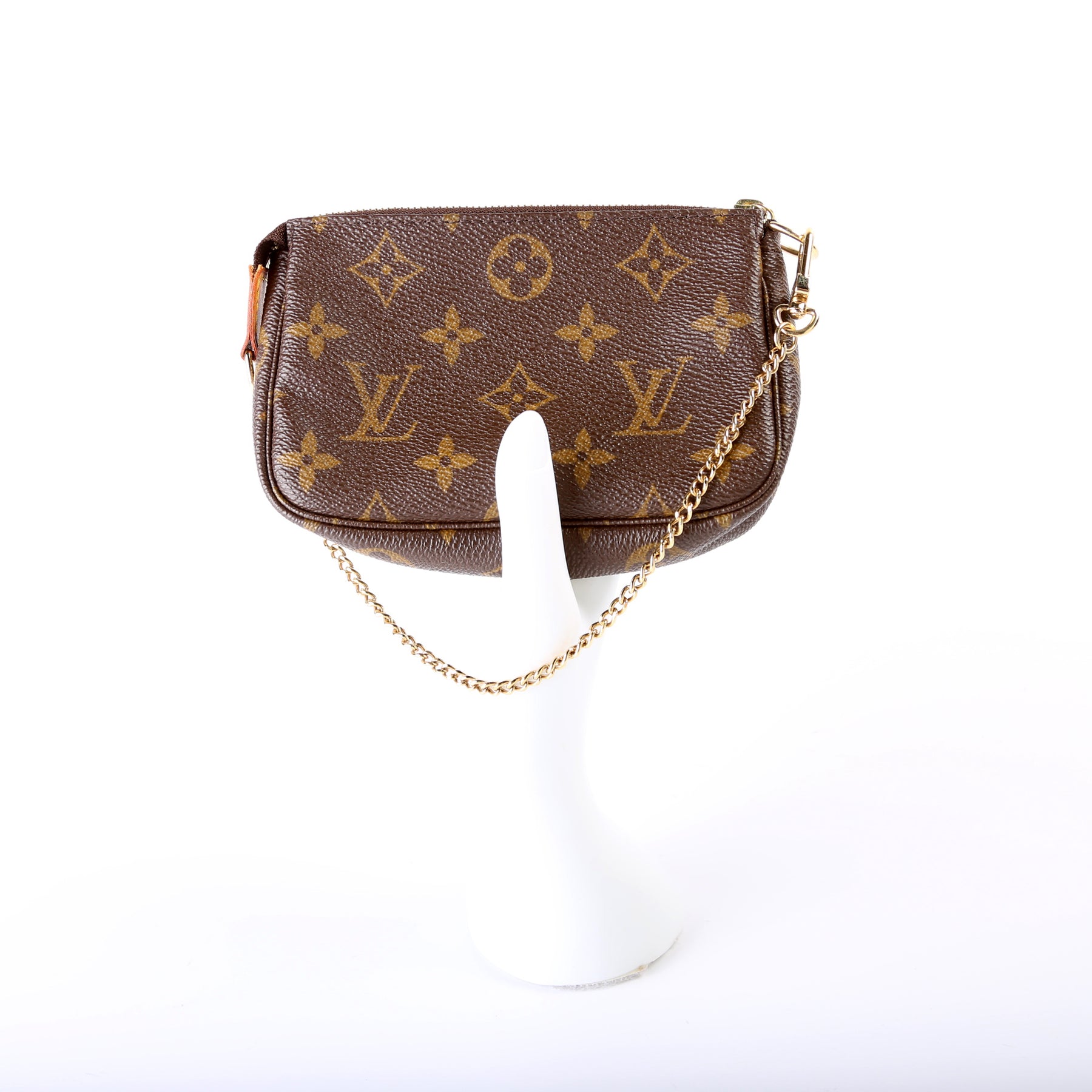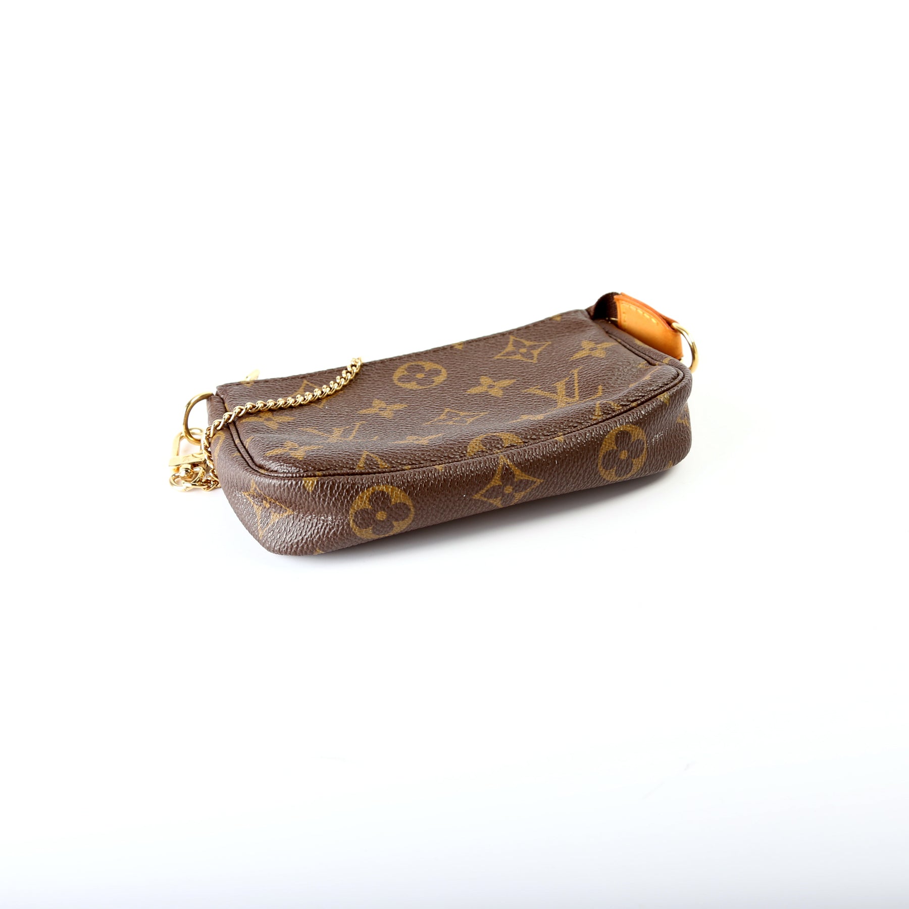 This pre-owned Louis Vuitton Pochette Accessories Mini is guaranteed 100% authentic. The exterior is in the classic Louis Vuitton Monogram coated canvas.