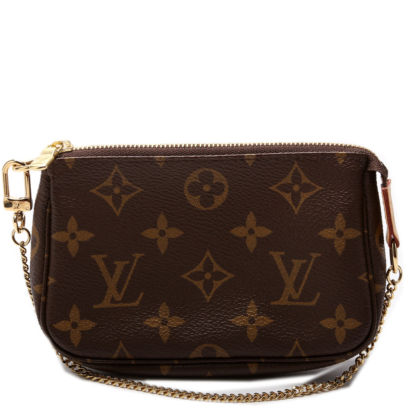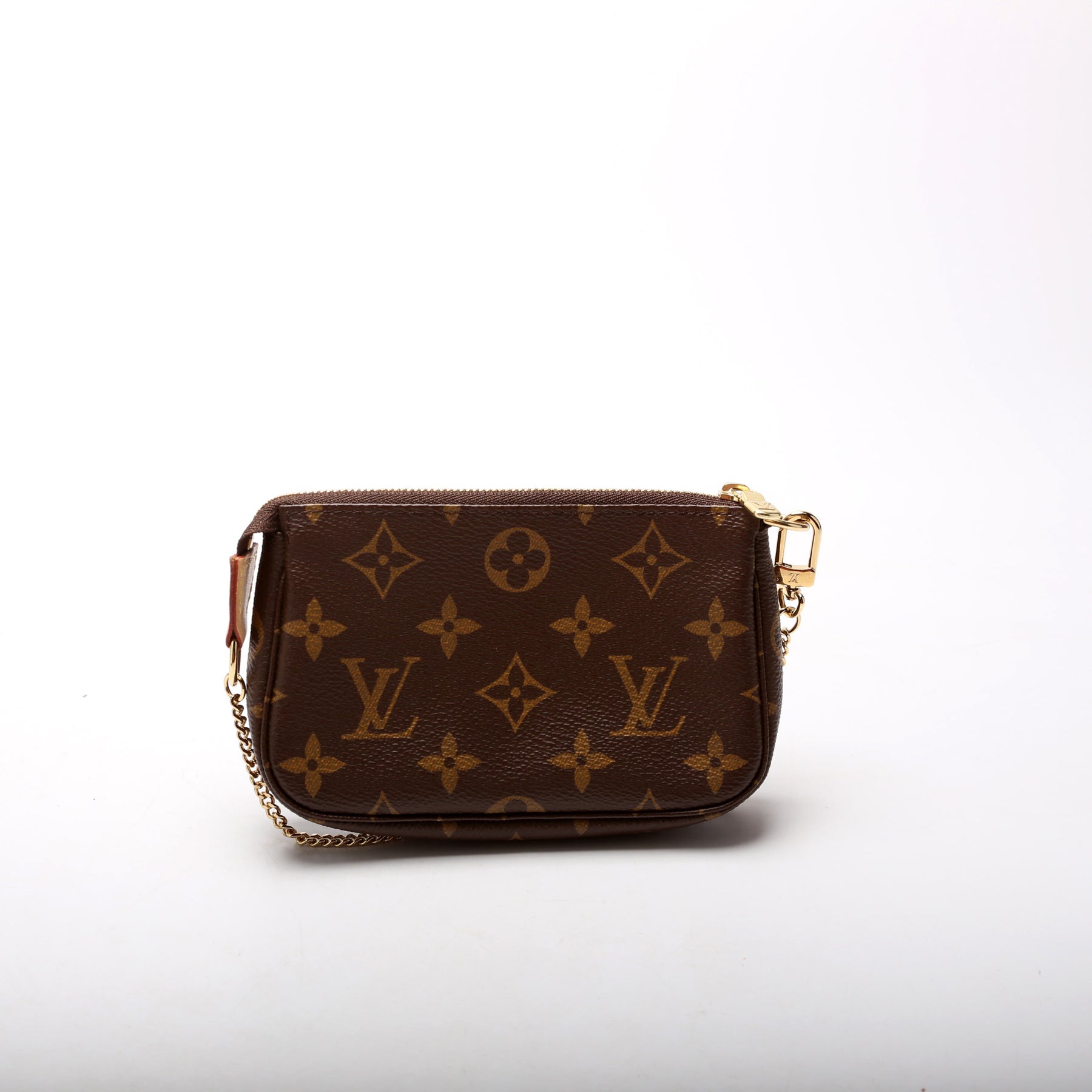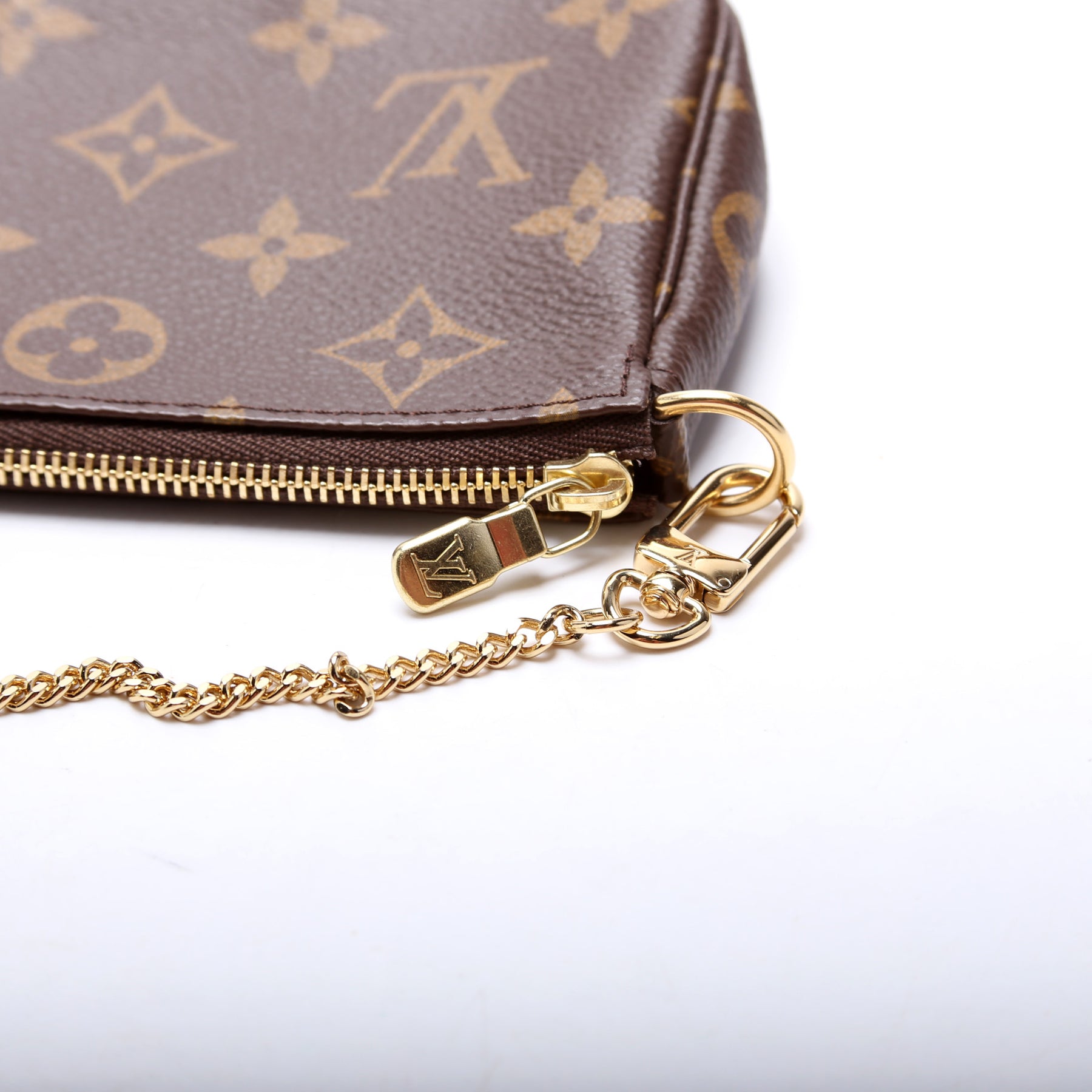 This pre-owned Louis Vuitton Pochette Accessories Mini is guaranteed 100% authentic. The exterior is in the classic Louis Vuitton Monogram coated canvas.